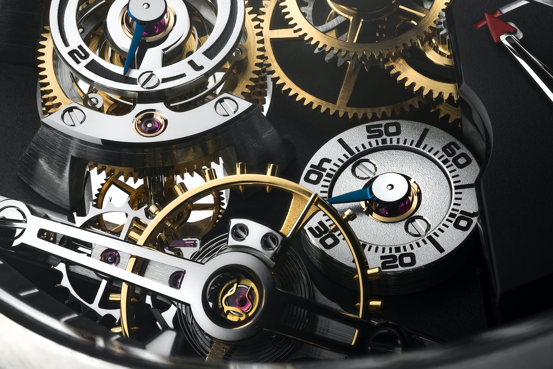 Movement, 38.70mm x 9.46mm, 374 components, running at 21,600 vph in 50 jewels; train jewels olive domed, in gold chatons. Two balances with Phillips terminal (overcoil) curve, variable inertia with gold mean-time screws. Escapement platforms inclined at a 30º angle. Two fast rotating barrels (1 turn in 3.2 hours). Flat black polished steel differential bridge; gold plate with engraved limitation number. Hours, minutes, small seconds, four-minute spherical constant differential rotation indicator; power reserve on a sector.