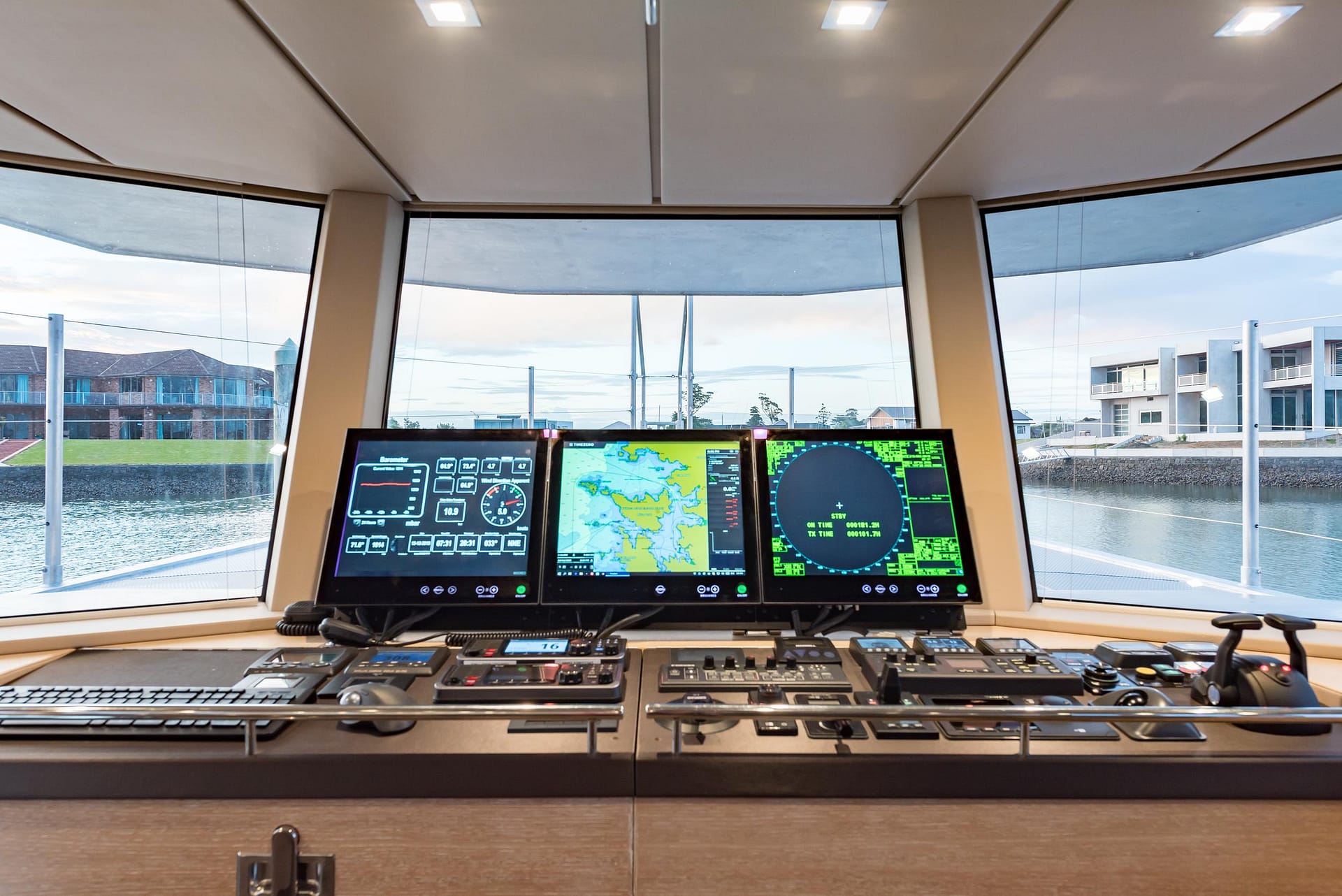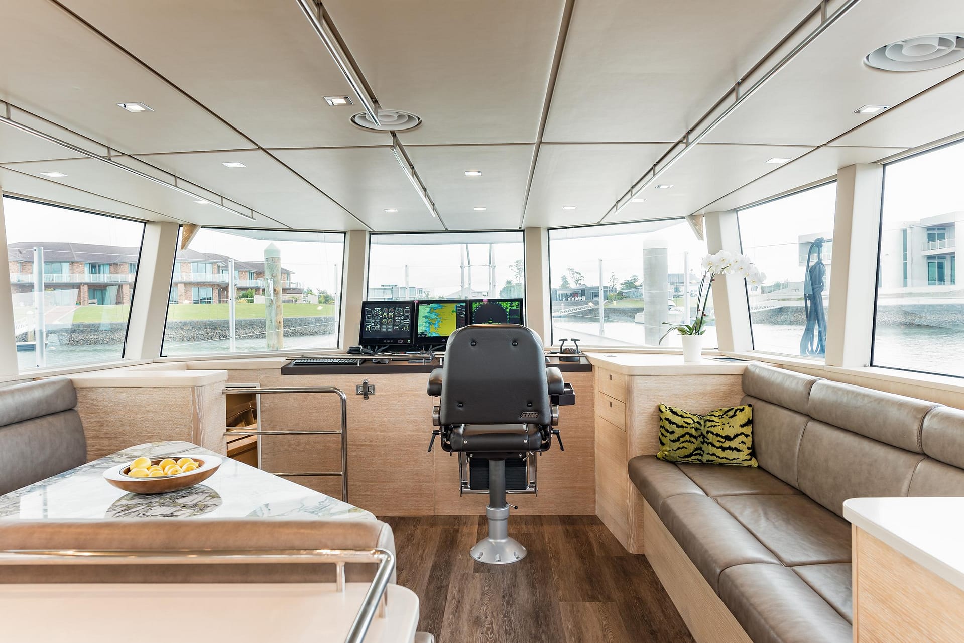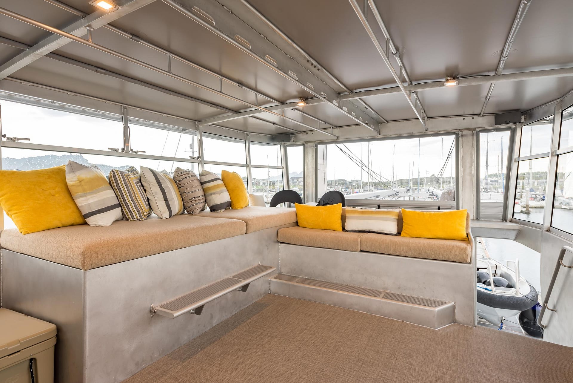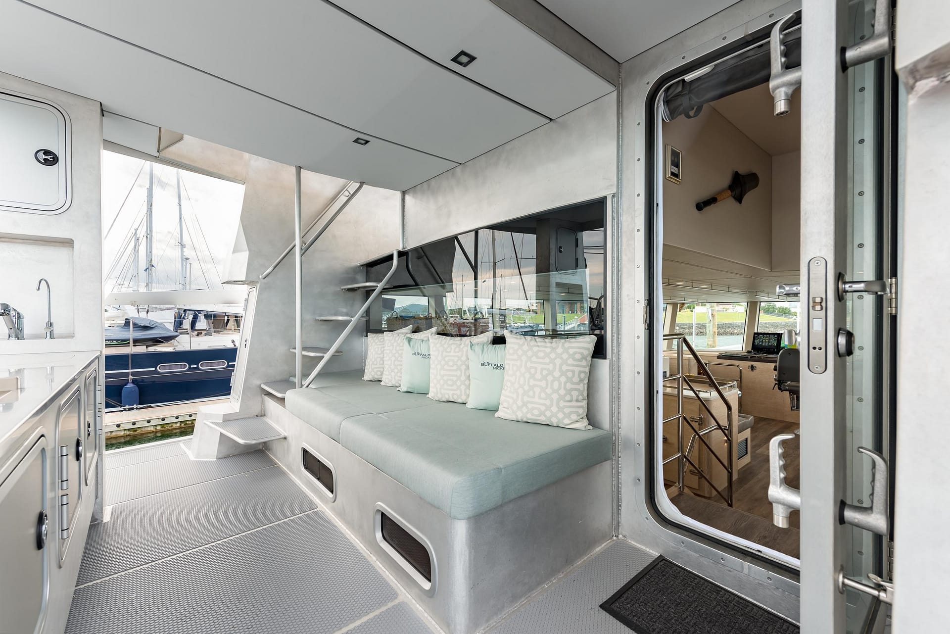 The enclosed bridge deck offers a commanding view of the surroundings with safety glass on three sides. Roll-up clear panels provide ventilation and access to the work deck, mast-mounted equipment, and a 12-solar-panel array. Inside, the bridge deck features an L-shaped serving counter with storage and a sink, as well as cushioned lounging areas for relaxation.