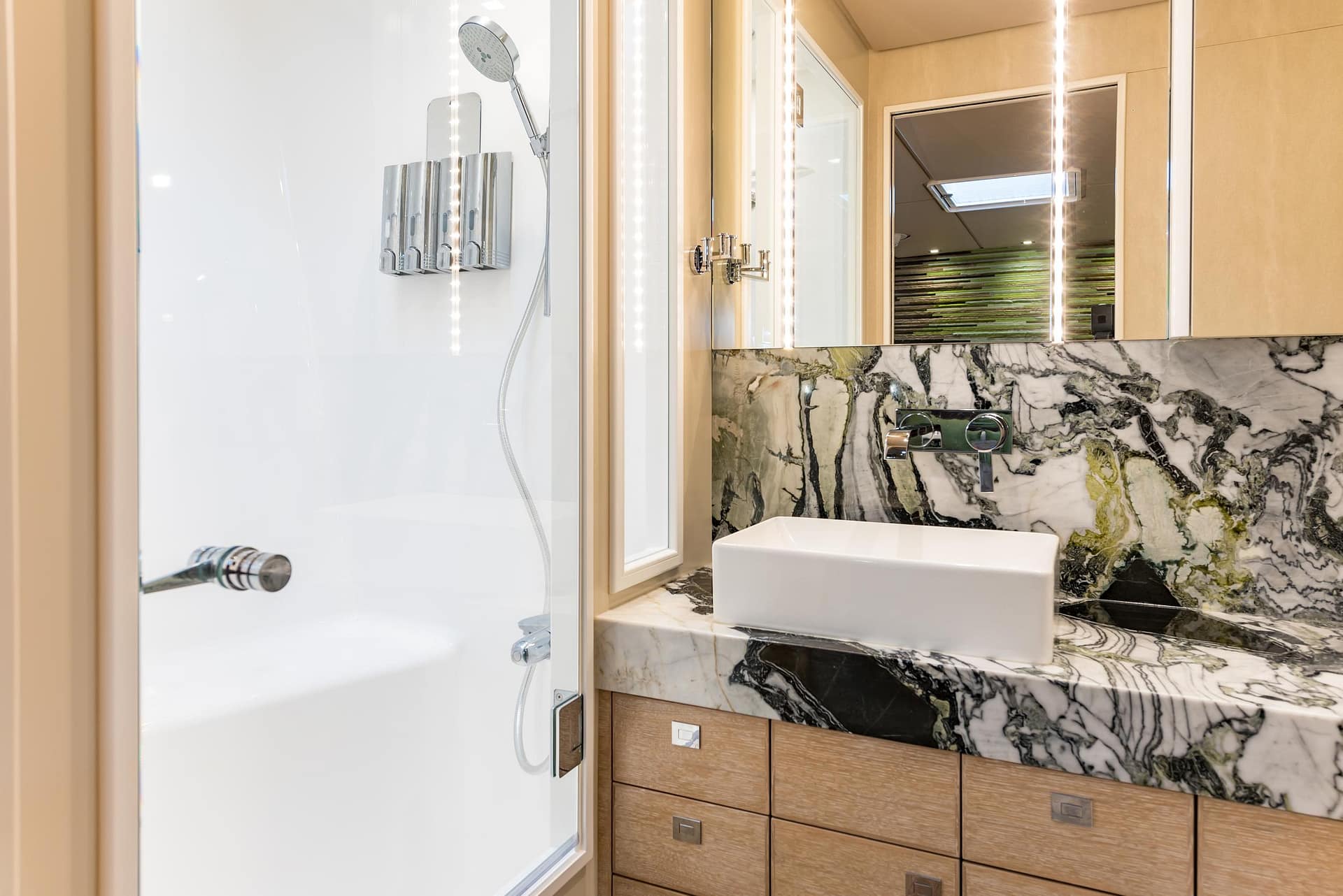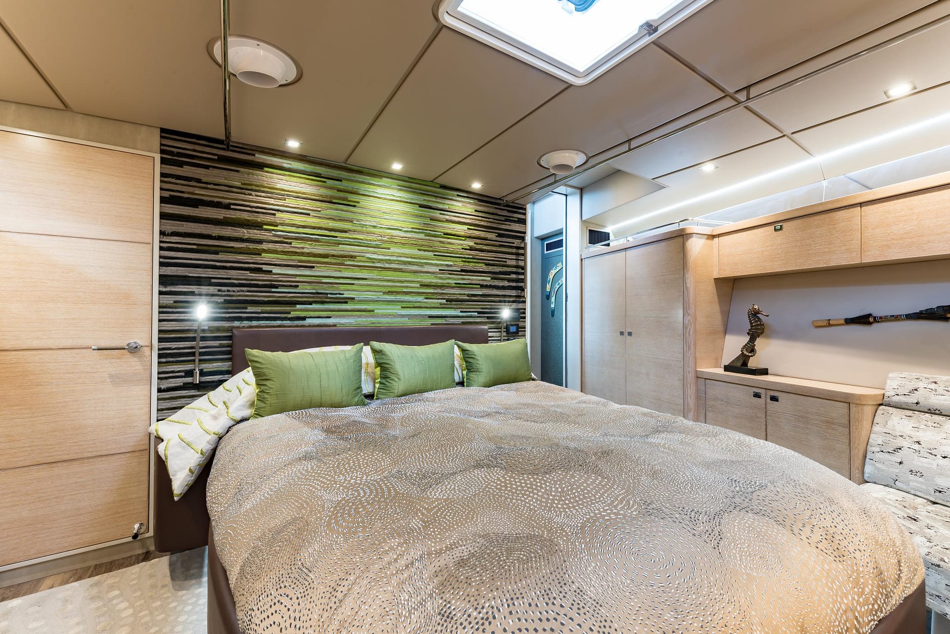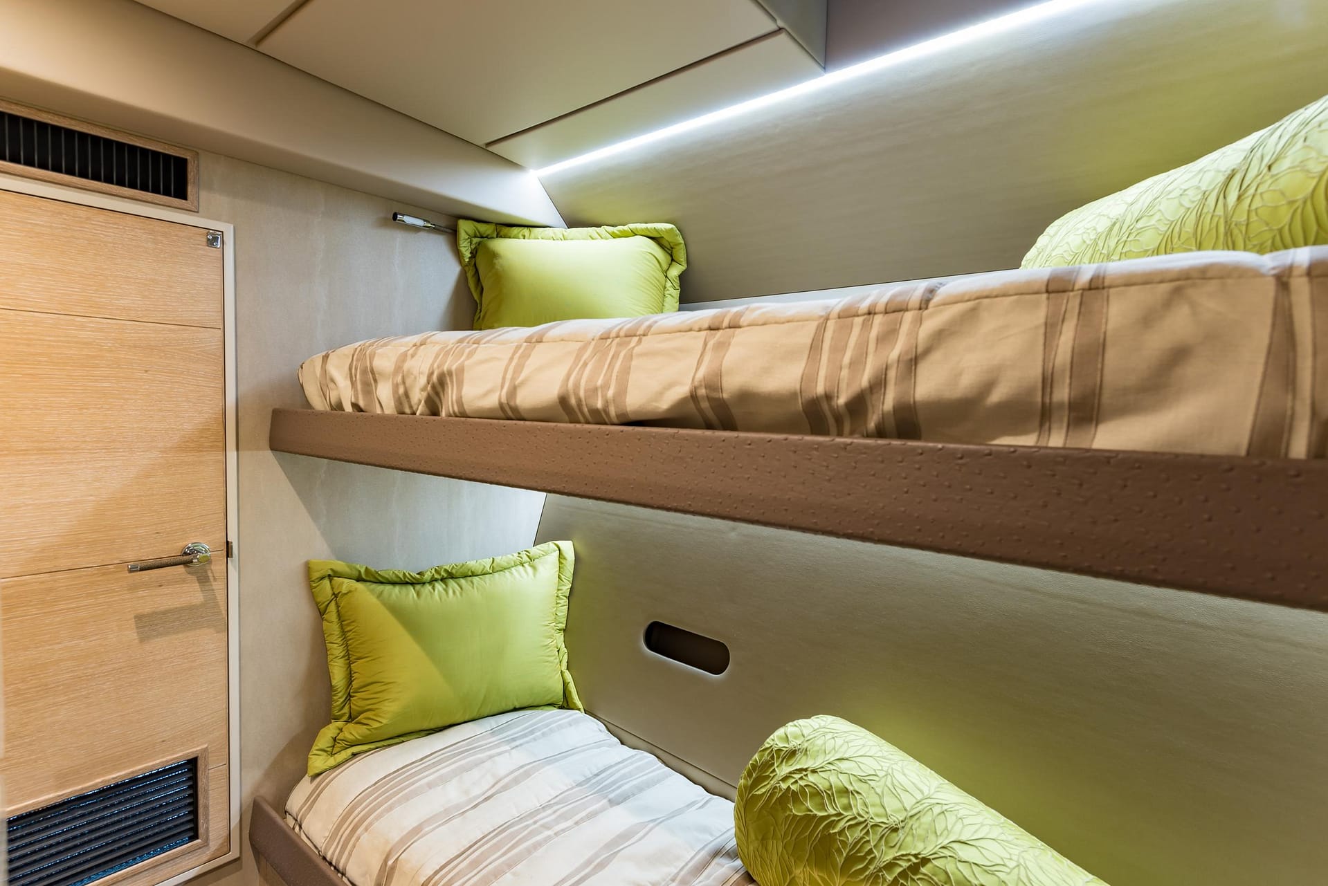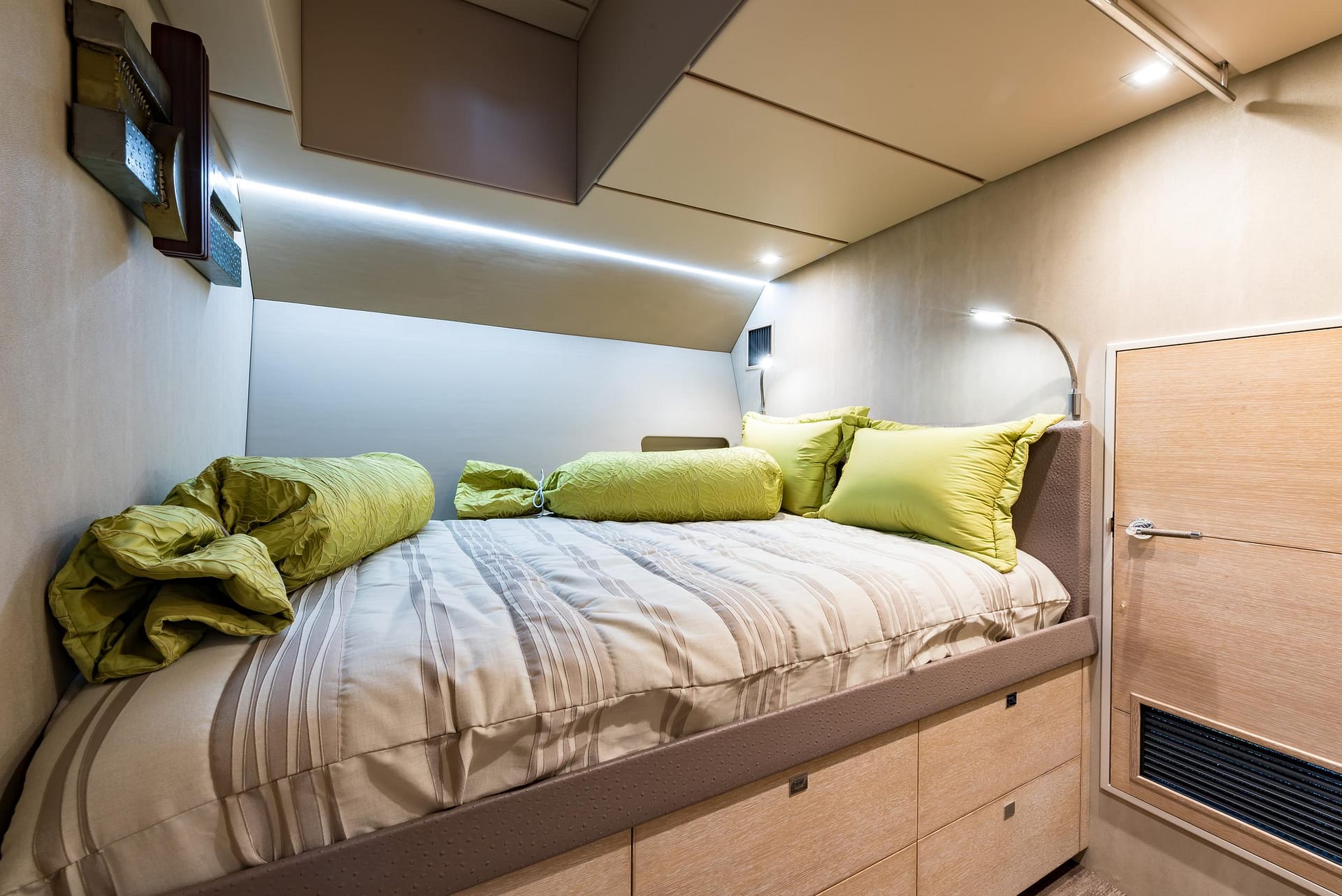 Designed for owner operation, BUFFALO NICKEL offers ample accommodations for guests on the lower deck. The lower deck is thoughtfully laid out, beginning with the Owner’s Stateroom forward. This space features a queen berth on centerline with a leather-wrapped bedframe, an upholstered settee, and marble-topped storage cabinets, a head and shower/tub ensuite, all set against a backdrop of sublime woodwork with light horizontal grain. The adjacent office provides ample outlets and access to yacht systems, while the supplemental refrigeration space offers additional storage with large Sundanzer units. The 2 guest staterooms are located aft and offer a double berth in the portside stateroom and single over/under bunks in the starboard stateroom. Both guest staterooms include ensuite heads and showers, ensuring privacy and comfort for all aboard.