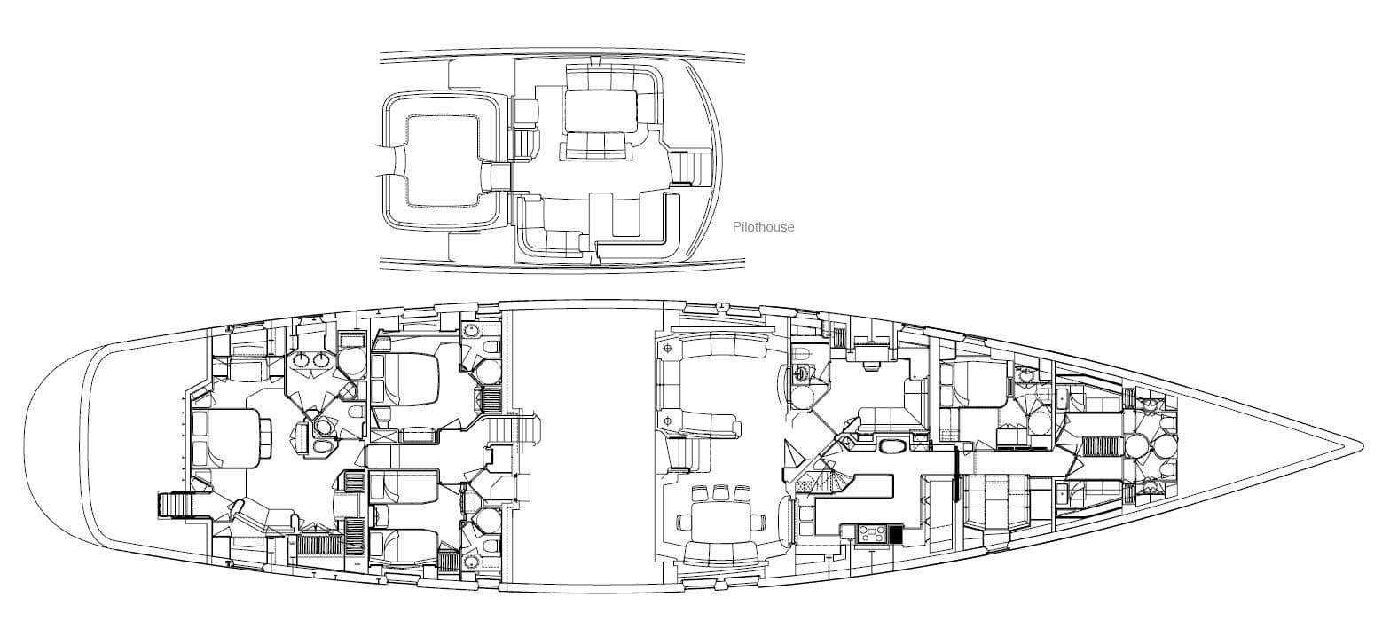 The deckhouse of ANTARES stands out as a highlight, offering 360-degree visibility through large windows and featuring lowering glass panels that connect the area to the central cockpit. Adorned with teak joinery, the deckhouse boasts spacious seating areas, including large sofas and a convertible dining table for 12 guests. Adjacent, the yacht’s internal navigation and communication center facilitate seamless operation. Descending from the deckhouse, a large saloon and dining area provide spaces for relaxation and productivity, with a focus on family comfort and creativity.