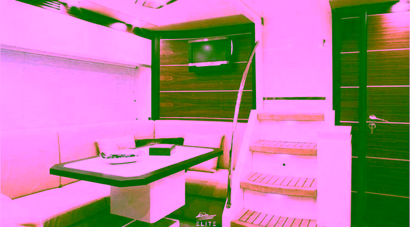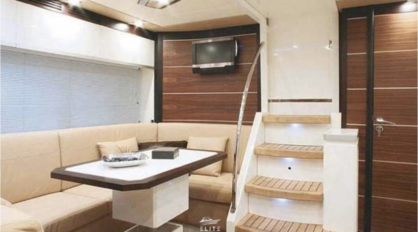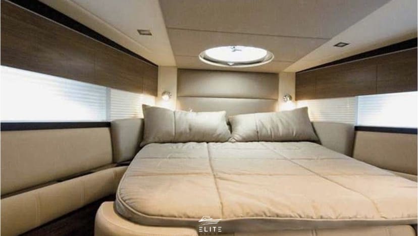 Powered by twin Volvo Penta 350hp engines, it delivers a smooth and powerful ride. The charter includes a professional skipper, final cleaning, and water toys such as a paddle surfboard, various floaties, and a dinghy for easy disembarkation along the route. A €500 deposit is required, and you can extend your experience until sunset for an additional €250.