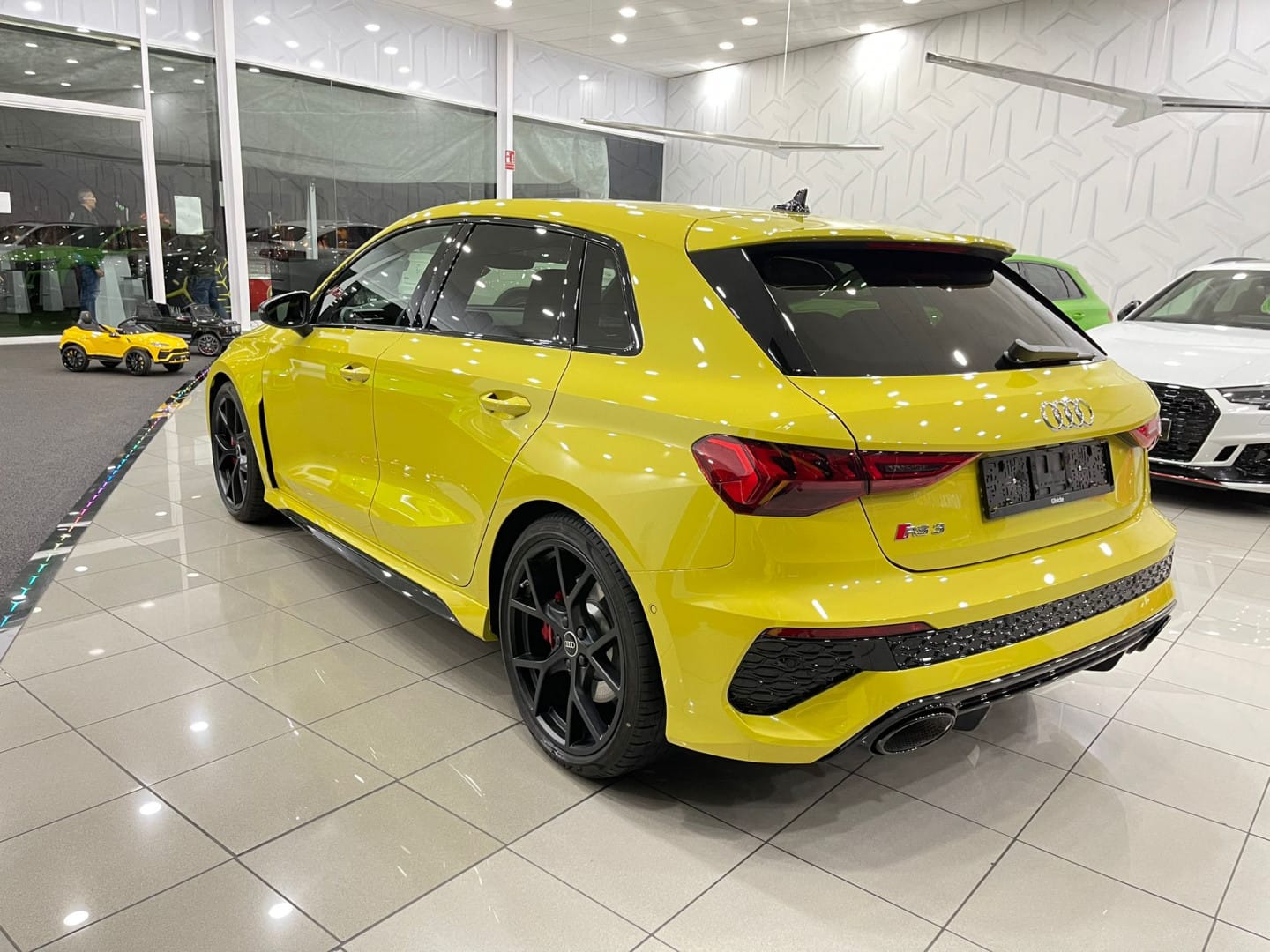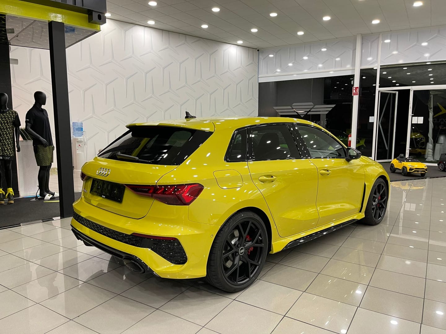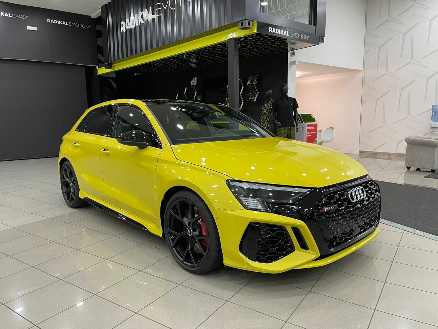 ¡Increíble Audi RS3 SPORTBACK amarillo nuevo a estrenar en las instalaciones de Radikal Cars! Equipamiento: Nuevo a estrenar Garantía oficial Audi 2022 Cuero napa fina con grabado RS y pespunte de nido de abeja Volante de cuero de 3 radios con multifunción plus y levas de cambio Asientos delanteros regulables eléctricamente asientos con calefacción en la parte delantera Retrovisor interior antideslumbrante automático, sin marco Soporte lumbar de 4 vías para los asientos delanteros