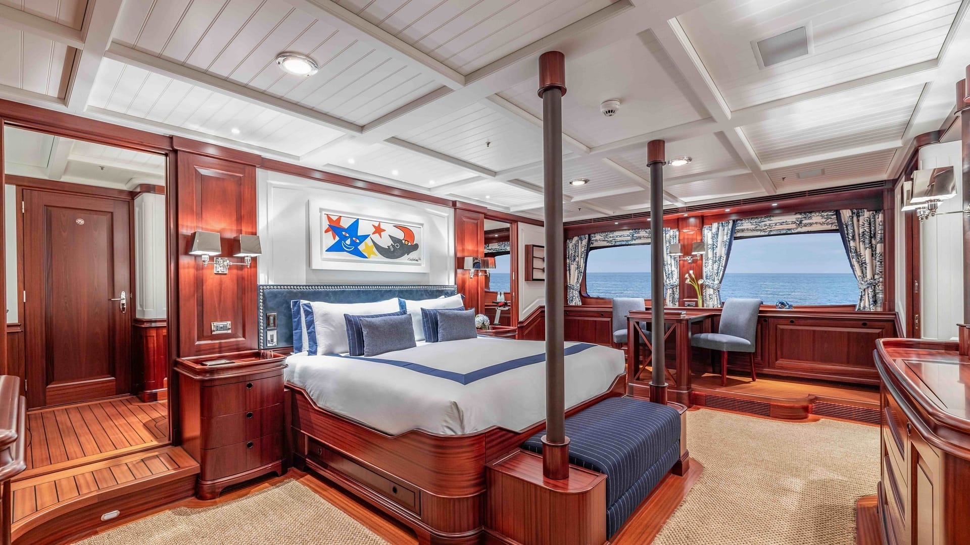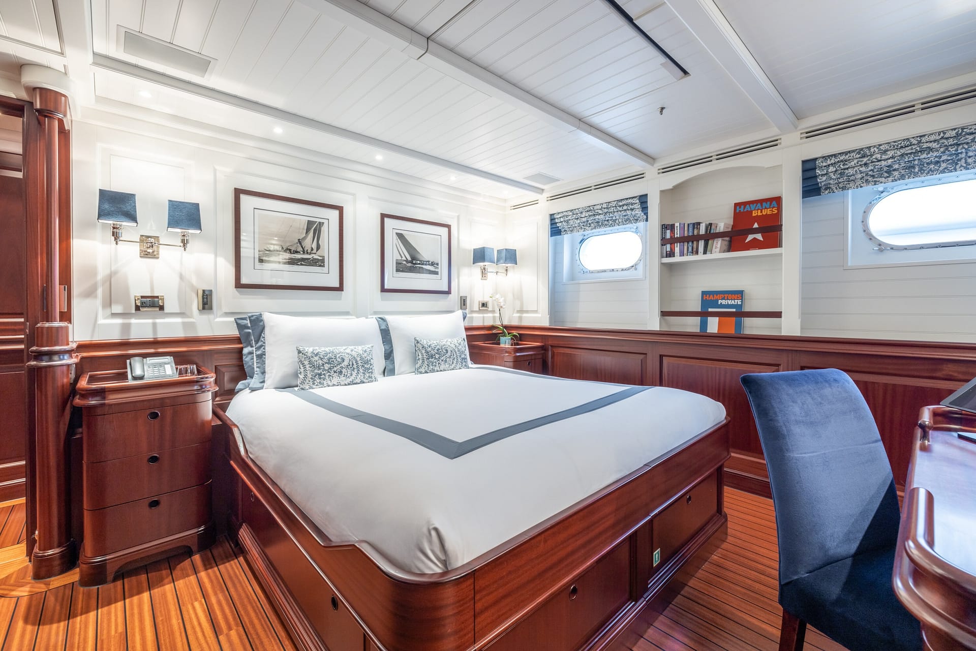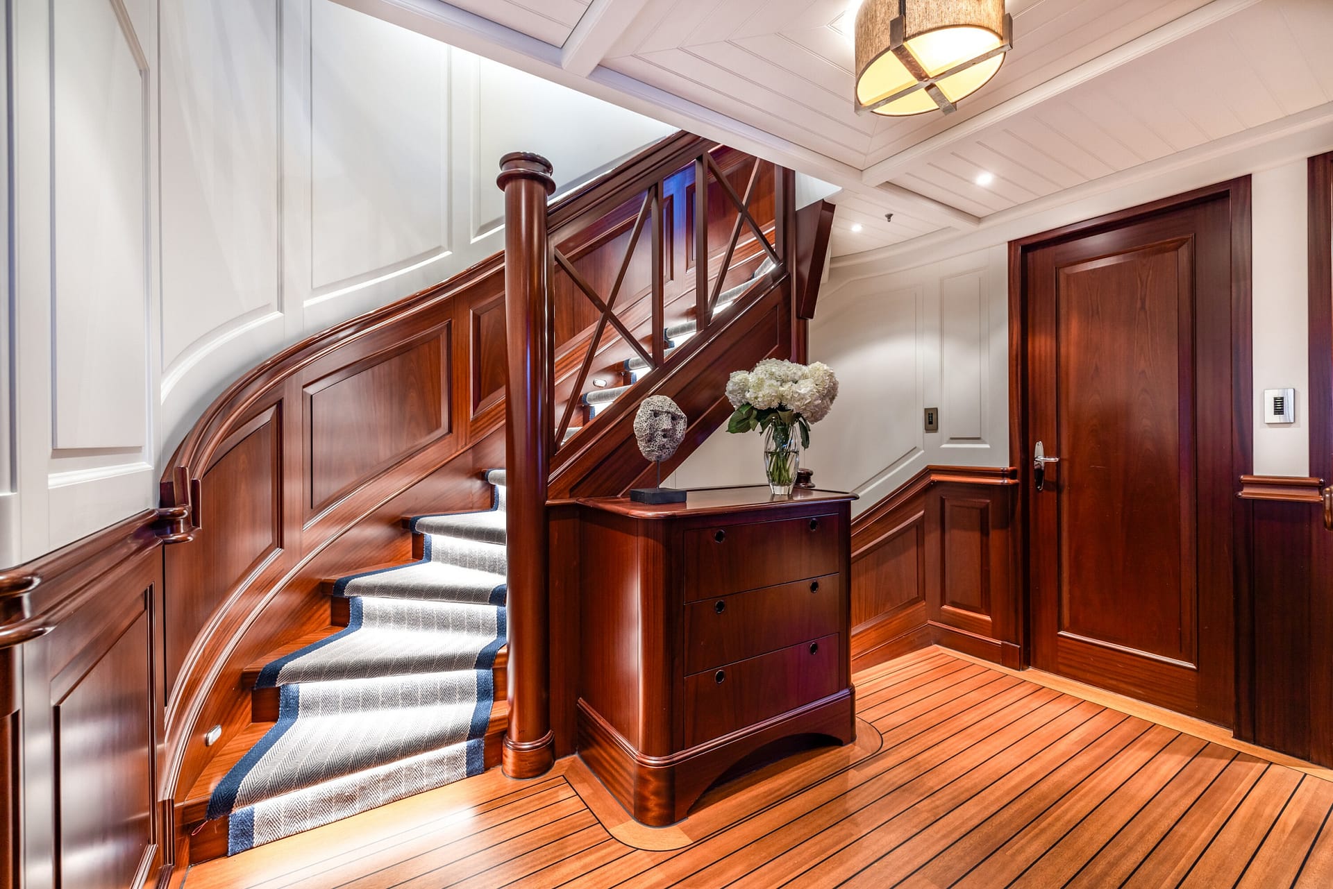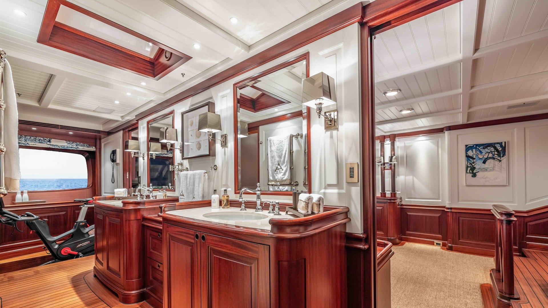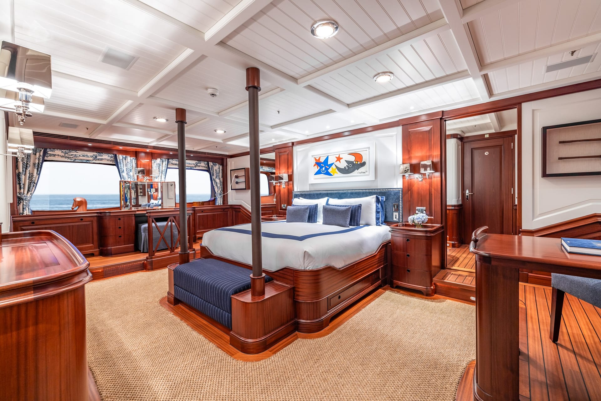 Larger than normal for a 45m, her layout makes the most of her 499 GT. All five staterooms are really spacious with en-suite bathrooms and the full-beam master suite, accessed via a private study, has 2.30m headroom. She sleeps up to 14 guests and accommodates 9 crew.