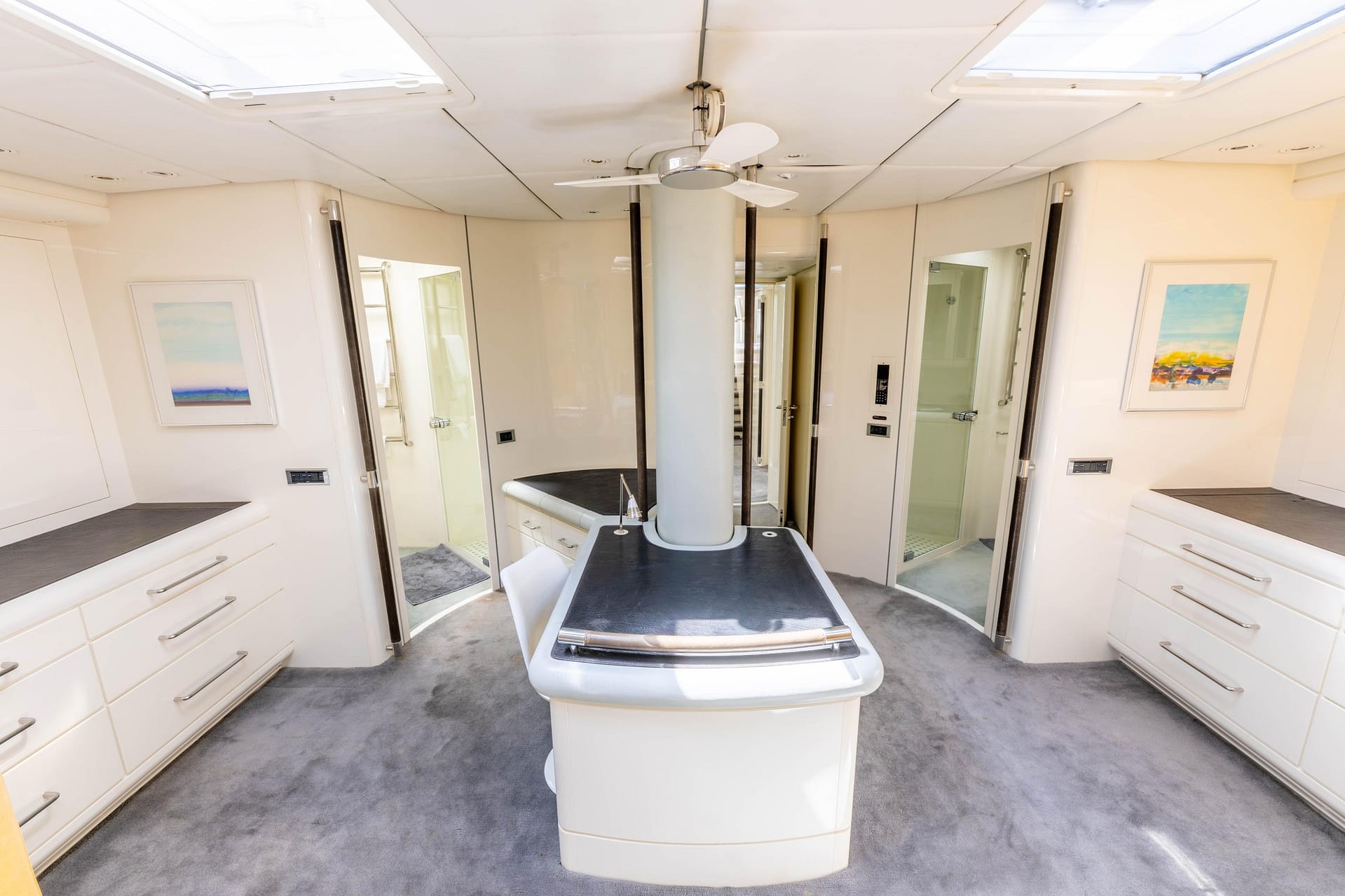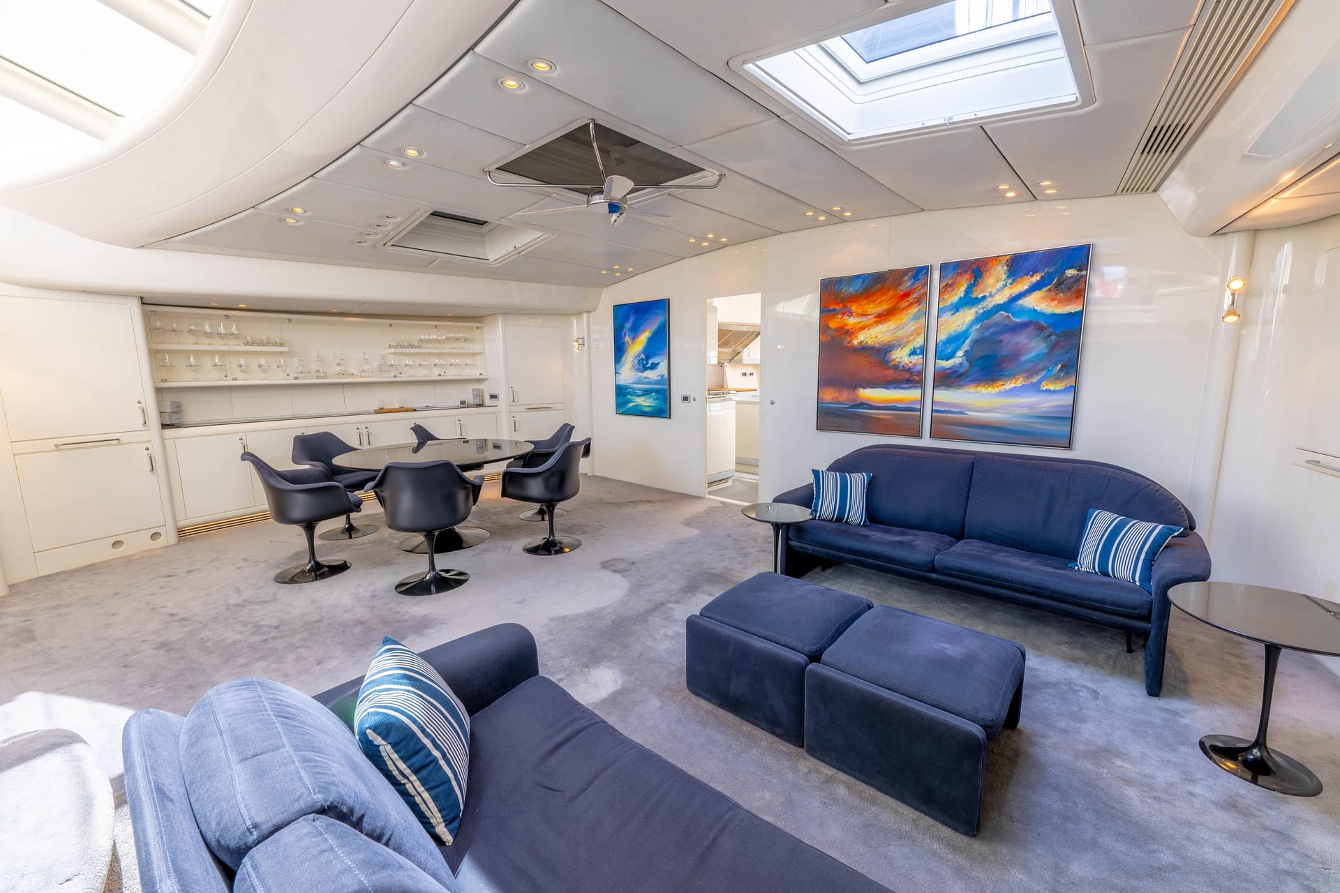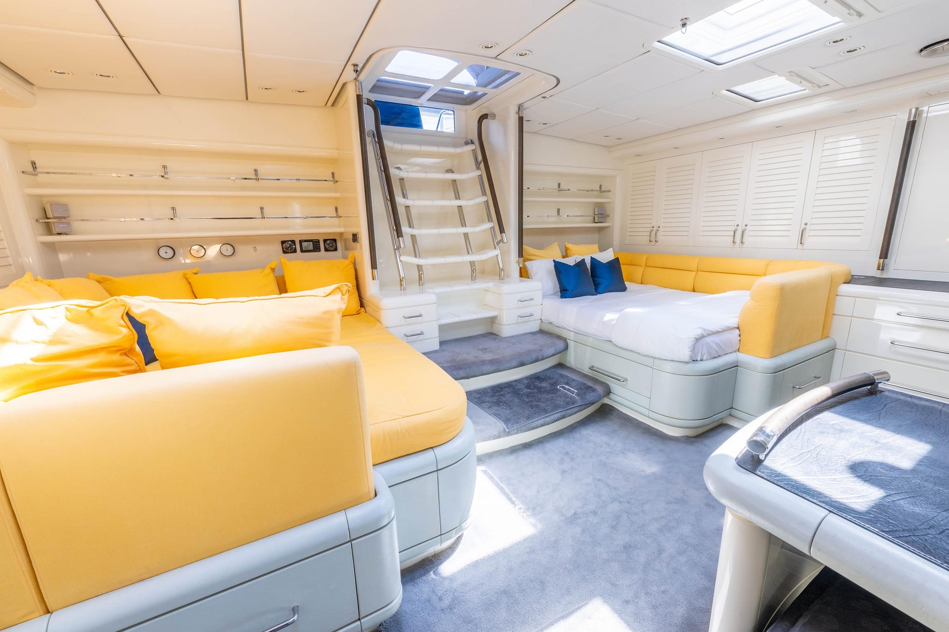 With a gross tonnage of 210 GT, she offers remarkable volume for a yacht of her size. Her high-gloss, wood-free interior offers a light-filled ambiance, accommodating up to 10 guests across three staterooms. The layout includes a full-beam Owner’s Suite and two guest staterooms. Crew quarters for five ensure smooth operations and excellent service.