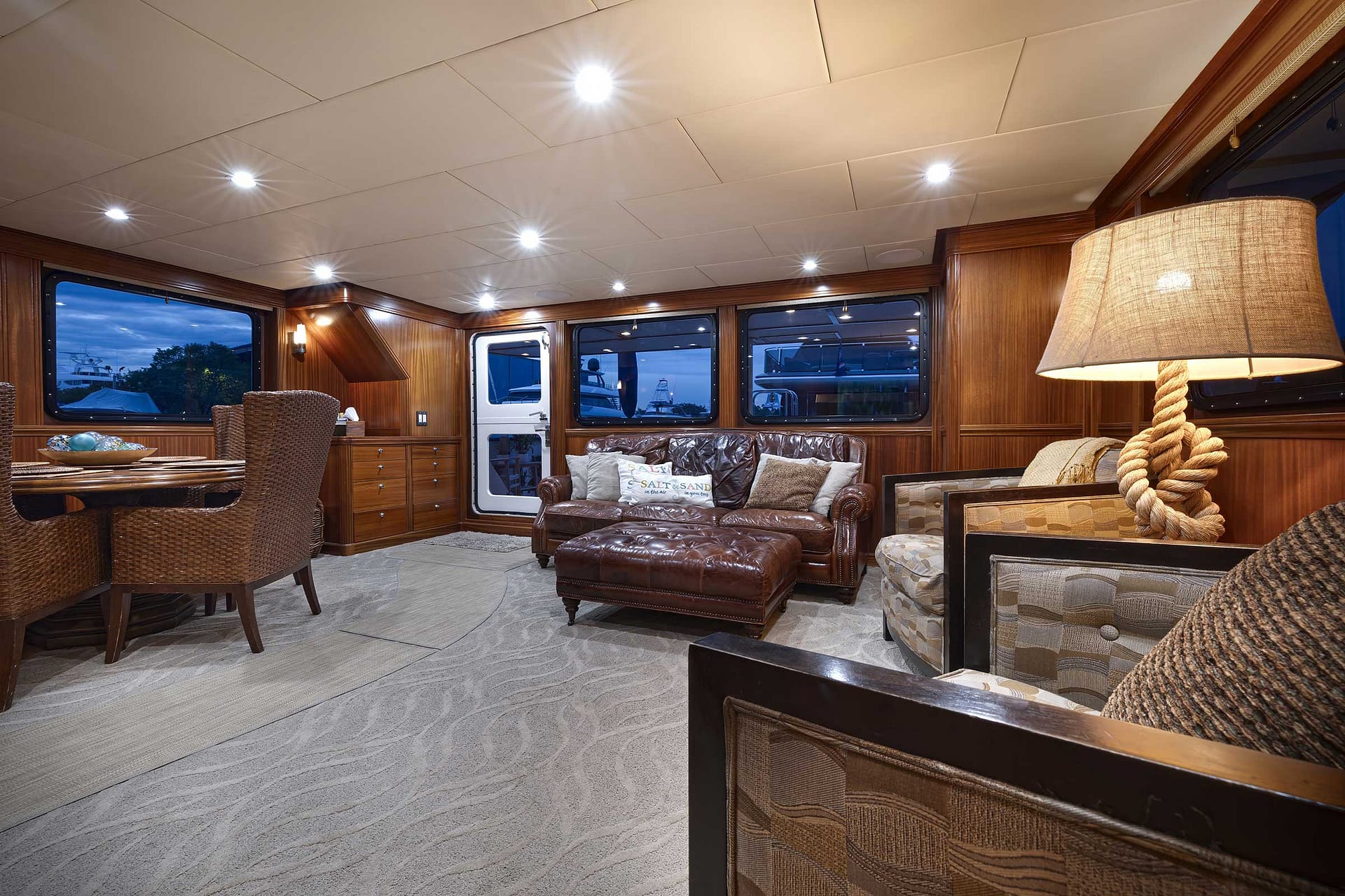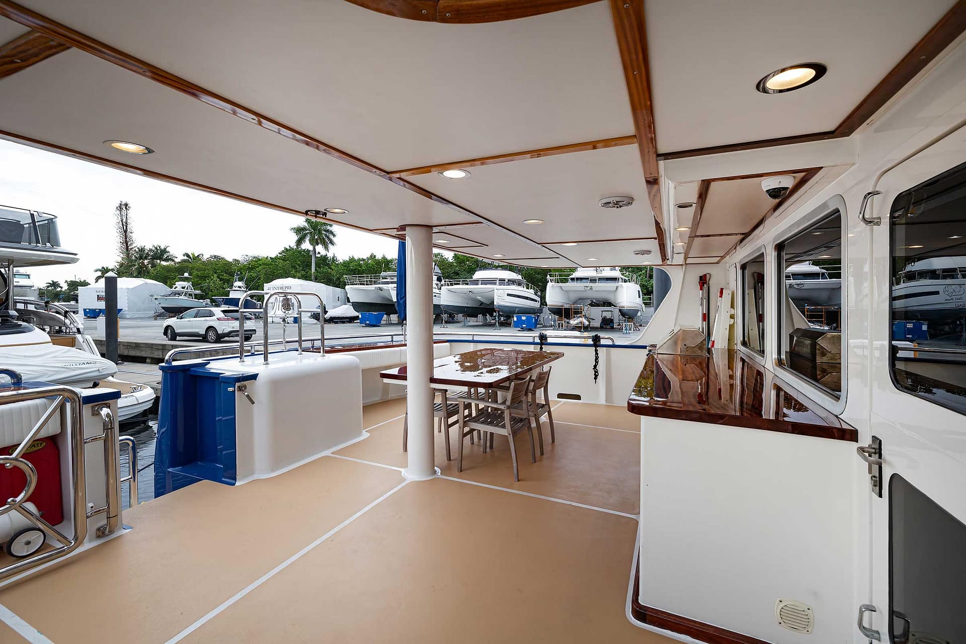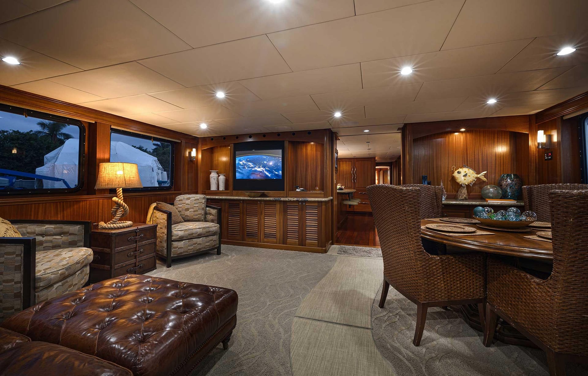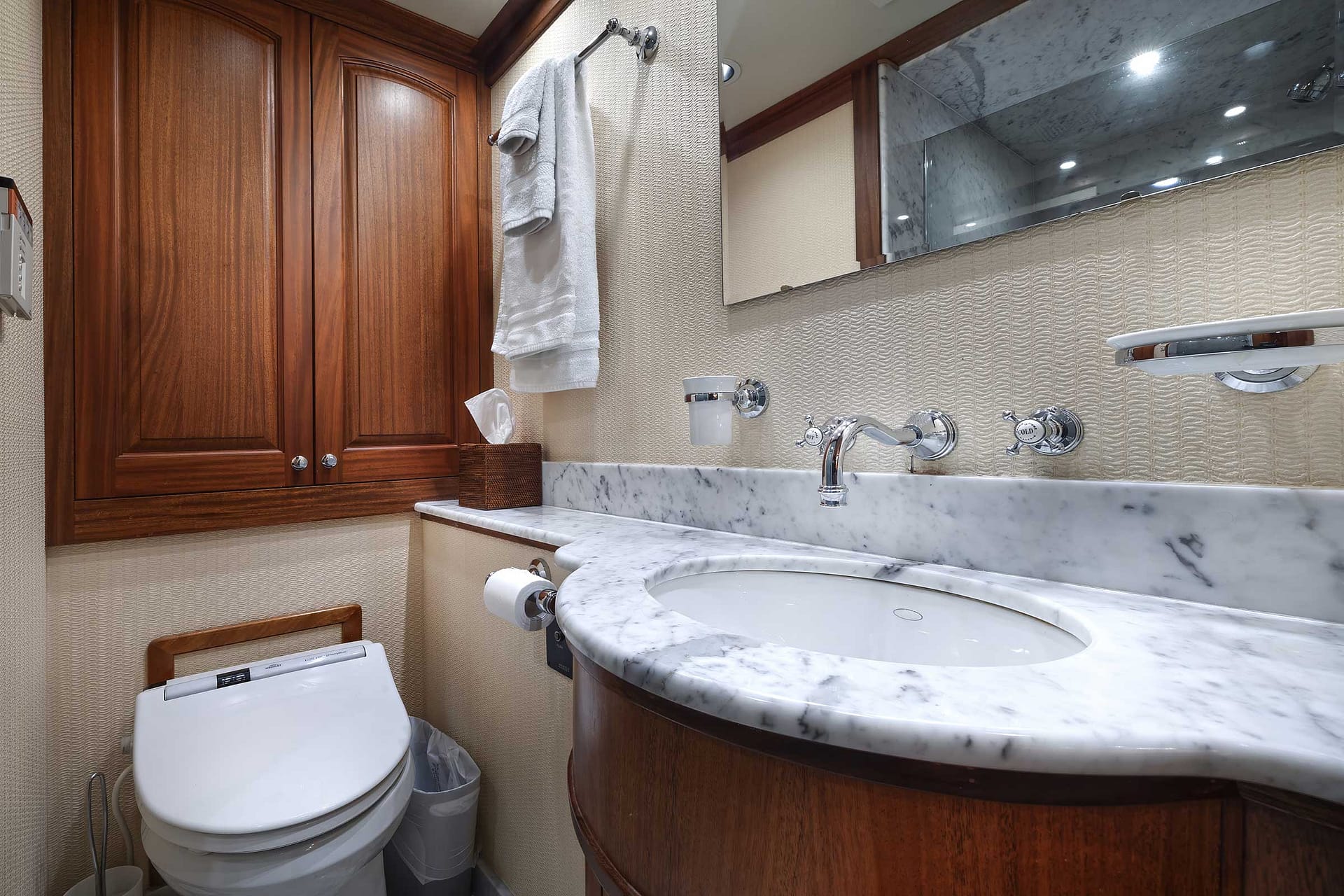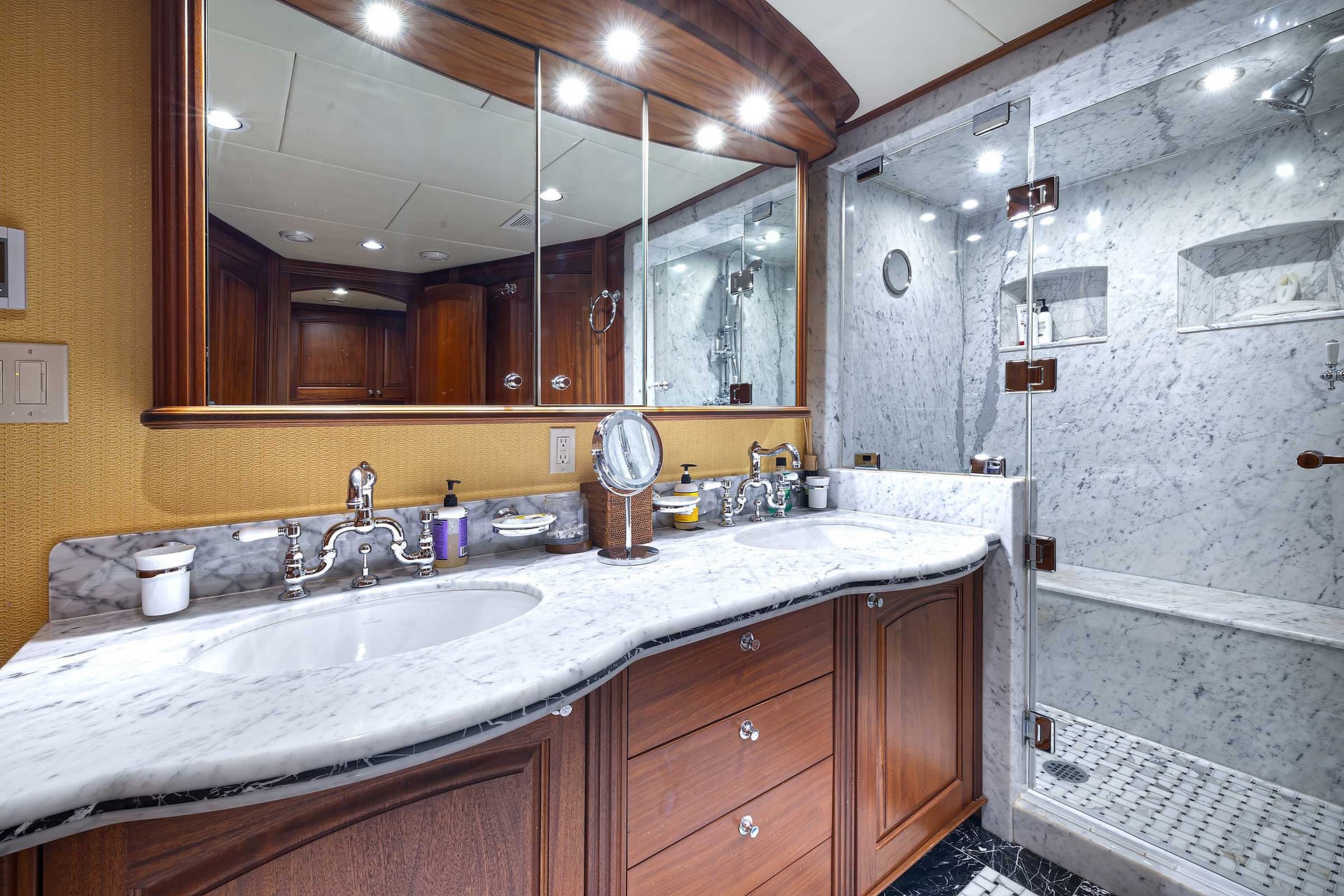 Designed for long voyages, D’NICE offers an expansive layout with six staterooms and seven heads, providing ample space for guests and crew. The salon features a leather seating area, entertainment center, and dining space for six. The galley is a chef’s dream with commercial freezers, a large pantry, and a built-in dinette. The Owner’s Stateroom, located at the forward end of the yacht, offers a private retreat with a king-size bed, office space, reading nook, and marble bathroom, creating an ideal space for relaxation and privacy.