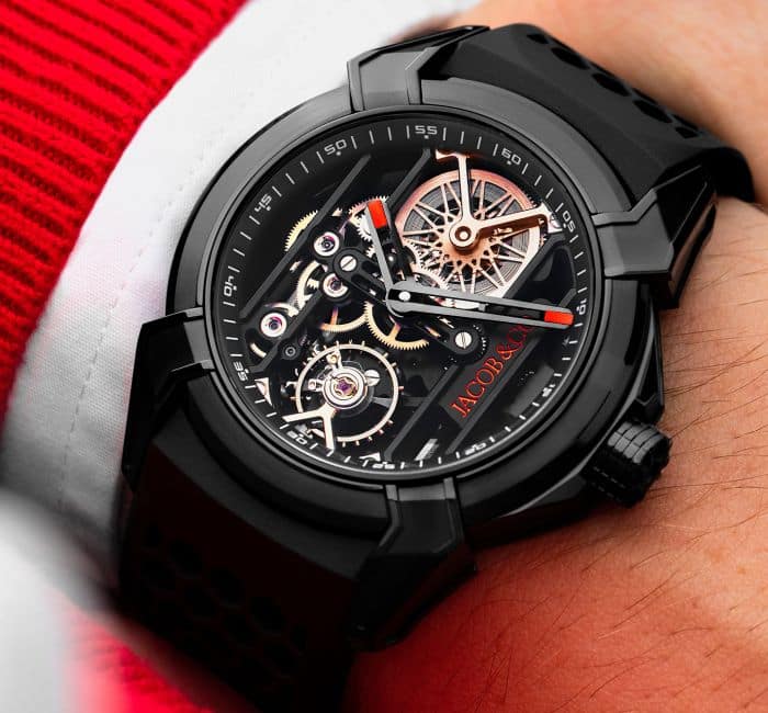 Movement: Caliber: Exclusive Manually Wound Skeleton Jacob&Co JCAM02 Caliber; Barrel and Balance Wheel Vertically Aligned; Diameter: 6ΒΌ”’ i.e. 14.25mm; Height: 5.90mm; Components: 158; Functions: Hours, Minutes; Power Reserve: 48-Hours; Frequency: 28’800 vib/h (4 Hz); Jewels: 21; System: Barrel with Sliding Clamp System; Balance Screws Visible on the Front Side; Time Setting Spring with Three Functions (“octopus spring”): Ratchet, Lever and Setting Lever; Anti-shock.