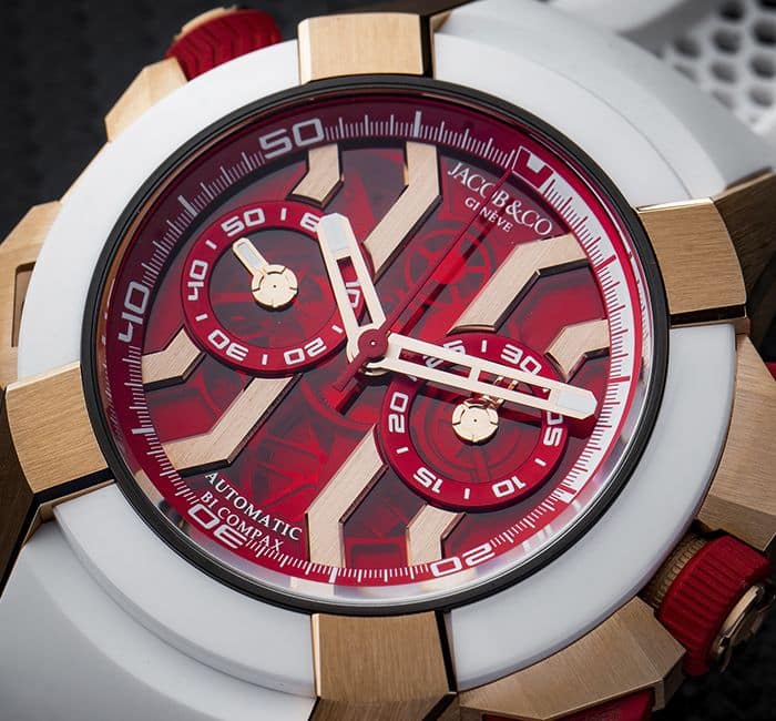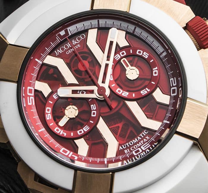 MOVEMENT: Exclusive Skeleton Bi-Compax Chronograph Self- Winding Jacob&Co JCAA05; Diameter: 30.40mm; Height: 8.40mm; Components: 260; Power Reserve: 48-Hours; Frequency: 28’800 vib/h (4 Hz); Jewels: 27; System: Column-Wheel Balance Screws; Anti-shock; Finishing: Polished Movement Bridges; Open Barrel; Column-Wheel finishes: Angled, Polished and Drawn; Anthracite Rotor with Red Lacquered Engraving “Jacob & Co GeneÌ€ve”, Circular Grained Bridges.