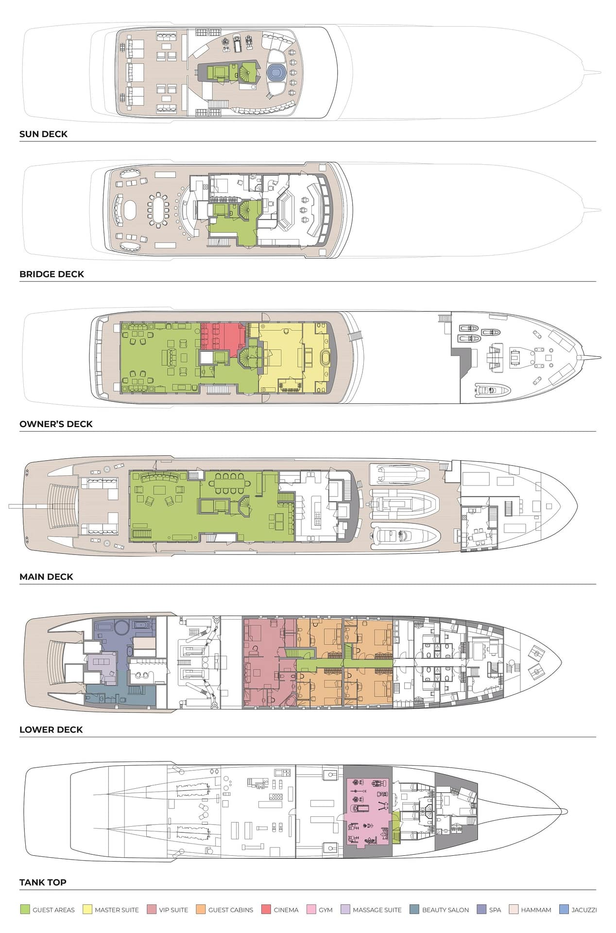 With exterior lines by H2 Design, FORCE BLUE offers generous deck spaces and versatile entertainment areas. Notable features onboard include a professional DJ station and dazzling disco lighting on the bridge deck, capable of accommodating up to 60 guests. For movie enthusiasts and gamers, a state-of-the-art cinema with seating for seven is also available on the Owner’s deck. Additionally, FORCE BLUE boasts a remarkable sea-level lounging and sunbathing area, complete with an extended swim platform that transforms into a beach club. An expansive spa, including a steam shower, Hammam, mud bath, sauna, and hydro massage hot tub as well as a fully equipped gym are available on the lower deck. Notably, two spacious tenders are also available.