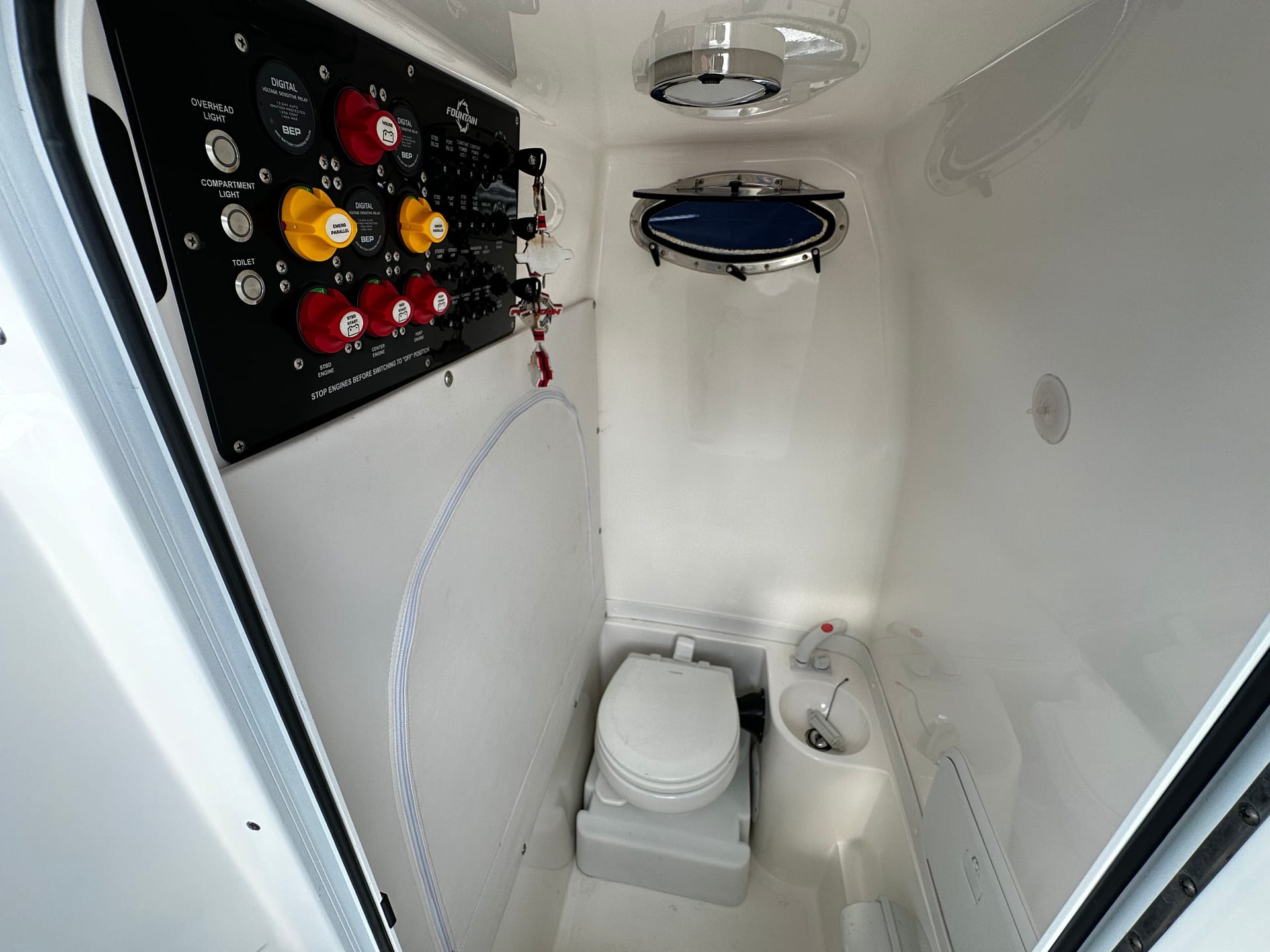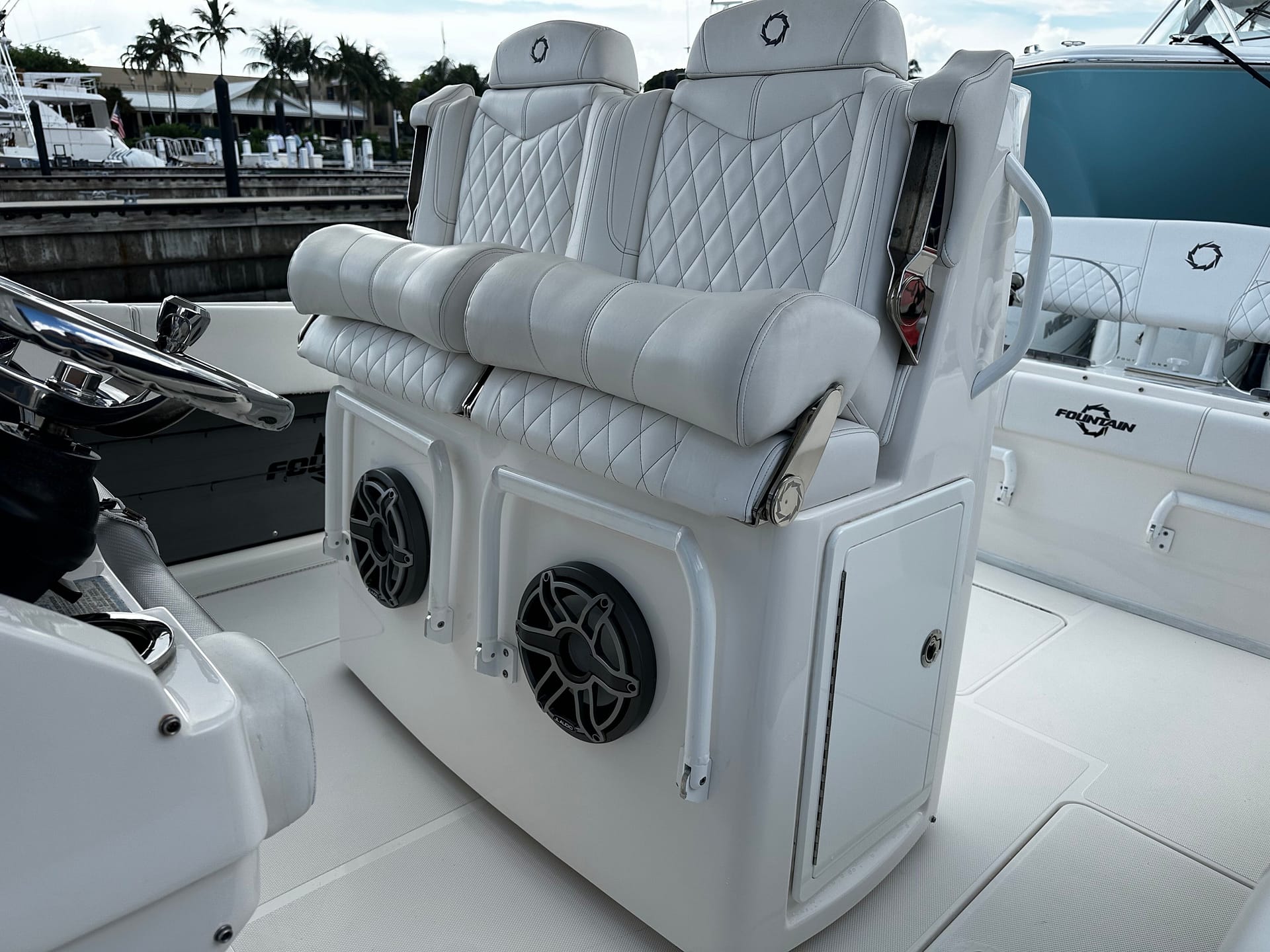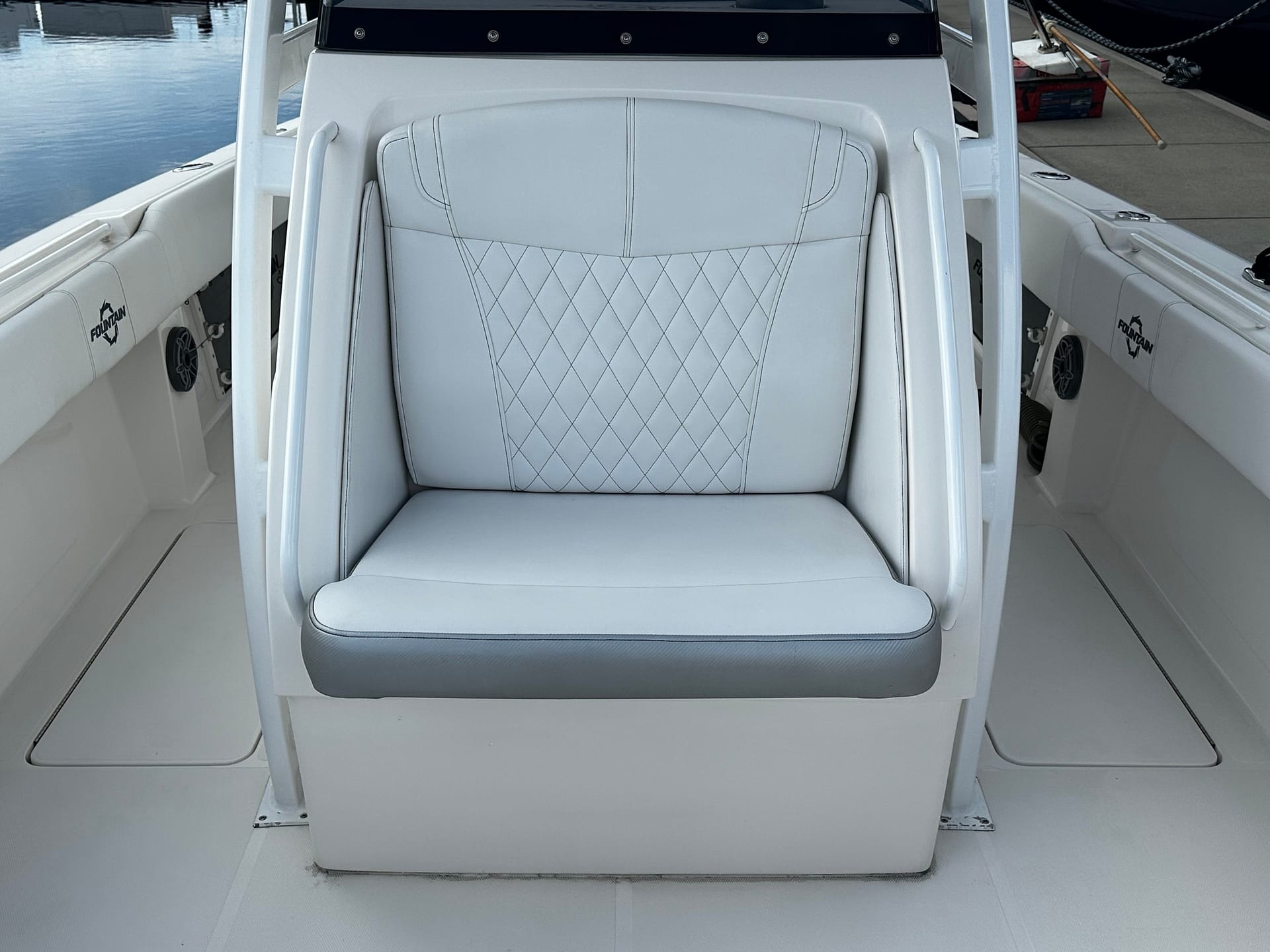 With a sleek carolina blue fiberglass hull with white accents, the FOUNTAIN 34 CC consitently turn heads with her stunning design.
