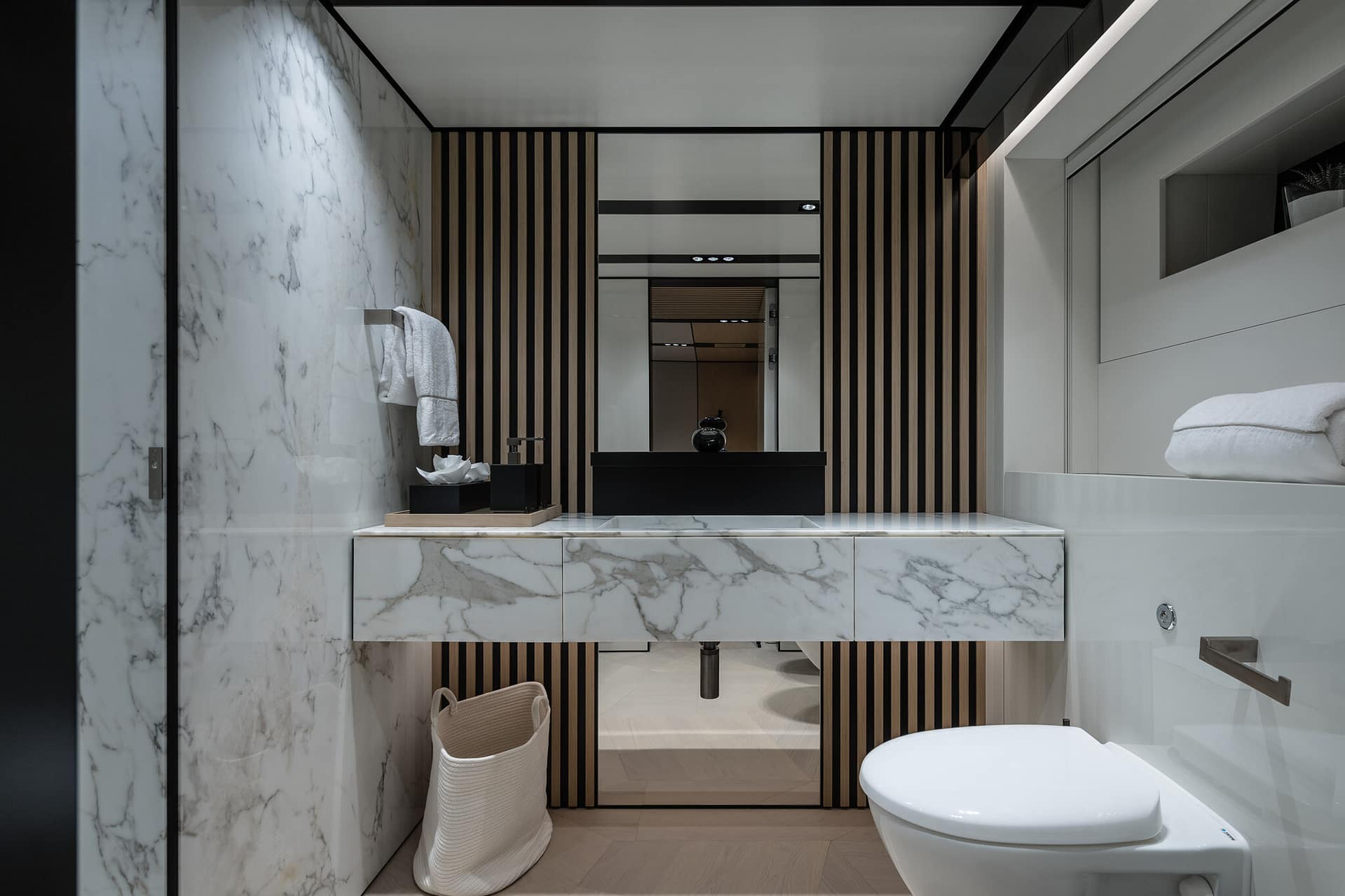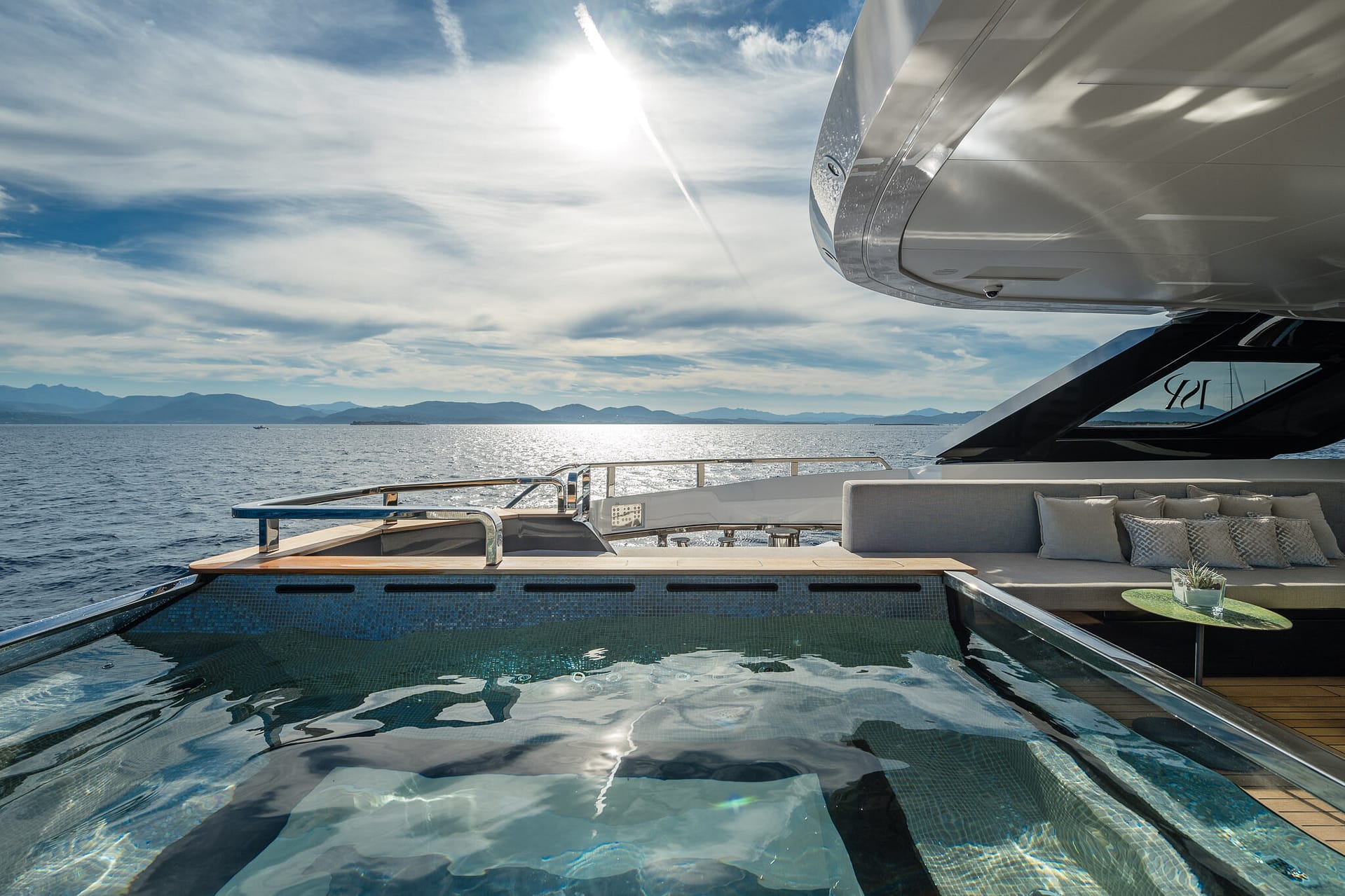 On the lower deck, enjoy the beach club, where a vast swim platform invites you to dive into the crystal-clear waters or simply soak up the sun. Additionally, a transversely located tender garage ensures seamless embarkation and disembarkation.