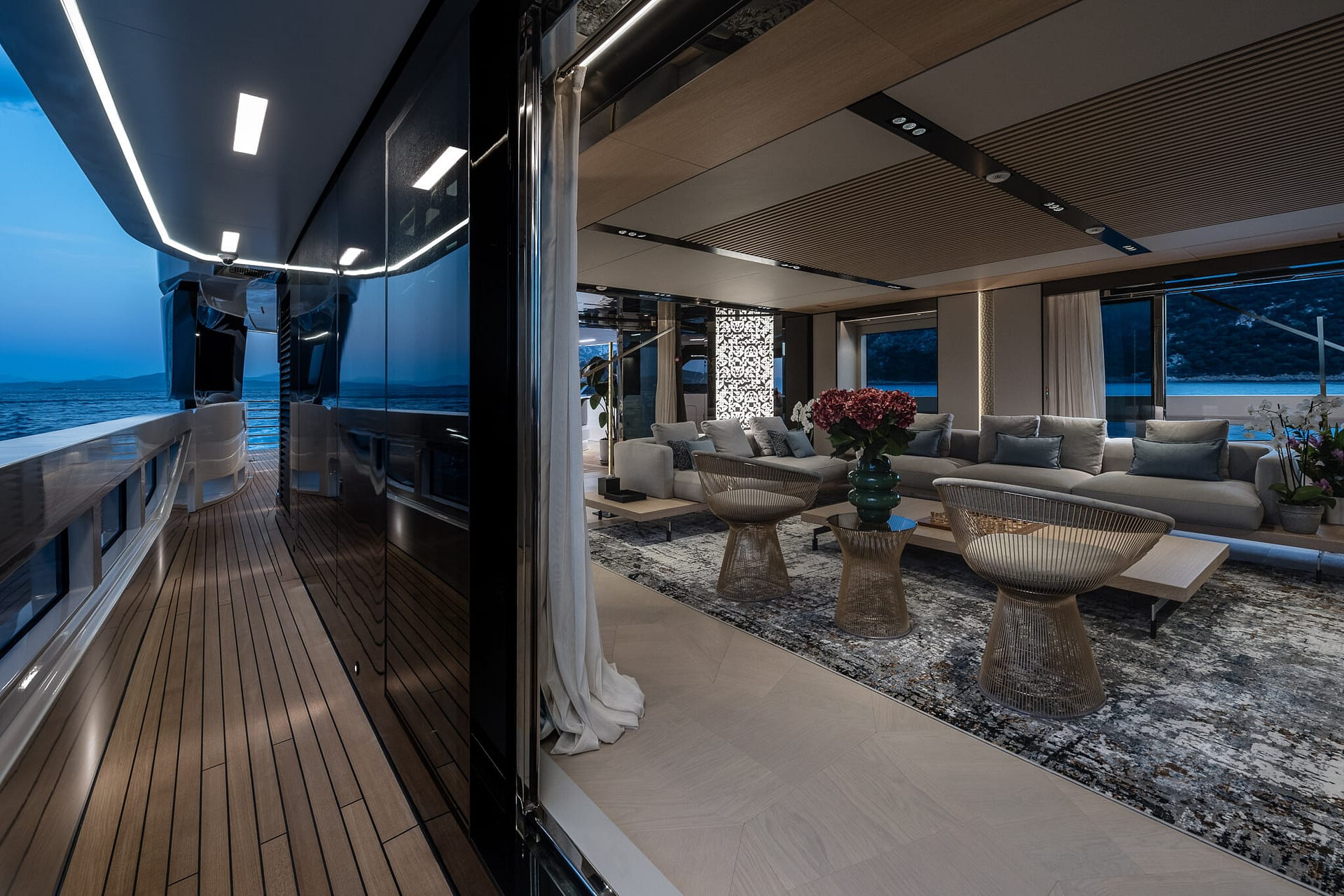 Upon stepping onto the main deck, guests are greeted by a jacuzzi and a rounded lounge area, offering a serene retreat for relaxation. Meanwhile, the main salon offers a sophisticated ambience for entertaining in style.