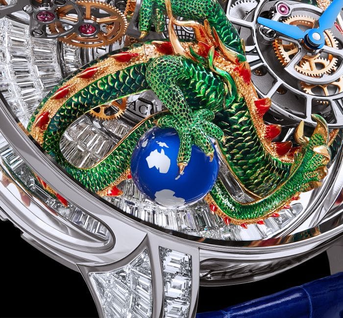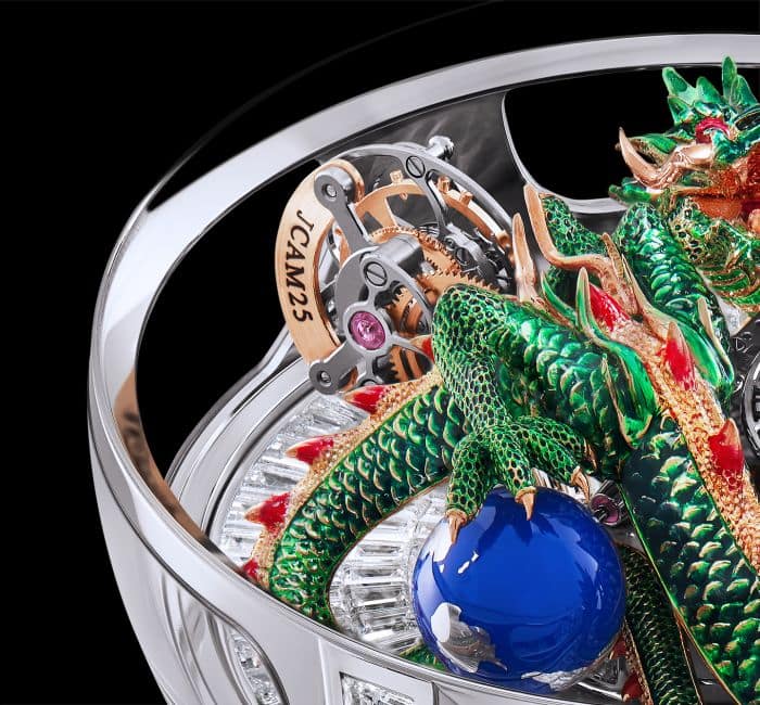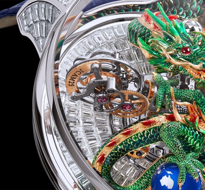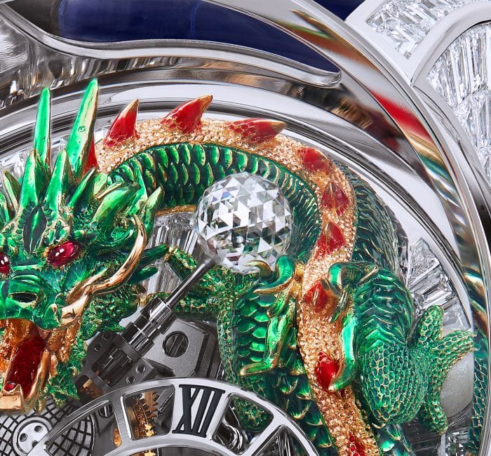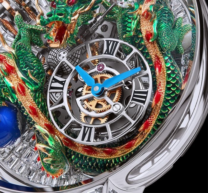 A sculpted, hand-engraved 18K rose gold dragon in the case