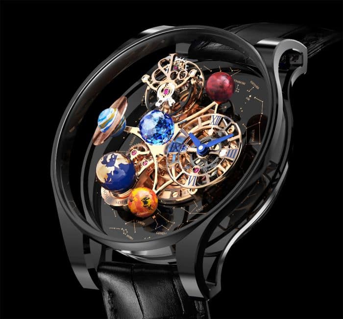 Blue Topaz Jacob cut® (288 facets; ≈ 1.5cts) on top of the movement. Black titanium base with constellations rotates counter-clockwise 360 degrees in 10 minutes. Frame carrying 3 hand-painted planets.