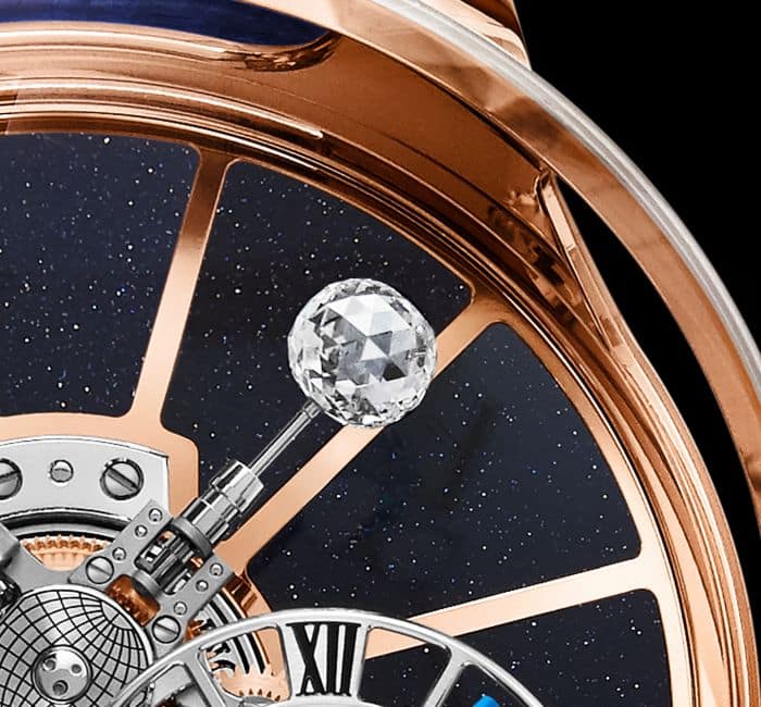 CASE: 50mm; thickness: 25mm; Material: 18K Rose Gold; Sapphire Apertures on Sides; Case Back: 18K Rose Gold; Bows: Winding and Time-Setting via 18K Rose Gold lift-out rotating “bows” at case back; Skylayer Front Case: Aventurine and 18K Rose Gold; Crystal: Unique Domed Sapphire with Anti-reflectiveTreatment; Water resistance: 30m (ISO 2281).