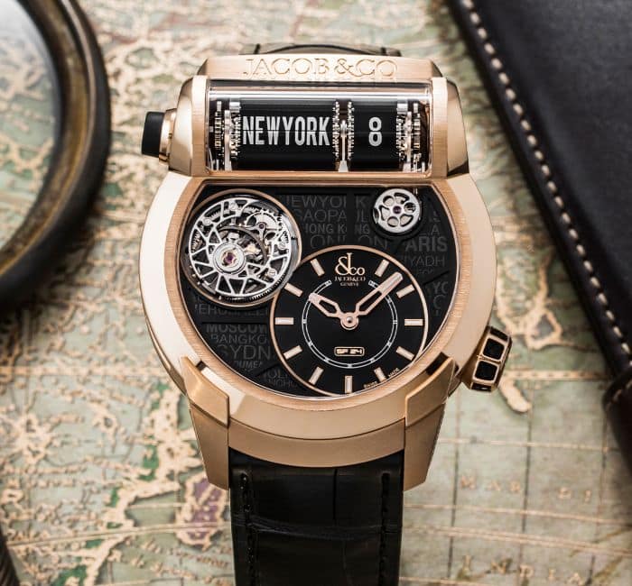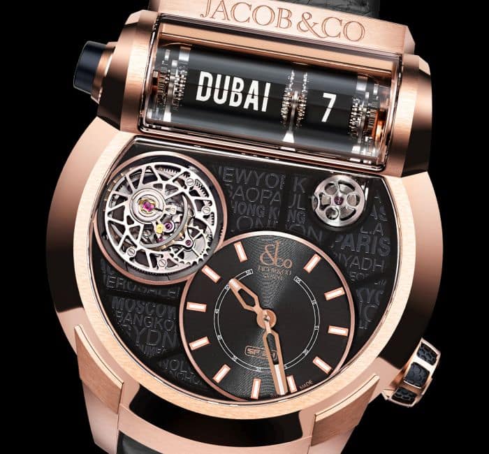 CASE: DIAMETER: 45mm; Thickness: 13.65mm at the Center,16.70mm at the World Time Display; Material: 18K Rose Gold; Case sides, Pusher and Crown: Inserts of Honeycomb Pattern Rubber; Finishing: Satined; Micro-blasted and Polished; Crystal: 1Domed & 1 Sapphire with Anti-reflective Treatment on Both Sides; Case Back: See Through Back with Sapphire Crystal and Metallized Jacob & Co. Decor; Water resistance: 30m.