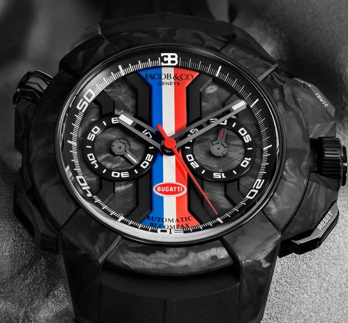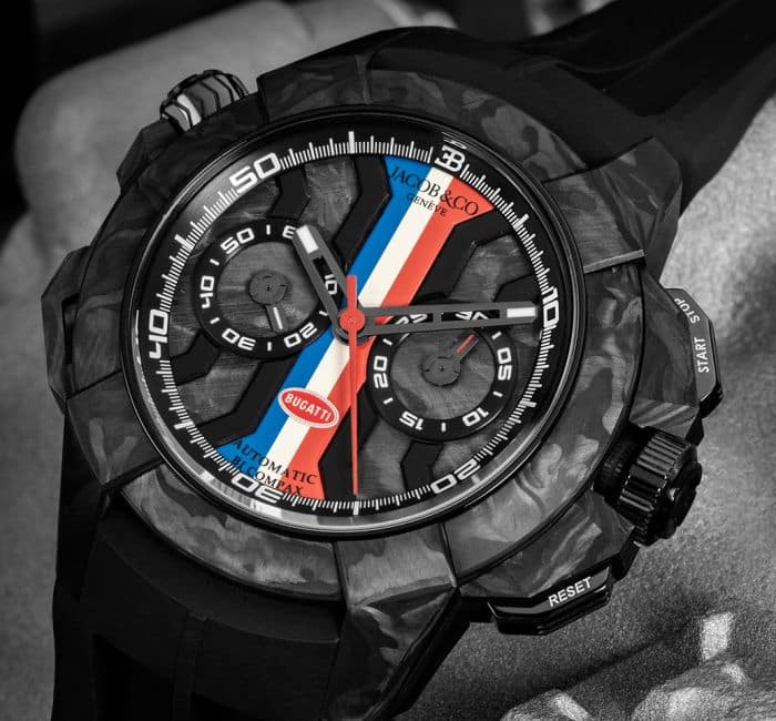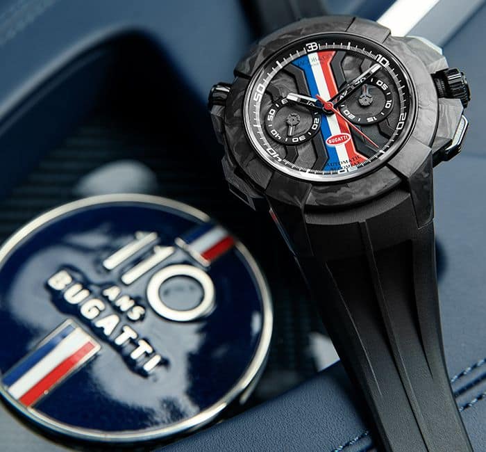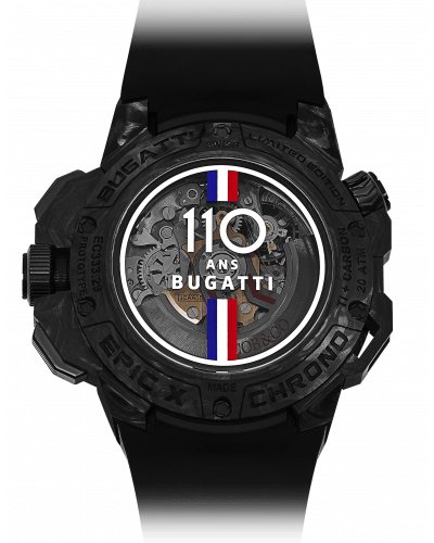 CASE: Diameter: 47mm; Height: 14mm; Components: 61; Material: Black DLC Titanium Grade 5 and Forged Carbon; Black Push Downs Pushers; Black Screw Down Ceramic Crowns; Case Back: Sapphire Glass with Bugatti’s “110th Anniversary” logo; Carbon Fiber case back with a special engraving “Bugatti Edition Limitée”; Crystal: Sapphire with Anti-Refl ective Treatment; Water resistance: 200m.