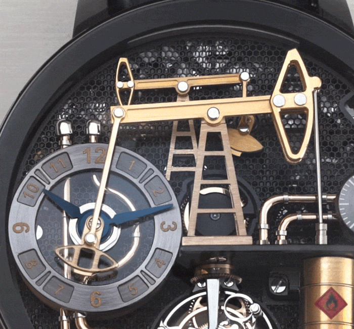 DIAL & HANDS: Dial: Grill shaped base dial; Hour/Minute Dial with central sapphire crystal; 18K Rose Gold plated Derricks; 18K Rose Gold Barrel and Pipelines; Power Reserve Indication at 3 o’clock; Hands: Blued Jacob&Co designed hands.
