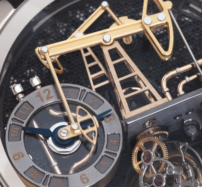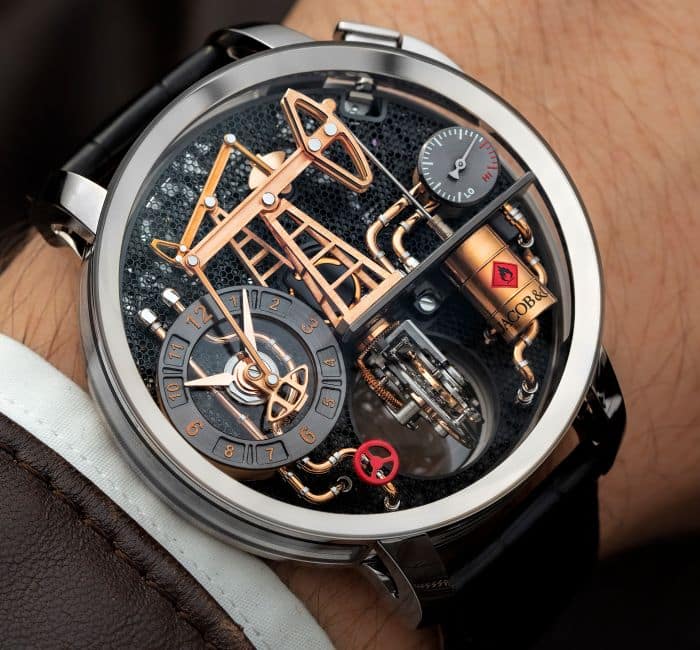 DIAL & HANDS: Dial: Grill shaped base dial; Hour/Minute Dial with central sapphire crystal; 18K Rose Gold plated Derricks; 18K Rose Gold Barrel and Pipelines; Power Reserve Indication at 3 o’clock; Hands: 18K Rose Gold Jacob&Co designed hand.