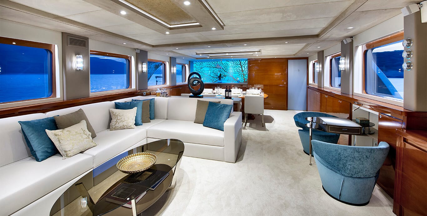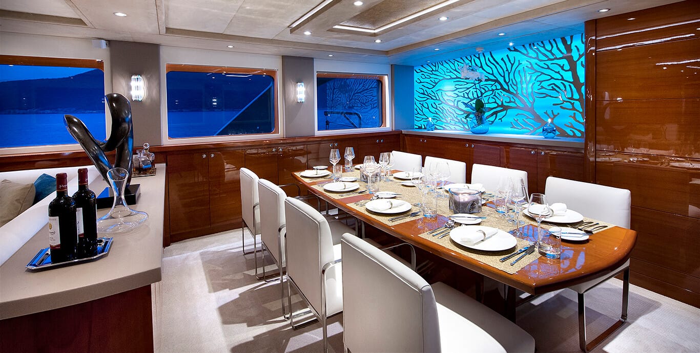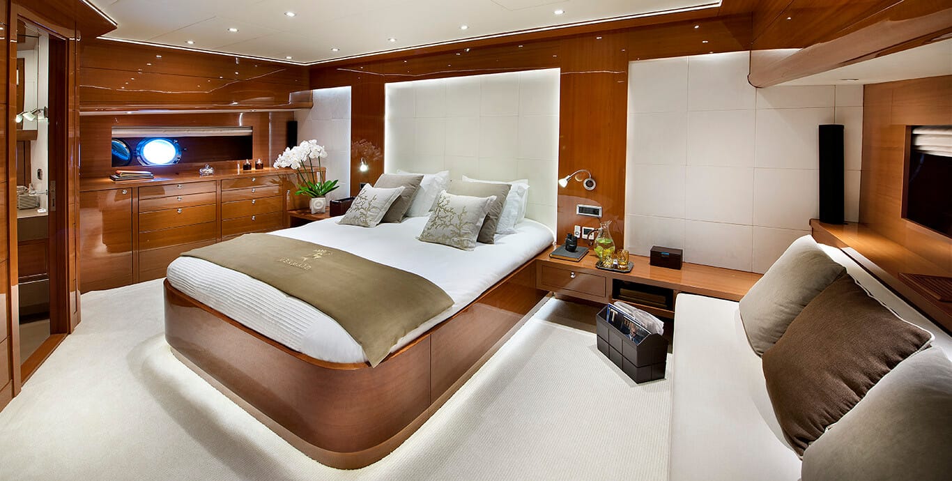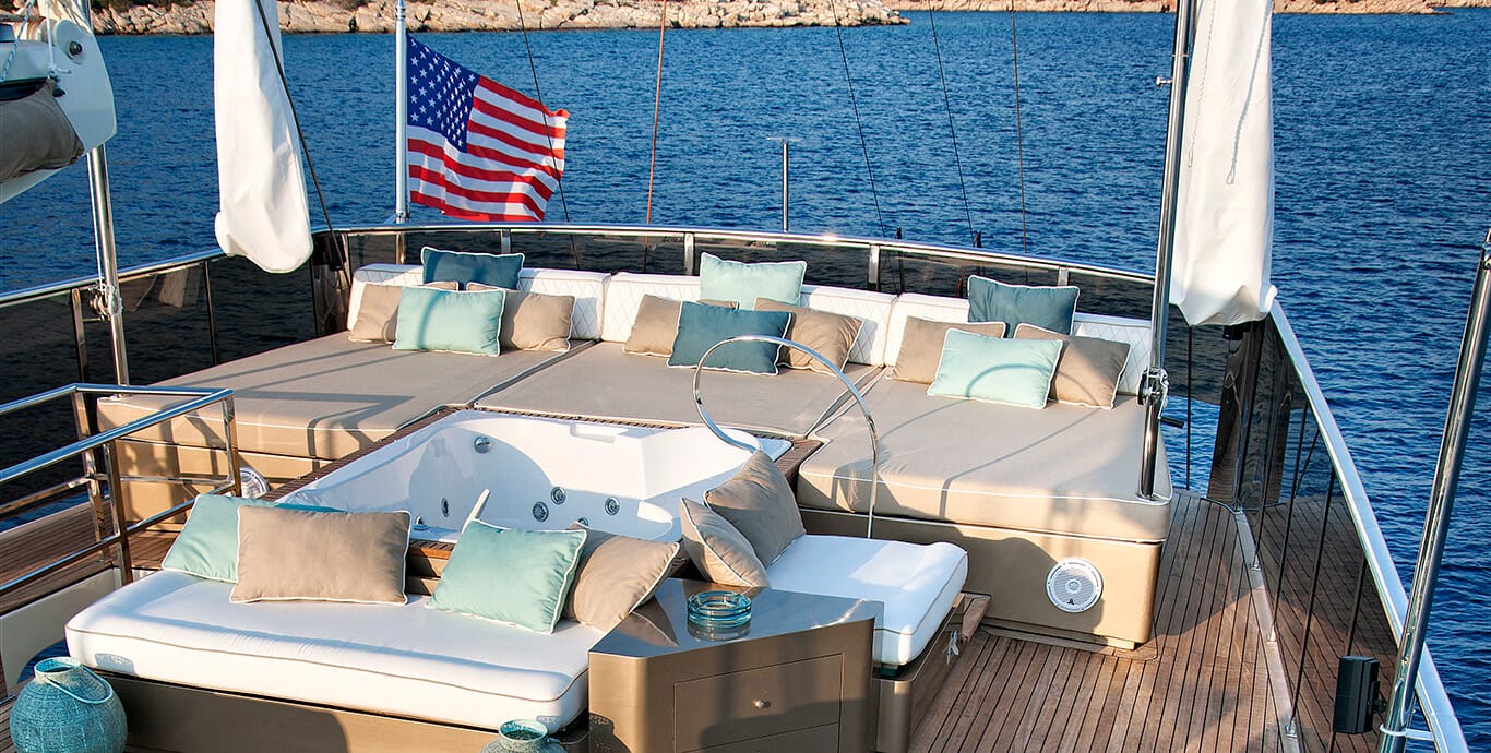 Her sundeck with an ingenious combination of highly adaptable and flexible custom-engineered systems can be converted from a daytime lounge into a night-time buffet set-up and a sumptuous table that seats up to 14 guests, ready to host the party of a lifetime. The vast sundeck area flaunts a professionally equipped bar, a spacious lounge, comfy, rotating armchairs and central whirlpool spa surrounded by an enticing expanse of sunbeds. She cruises at 10.0 kn and reaches a top speed of 14.0 kn.