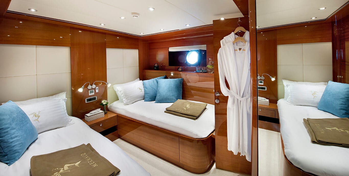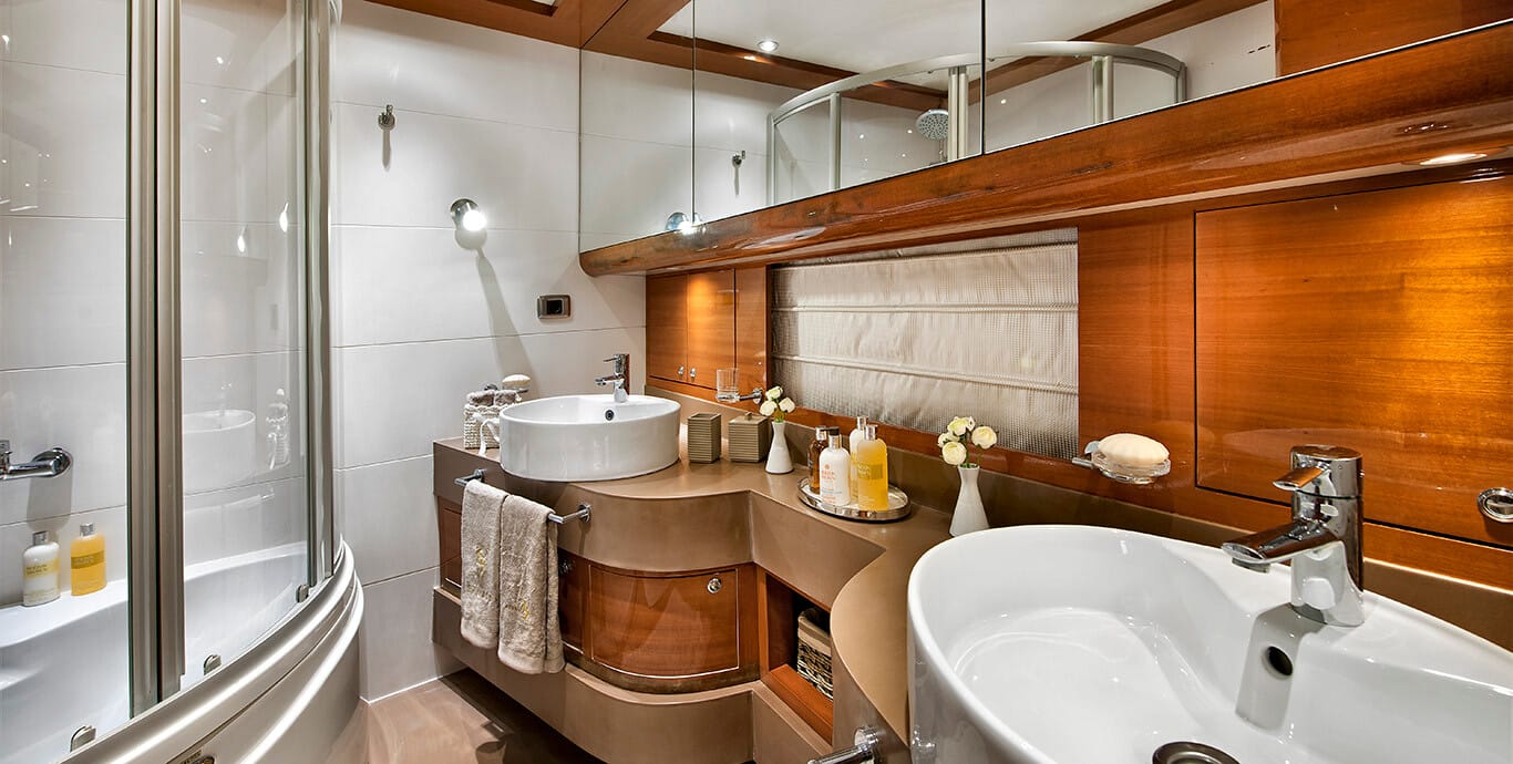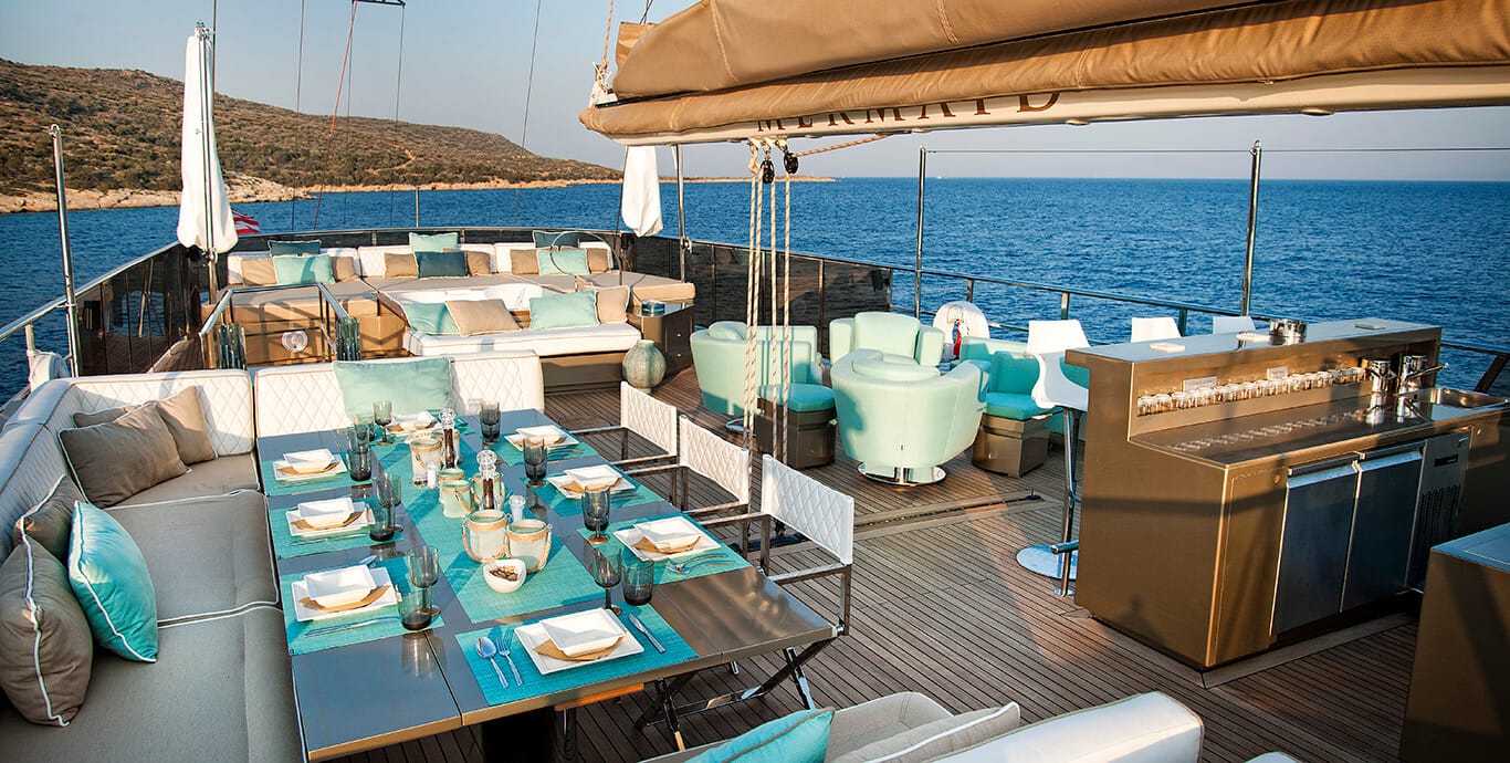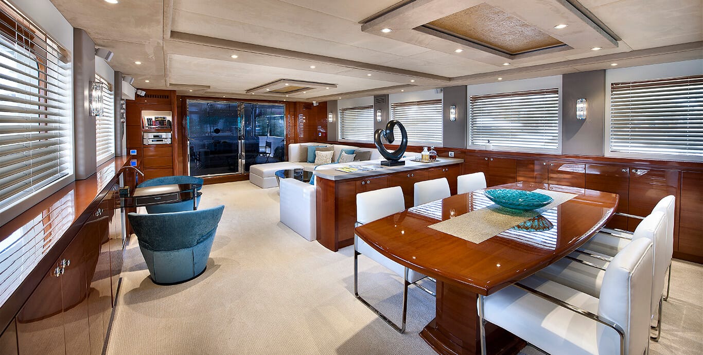 Her sundeck with an ingenious combination of highly adaptable and flexible custom-engineered systems can be converted from a daytime lounge into a night-time buffet set-up and a sumptuous table that seats up to 14 guests, ready to host the party of a lifetime. The vast sundeck area flaunts a professionally equipped bar, a spacious lounge, comfy, rotating armchairs and central whirlpool spa surrounded by an enticing expanse of sunbeds. She cruises at 10.0 kn and reaches a top speed of 14.0 kn.