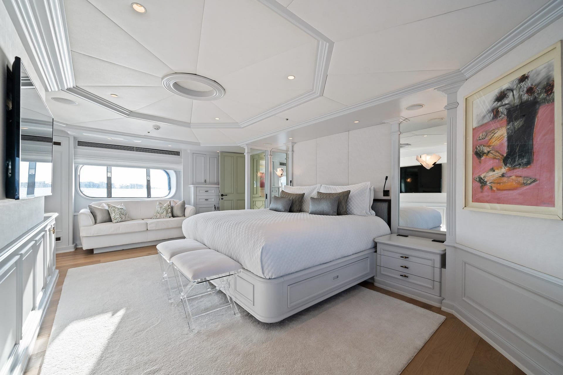 On the port side, the lobby leads into a VIP stateroom with an en suite bathroom. Four large staterooms, three doubles and a twin with en suite marble bathrooms, are on the lower deck. MOSAIQUE accommodates up to 12 guests and carries 12 crew.