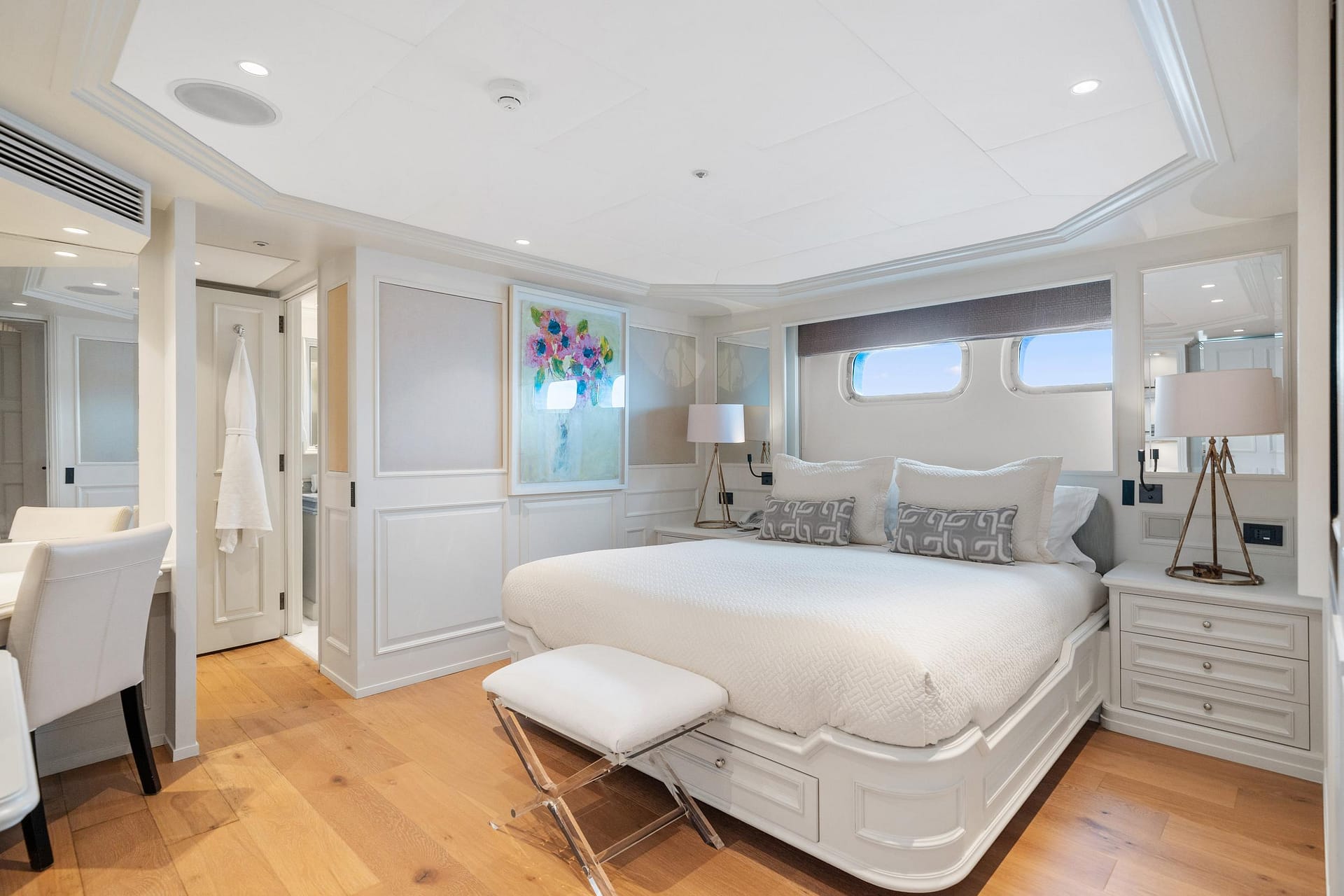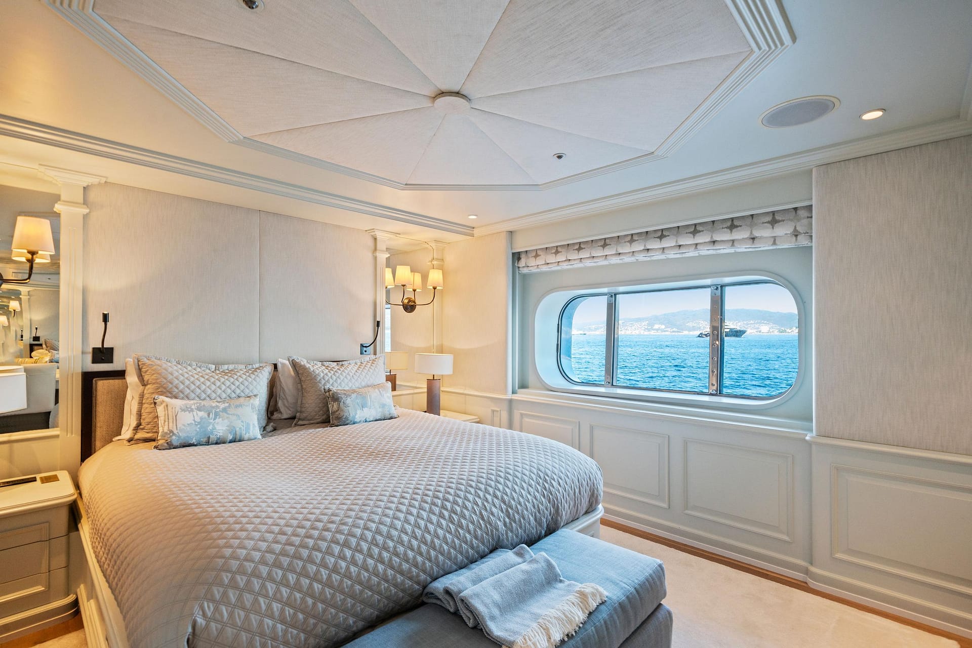 At 589 GT, MOSAIQUE is extremely spacious for a 50m yacht and was originally designed to reflect the feel of a country house. Her current casual-elegant ‘Hamptons Beach’ style is comfortable and inviting. The large windows, white deck heads and paneling blend perfectly with the soft neutral fabrics with blue accents to create an expansive and extremely livable interior.