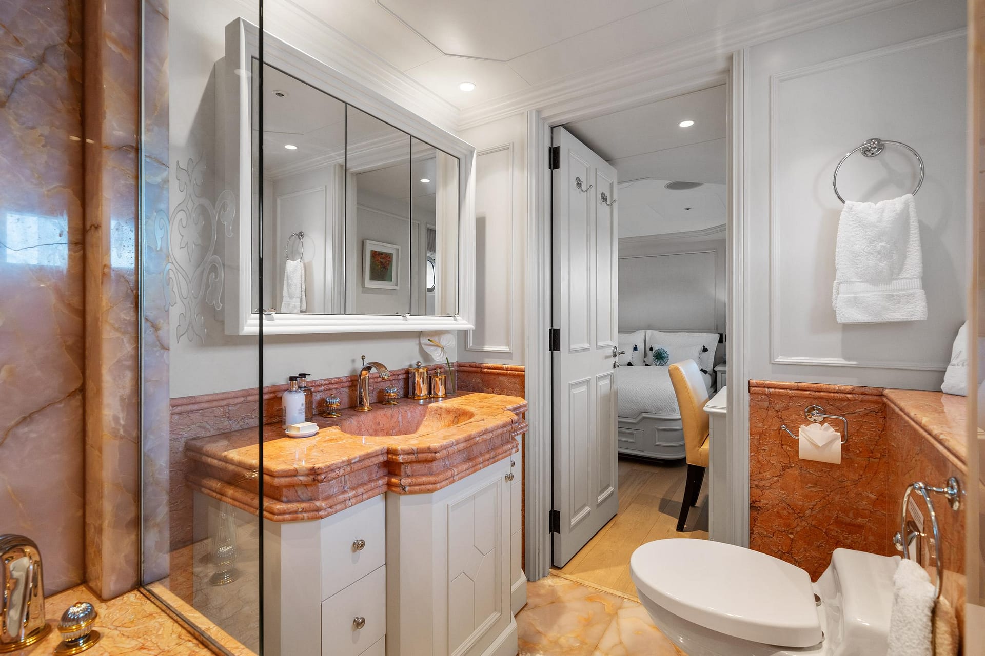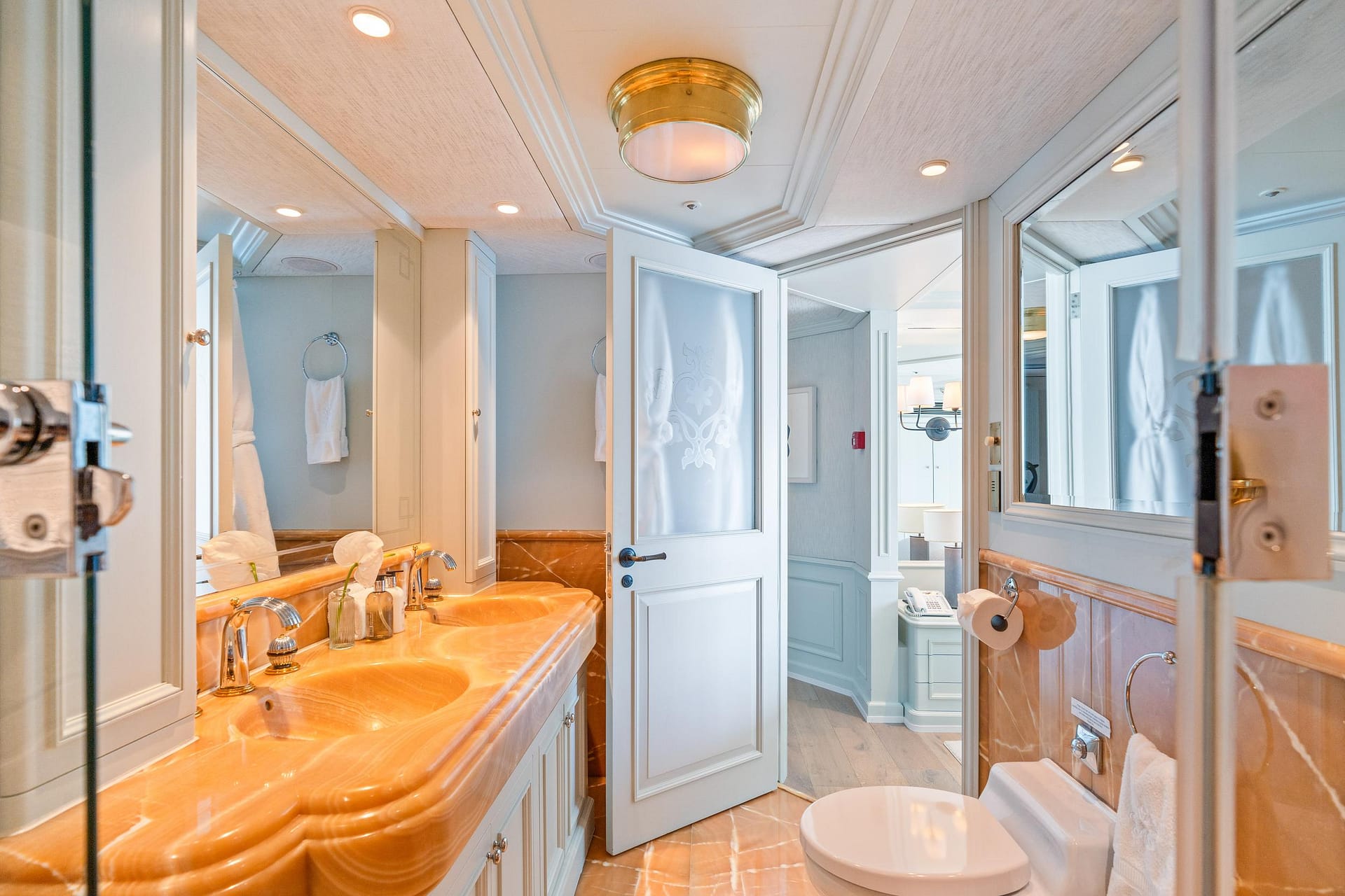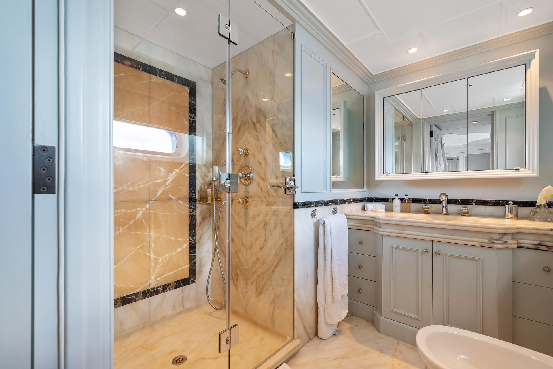 Her functional main deck has a large salon with a games area and a separate formal dining area for 12 guests. Further forward, a large lobby leads into the owner’s private study and a full-beam master suite with a large bathroom in Honey onyx and his and her dressing rooms.