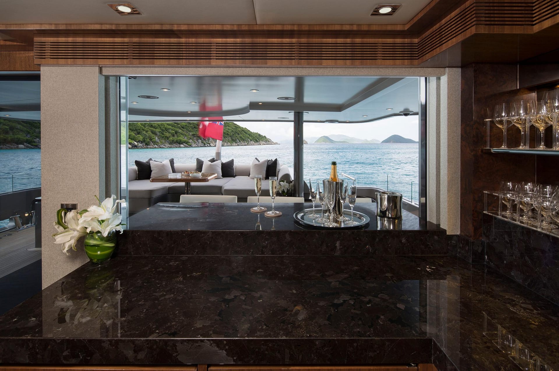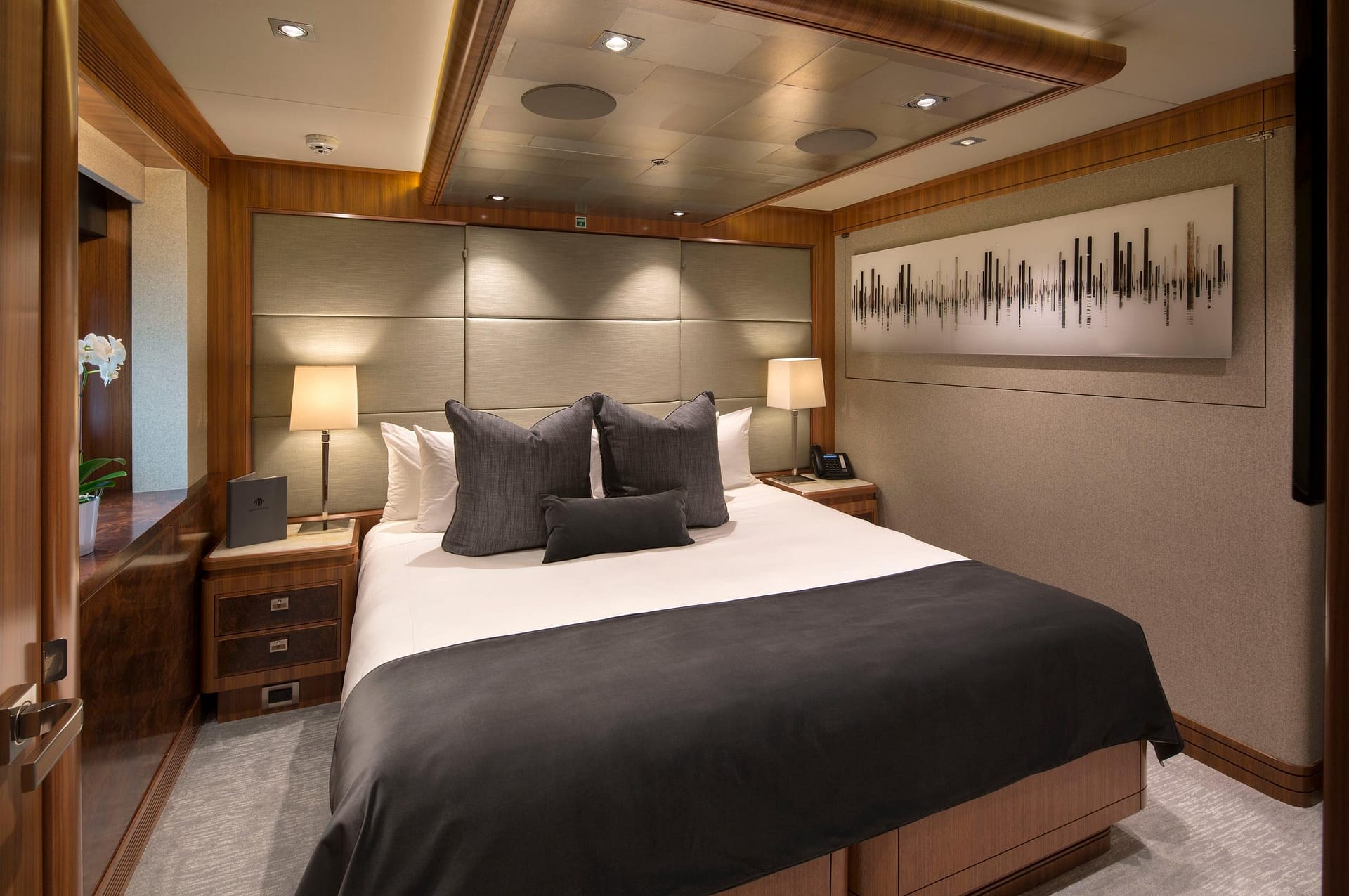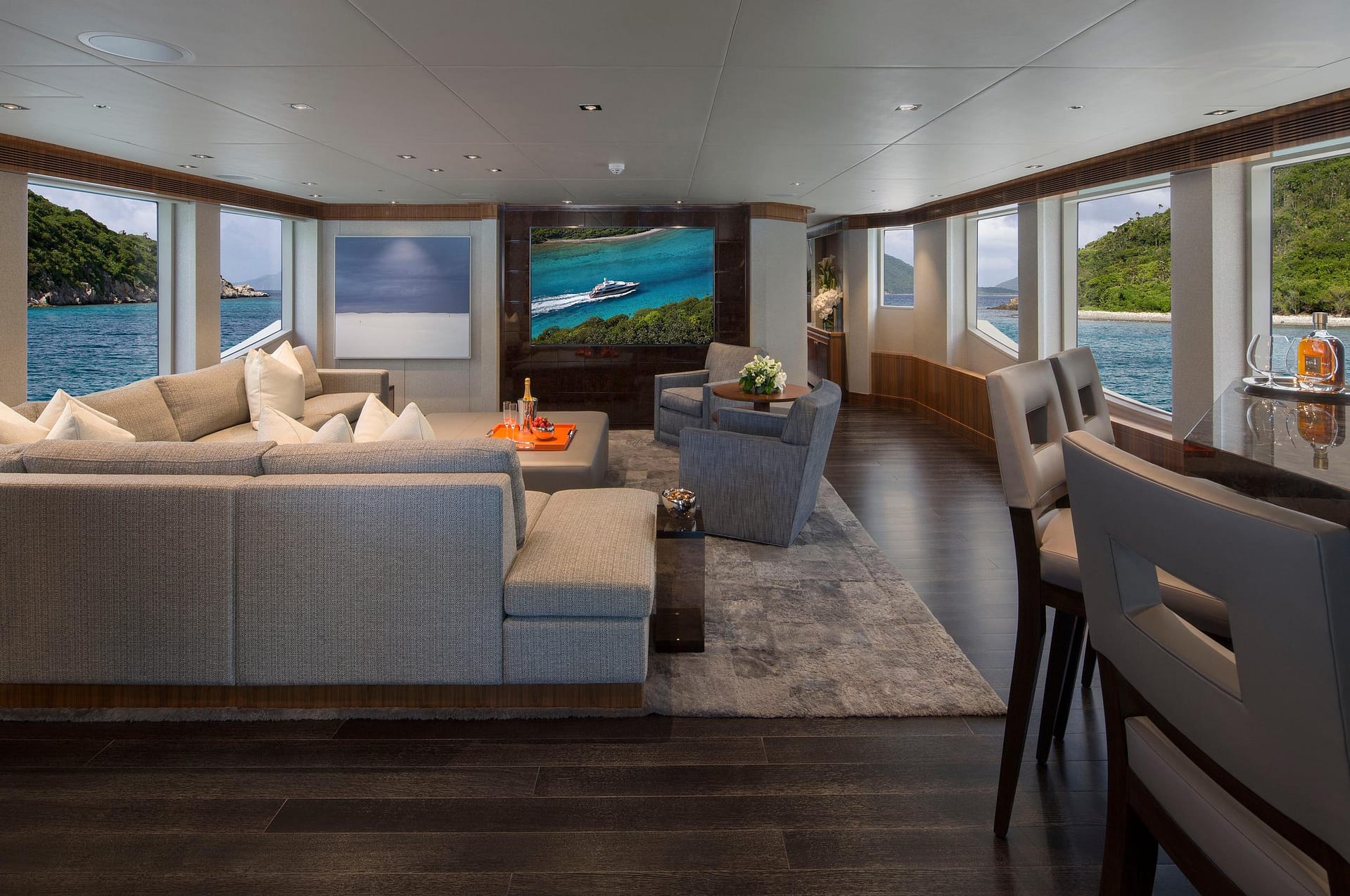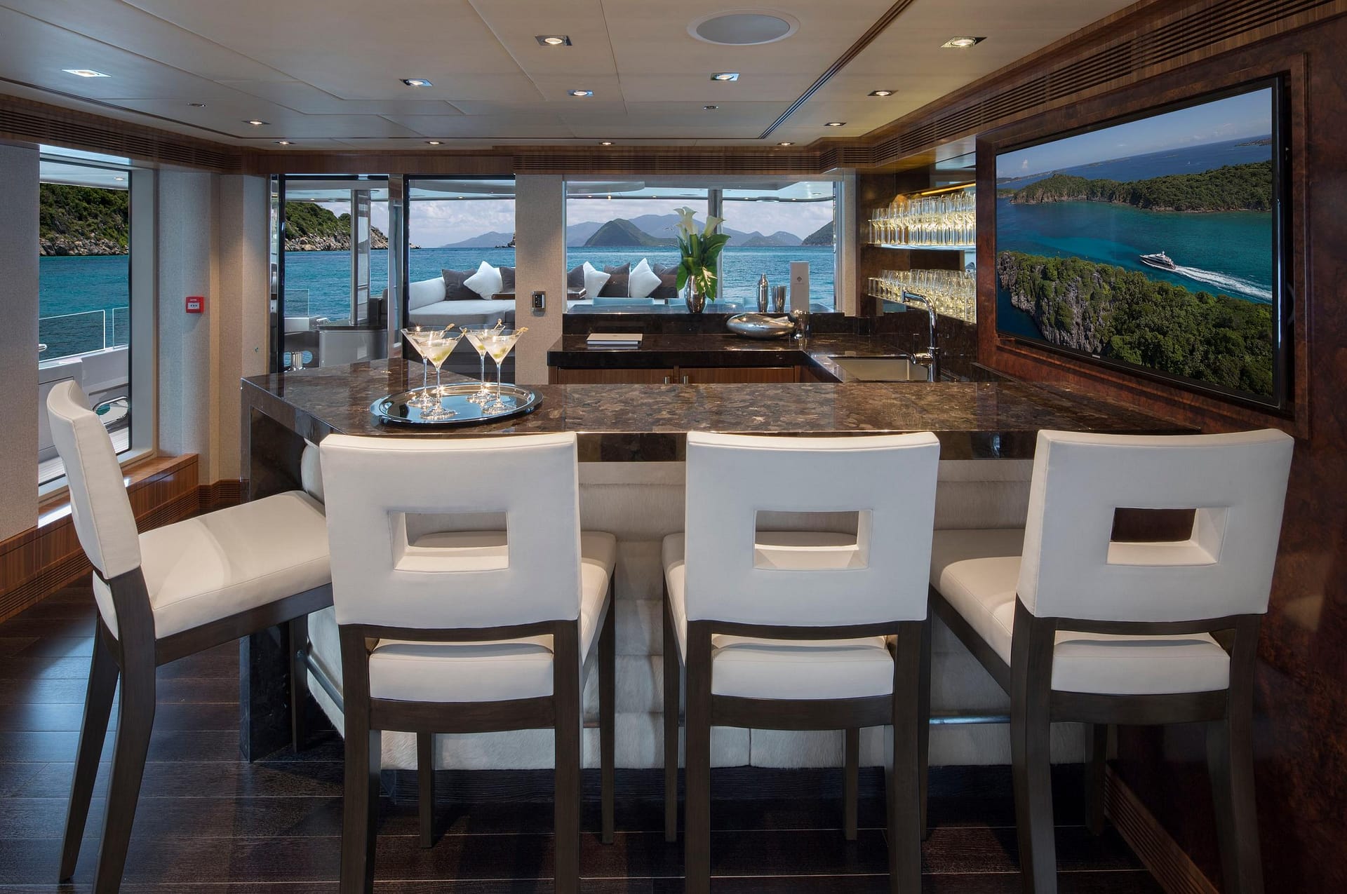 The yacht’s centerpiece is the expansive sun deck, featuring a full bar, BBQ, two misting systems, a sun pad, and a unique corner waterfall jacuzzi with a swim-up bar. With 54 jets, the jacuzzi offers an unparalleled relaxation experience.
