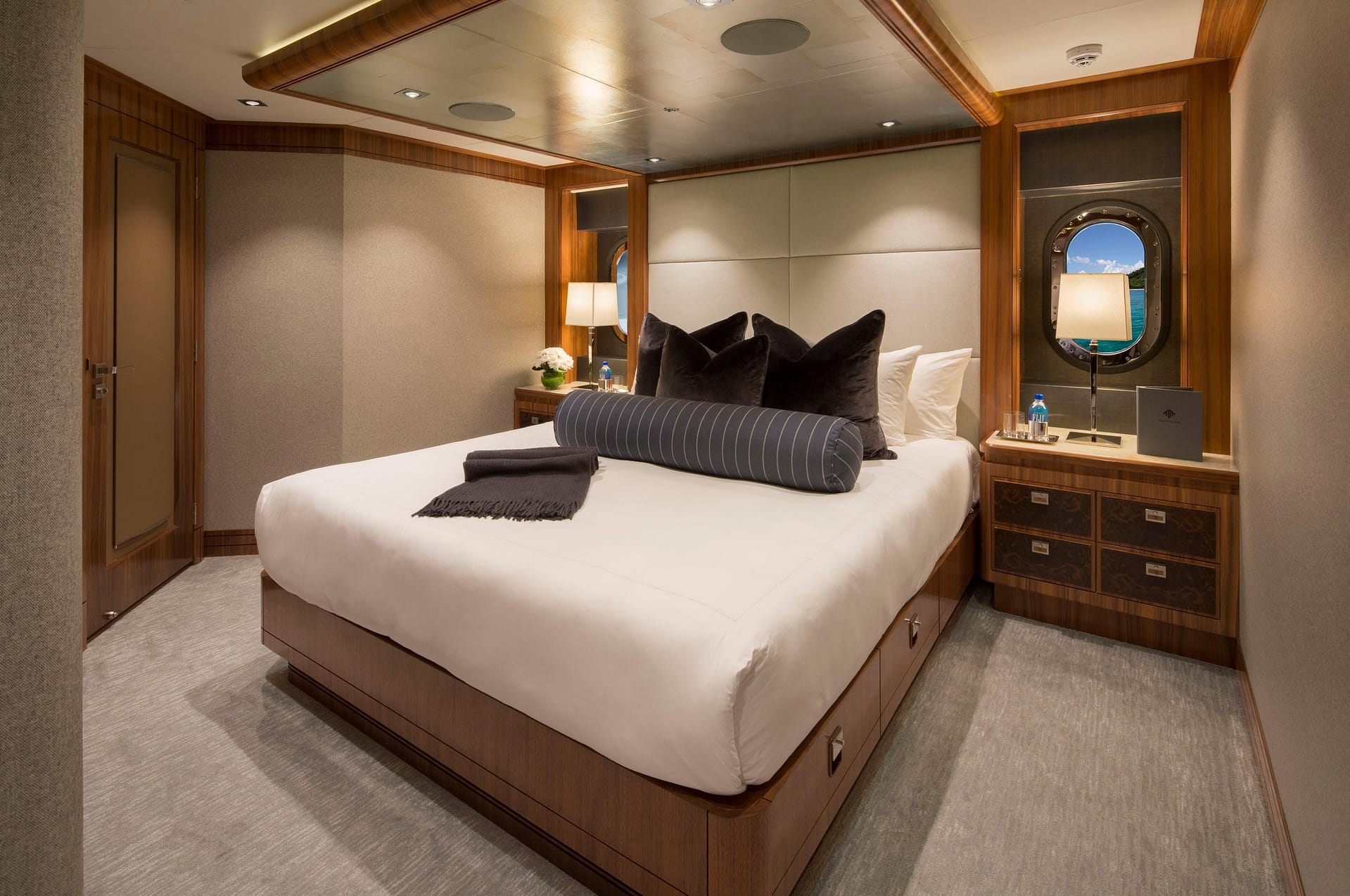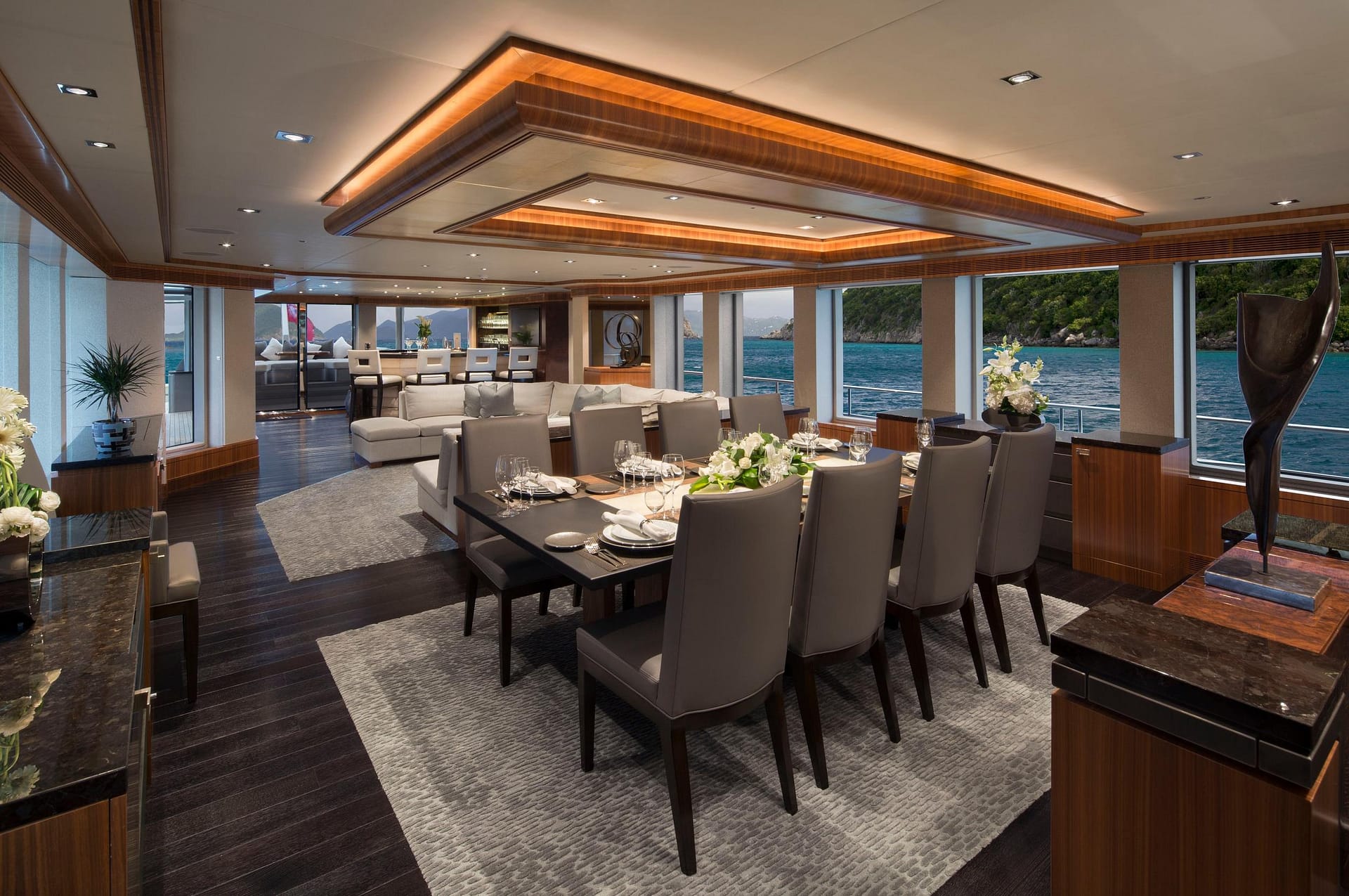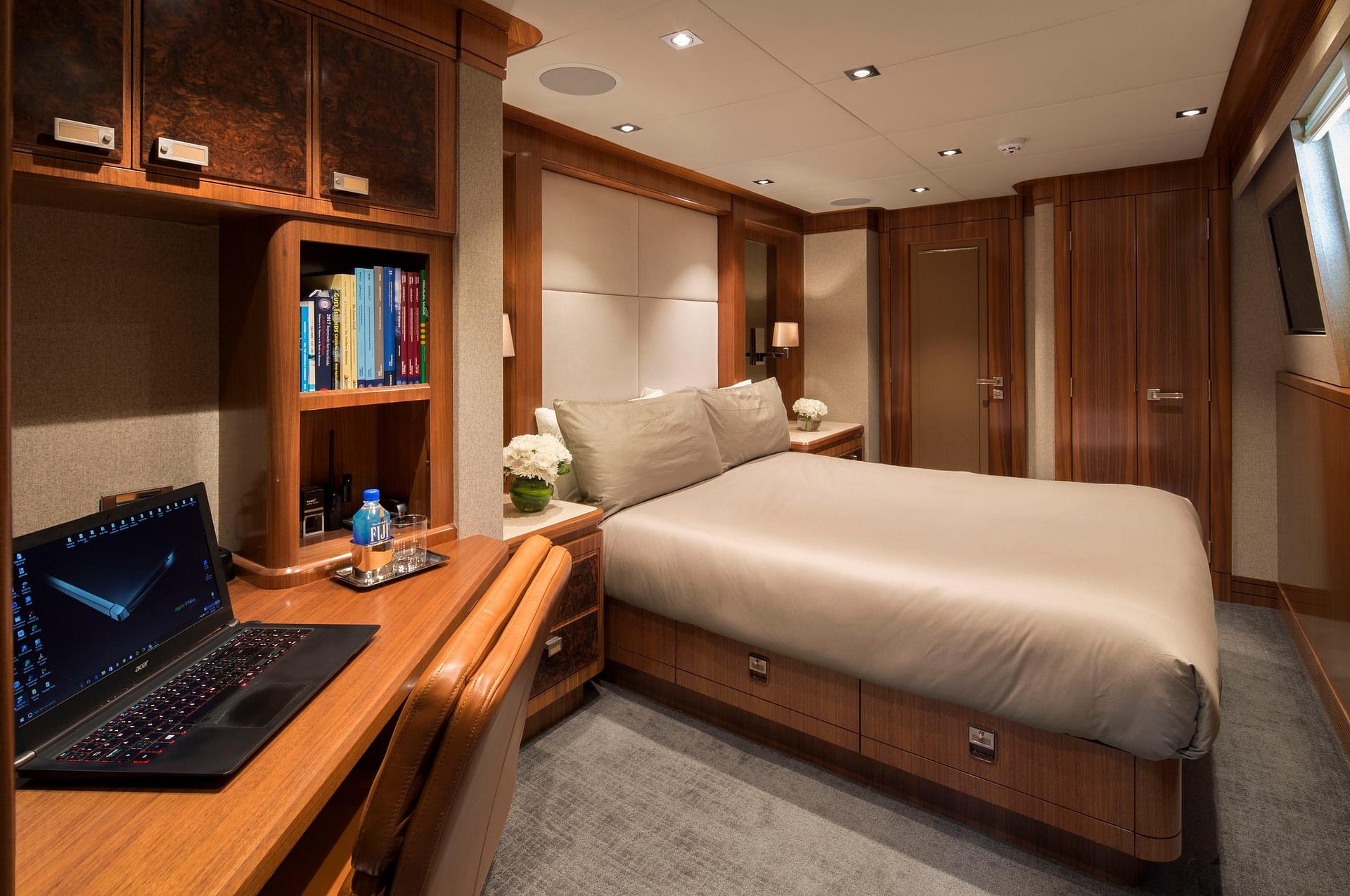 Accommodations on MUCHOS MAS are equally impressive, catering to up to 11 guests in 5 well-appointed staterooms. The full-beam owner’s stateroom on the forward bridge deck includes a king bed,a walk-in wardrobe, a dedicated office, a relaxing lounge area, and an ensuite. Four additional staterooms on the lower deck offer versatility, with the aft stateroom capable of converting into a full-beam VIP suite with a private sitting area.