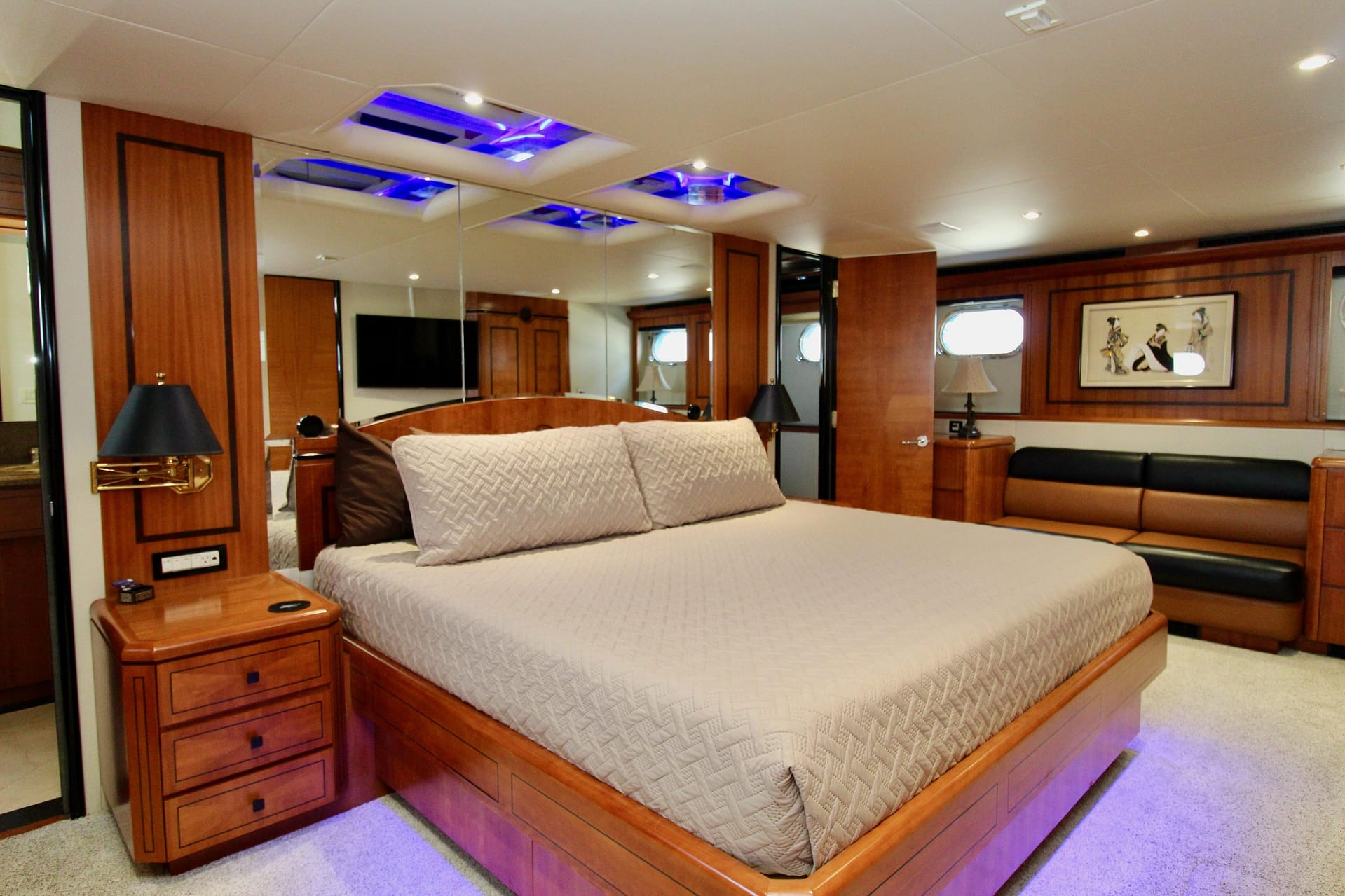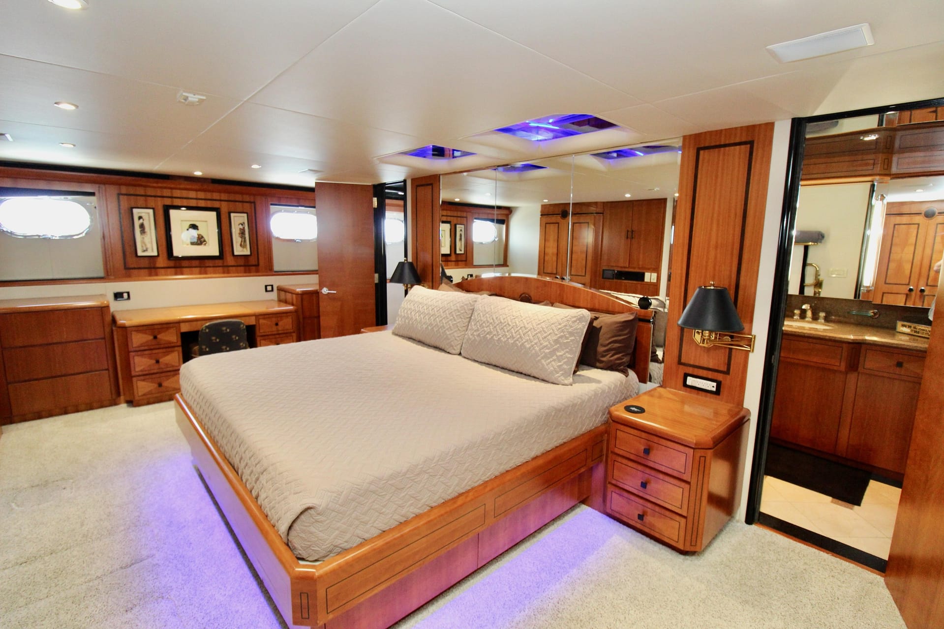 Designed with practicality in mind, MY WAY comfortably accommodates up to 8 guests in 4 well-appointed staterooms, each boasting its own ensuite bath. The Owner’s Stateroom, located aft, is a private oasis accessed by a dedicated stairway on the starboard side. This full-beam stateroom features a centerline king berth, two walk-in cedar-lined closets, a versatile desk/vanity complete with make-up lights and mirror, and a comfortable upholstered reading couch. The ensuite boasts a ‘his and hers’ arrangement with a large shower/Jacuzzi tub at its center. The VIP Stateroom features a centerline tapered queen berth and an ensuite with a spacious shower, granite vanity top, and cherry wood cabinetry. The 2 remaining guest stateroom consist of a starboard stateroom boasting a walk-around queen berth with its own ensuite. Opposite to port, the last guest stateroom features twin berths, separated by a beautifully crafted wood nightstand. The detailed wood headboards, enhanced by black lacquer trim, blend seamlessly into the walls and this stateroom also boasts an ensuite adorned with a granite vanity top, under-mounted sink, designer fixtures, and cherry wood cabinetry.