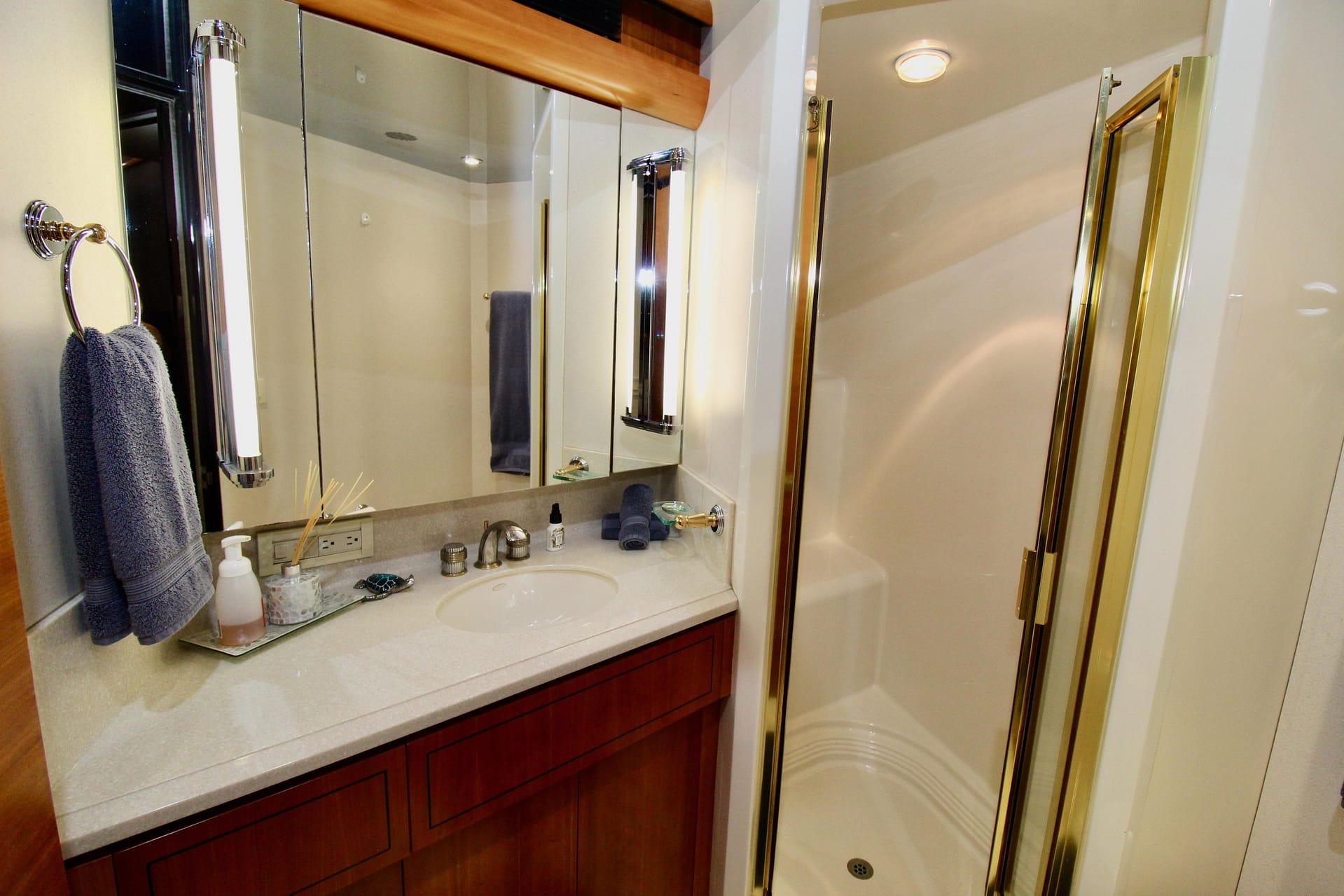 The main salon exudes comfort with custom leather furniture and leather upholstered valances surrounding a large coffee table, perfect for gatherings. Entertainment includes a Pioneer 45″ plasma-screen television on a high/low electric lift, while a sleek wet bar with a black Kohler sink and custom wine glass display cabinet cater to social needs. Custom artwork adds a personal touch. Nearby, the conveniently located day head features a black granite vanity with an under-mounted white porcelain sink and gold inlay. In the dining area, a custom walnut burl tabletop dining table is complemented by 8 chairs, offering the perfect setting for enjoying memorable meals.