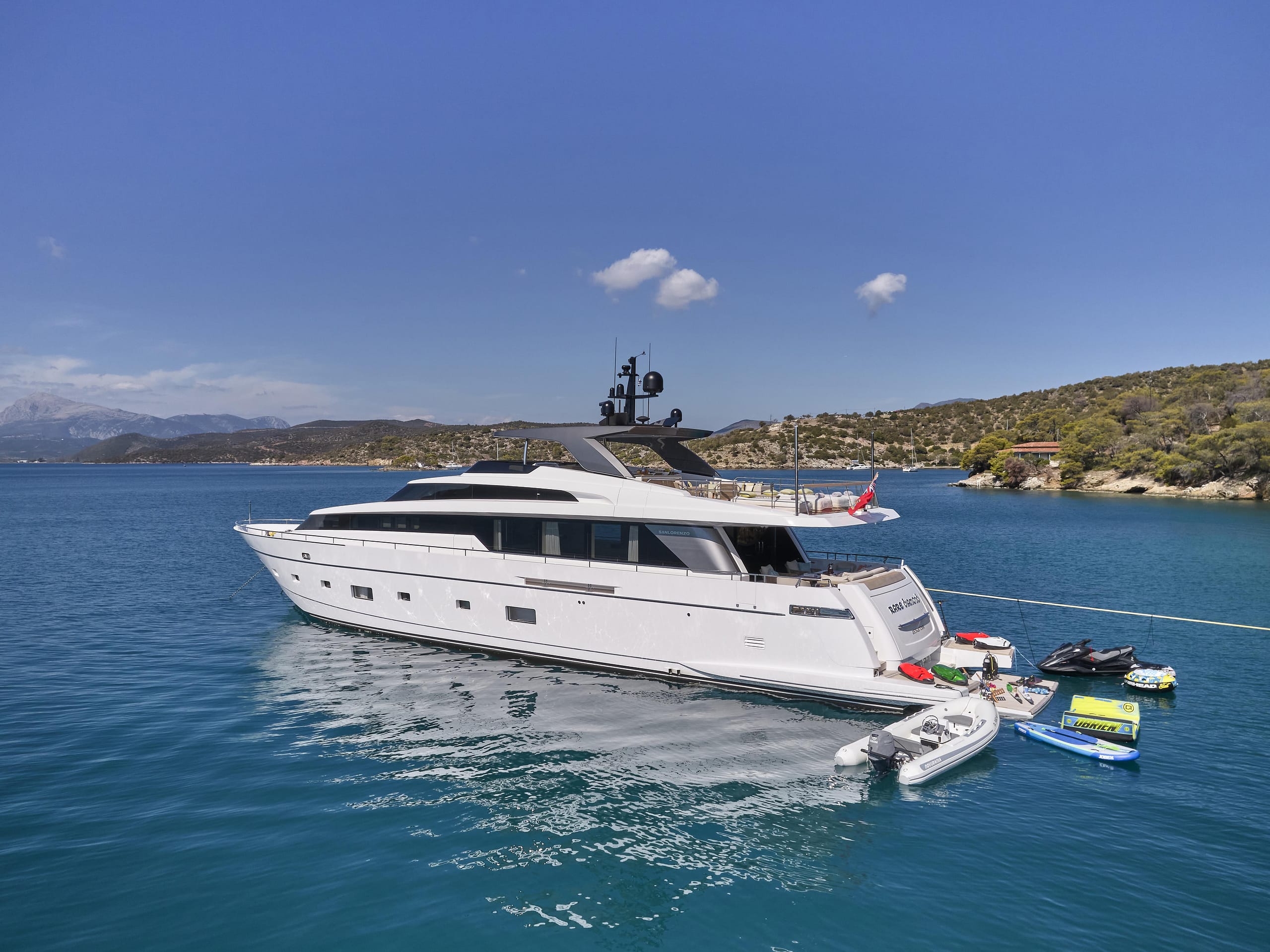 Built-in 2011, RARE DIAMOND underwent a major refit at the Sanlorenzo shipyard in La Spezia in 2021. Her upgrades include a full hull and superstructure repaint, brand-new Kohler generators, and an extended tender lift platform equipped with a state-of-the-art hydraulic system.