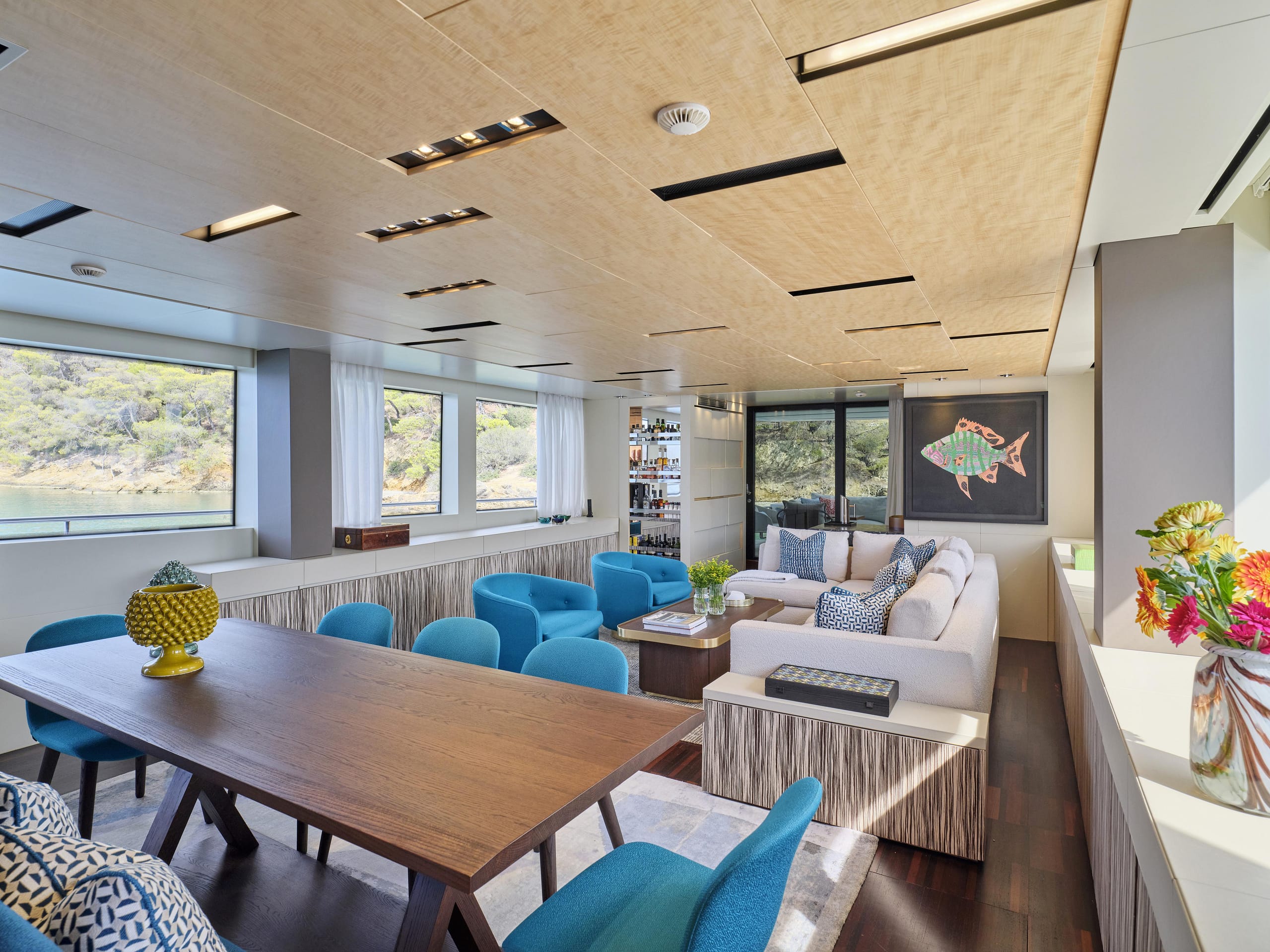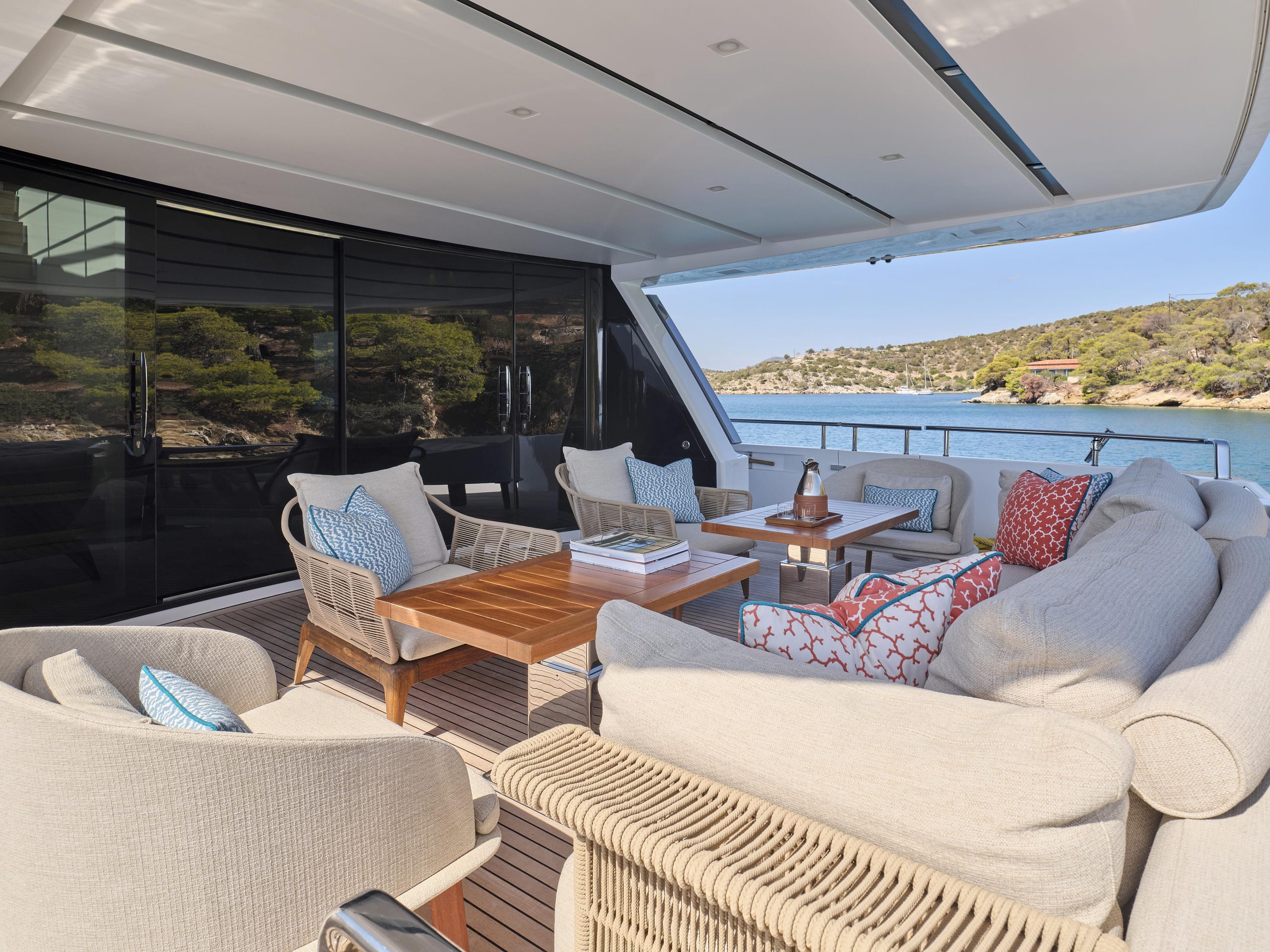 The expansive sundeck features stylish new furniture, while the refreshed interior boasts a vibrant, modern aesthetic that enhances comfort and relaxation.