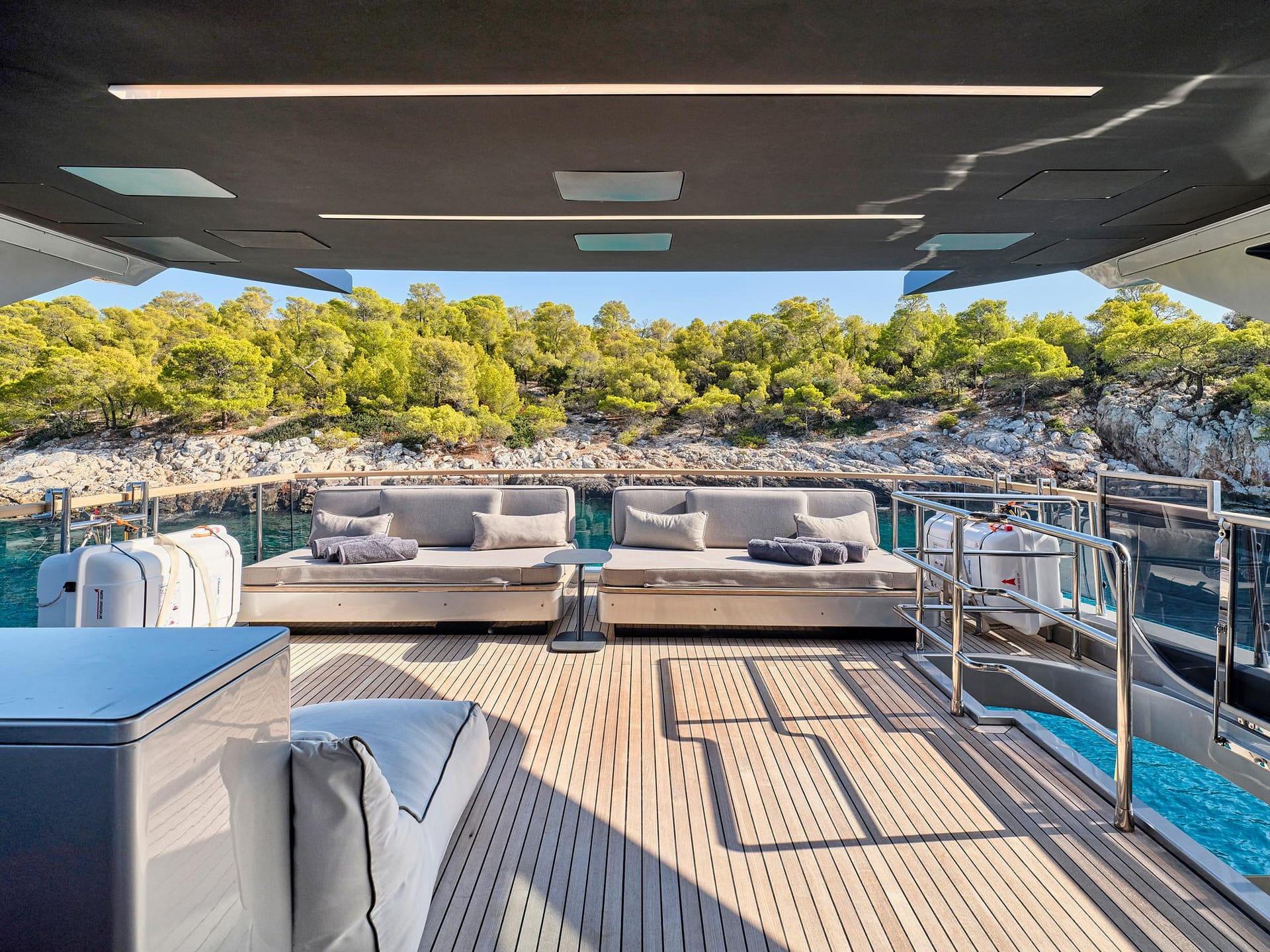 The yacht’s refined interior features a well-appointed, five-suite layout, accommodating up to 10 guests with exceptional comfort. The spacious master suite, situated on the main deck, provides direct access to an exclusive bow seating area.