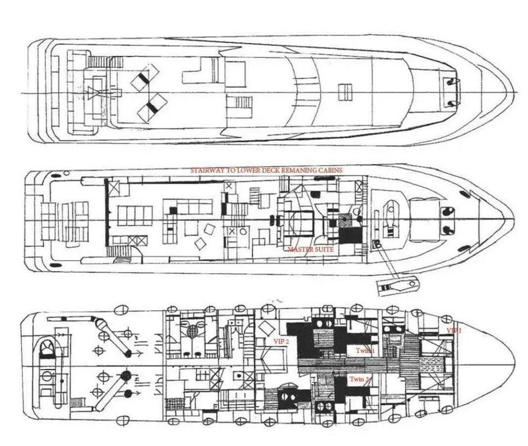 Beyond her interiors, TROPICANA’s outdoor spaces are a beautiful sight to behold. Her expansive sundeck provides an ideal setting for relaxation, sunbathing, and entertainment, complete with a well-appointed bar area. And for those with a penchant for water sports, she offers a plethora of water toys including Seabobs, paddle boards, water-skis, and a range of snorkelling equipment.