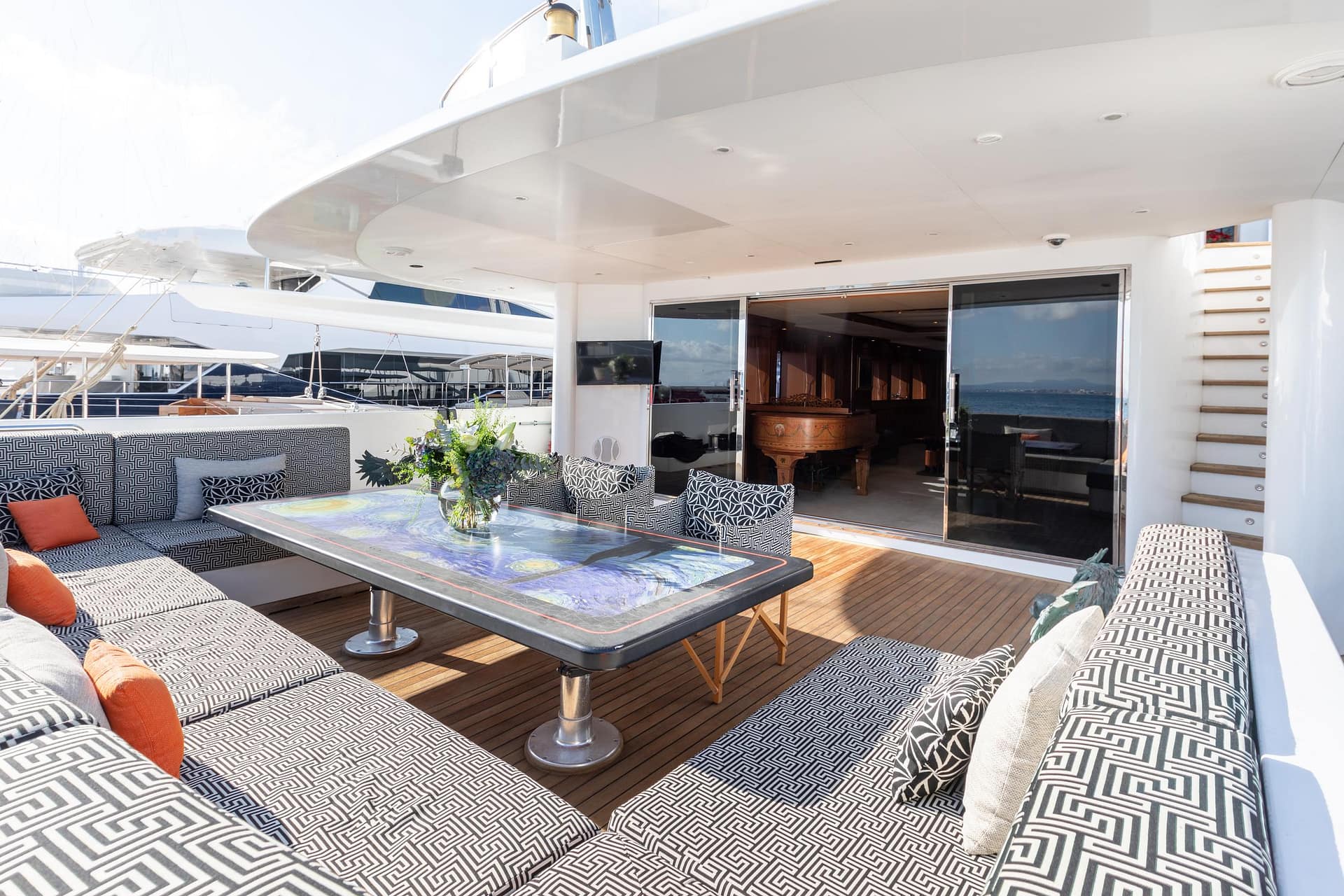 With an exterior and interior design by Luca Dini, ULYSSES boasts sleek lines and expansive outdoor spaces. A large aft deck offers a lounging/dining area and a sun-drenched upper deck features alfresco dining as well as a hot tub with sunpads.