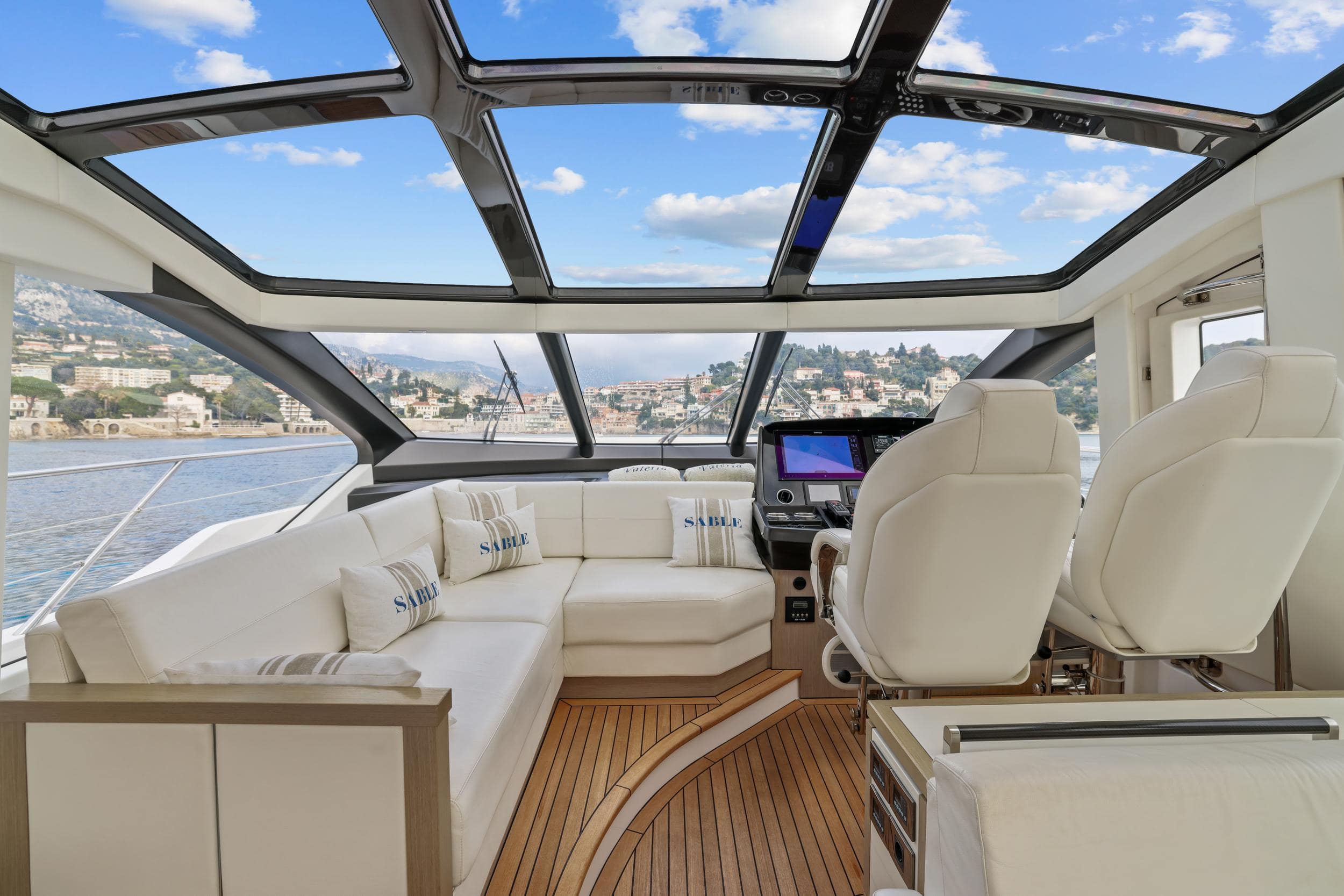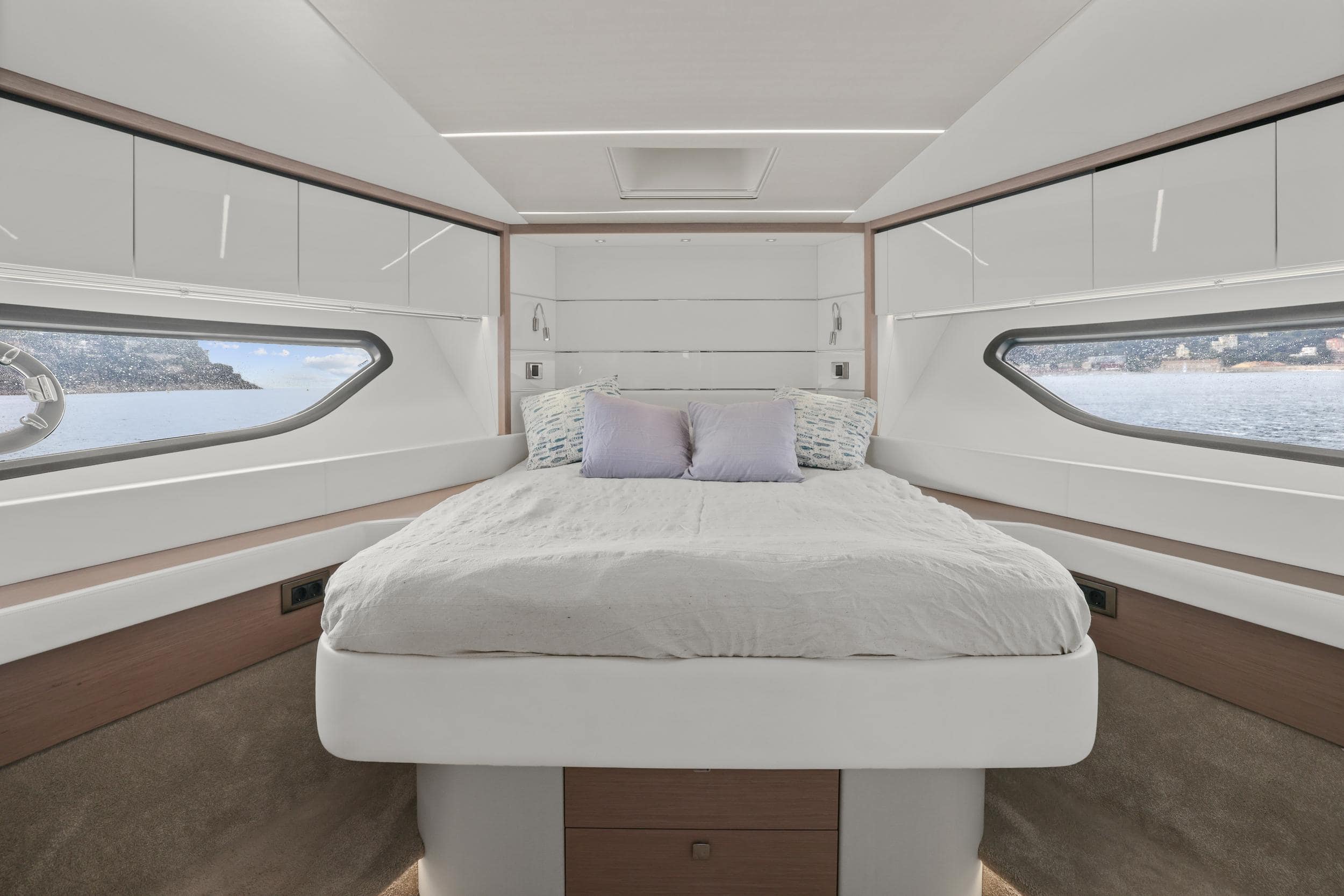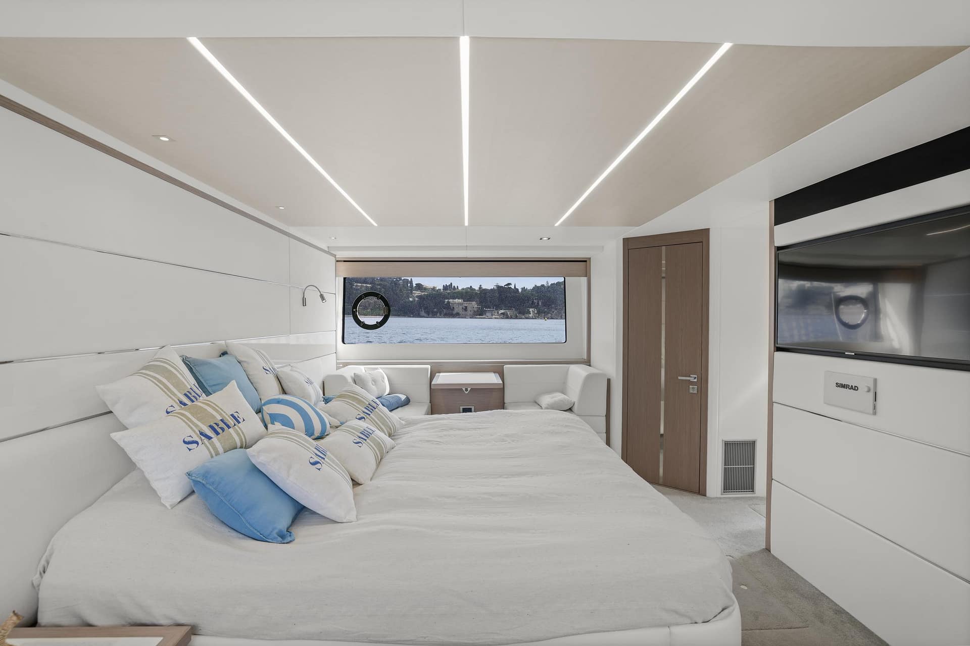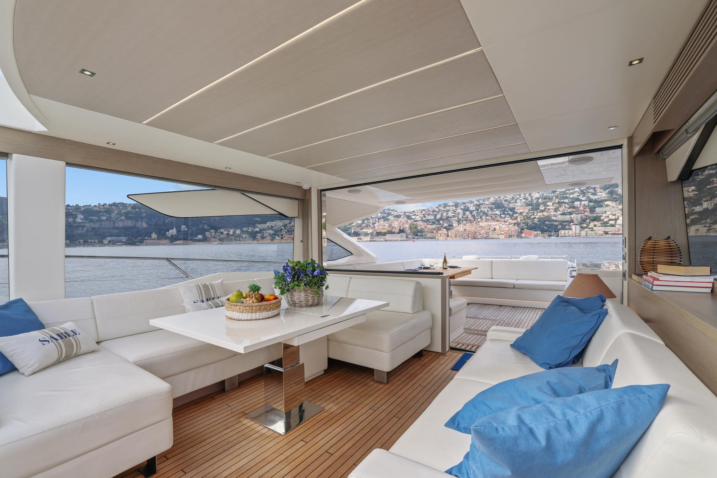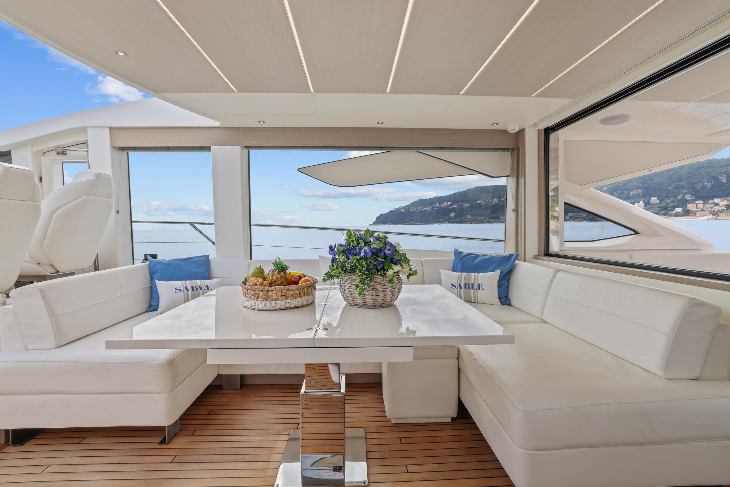 Designed for seamless indoor-outdoor living, her aft cockpit flows into the main salon through a drop-down patio door, creating a spacious and open environment. The main deck is ideal for socializing, featuring an expansive seating area and a generous sun pad for relaxation at sea.