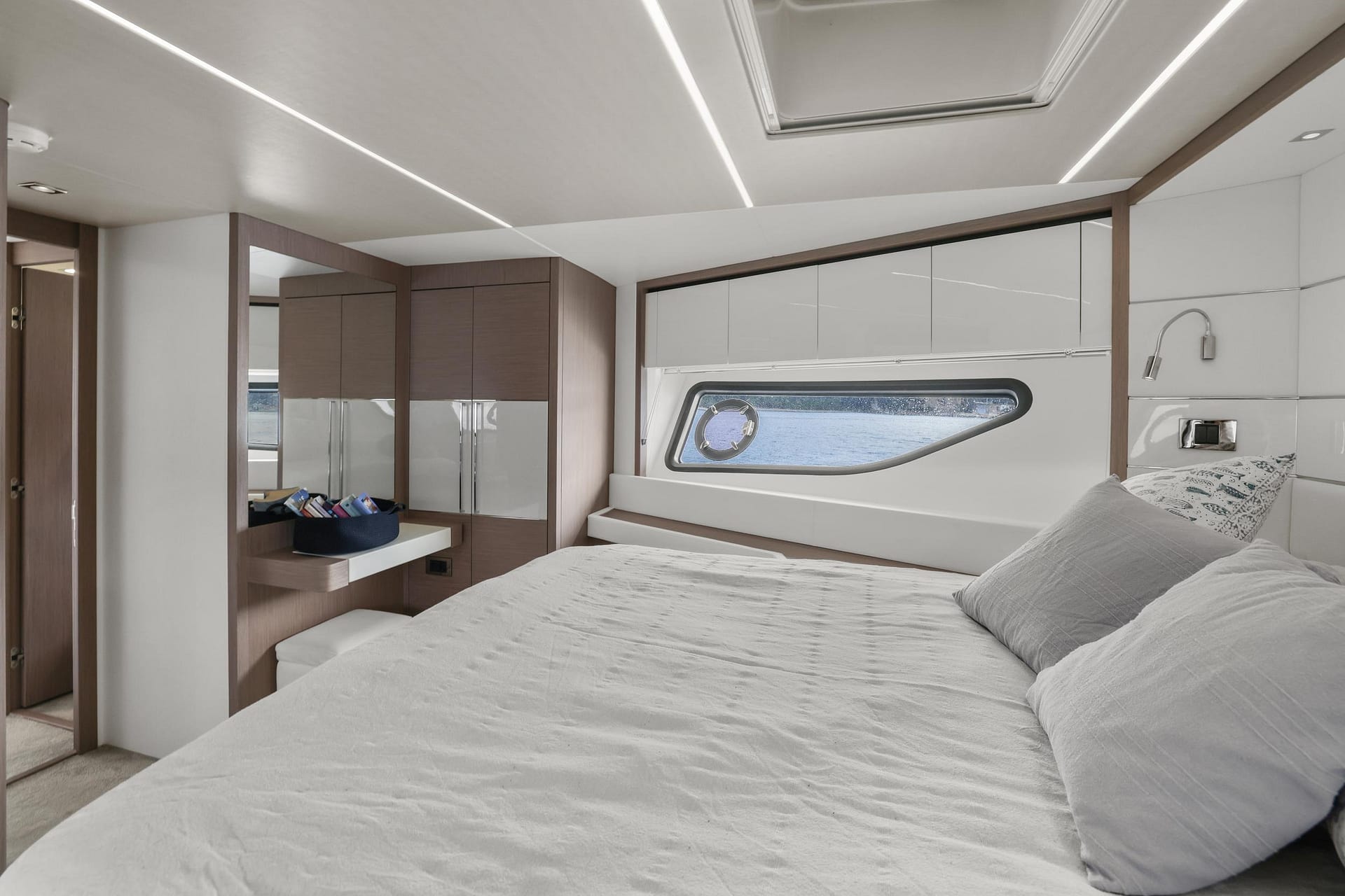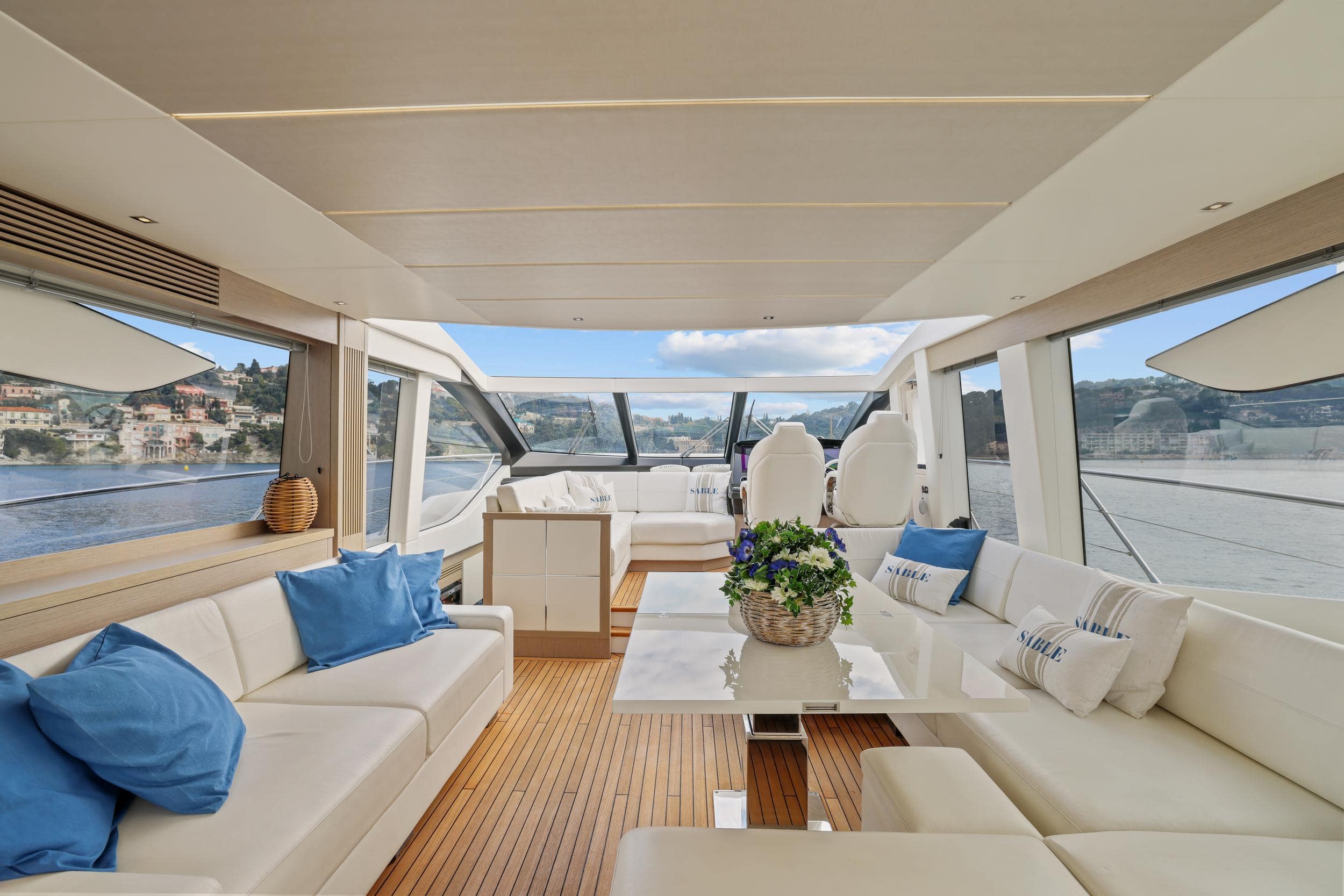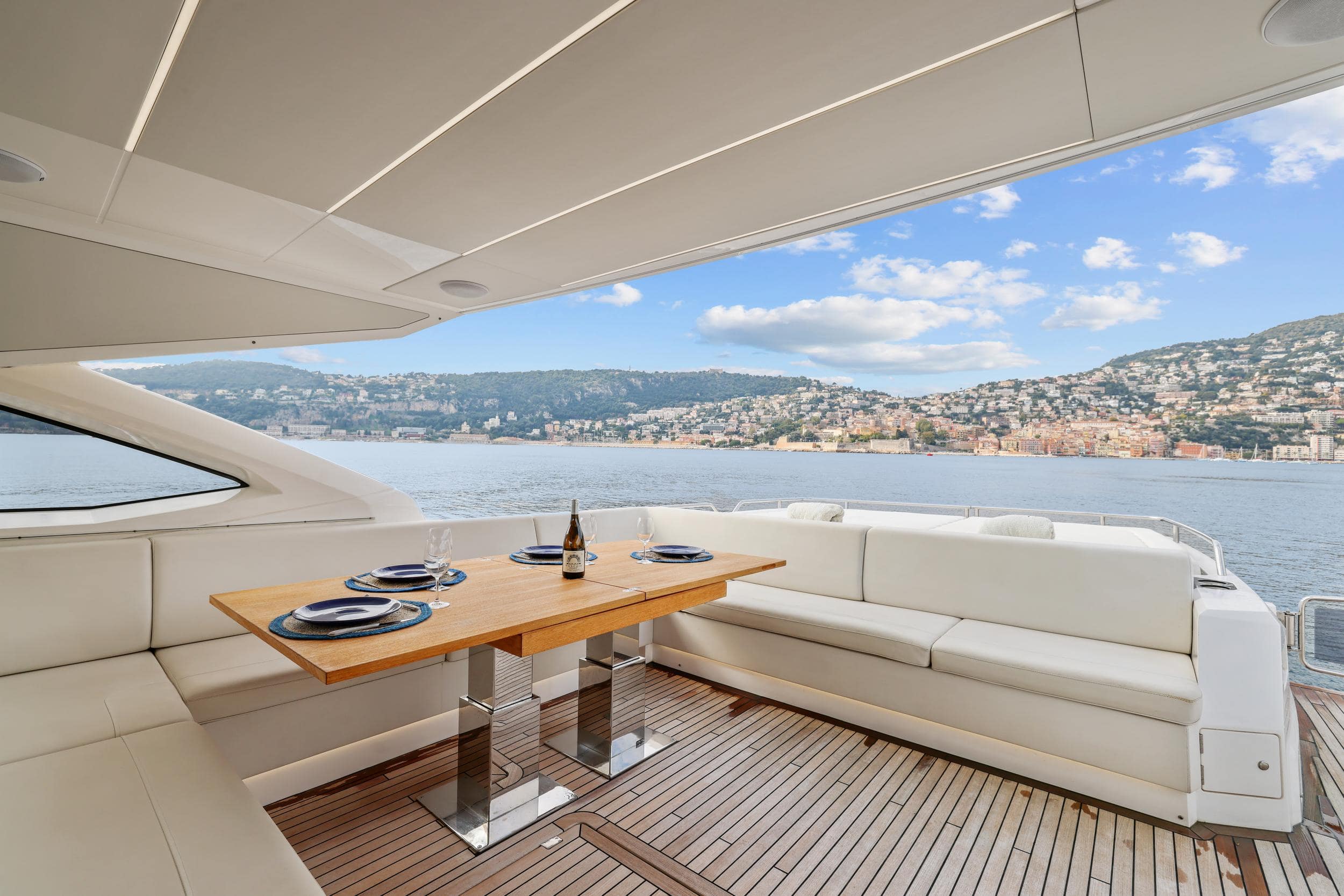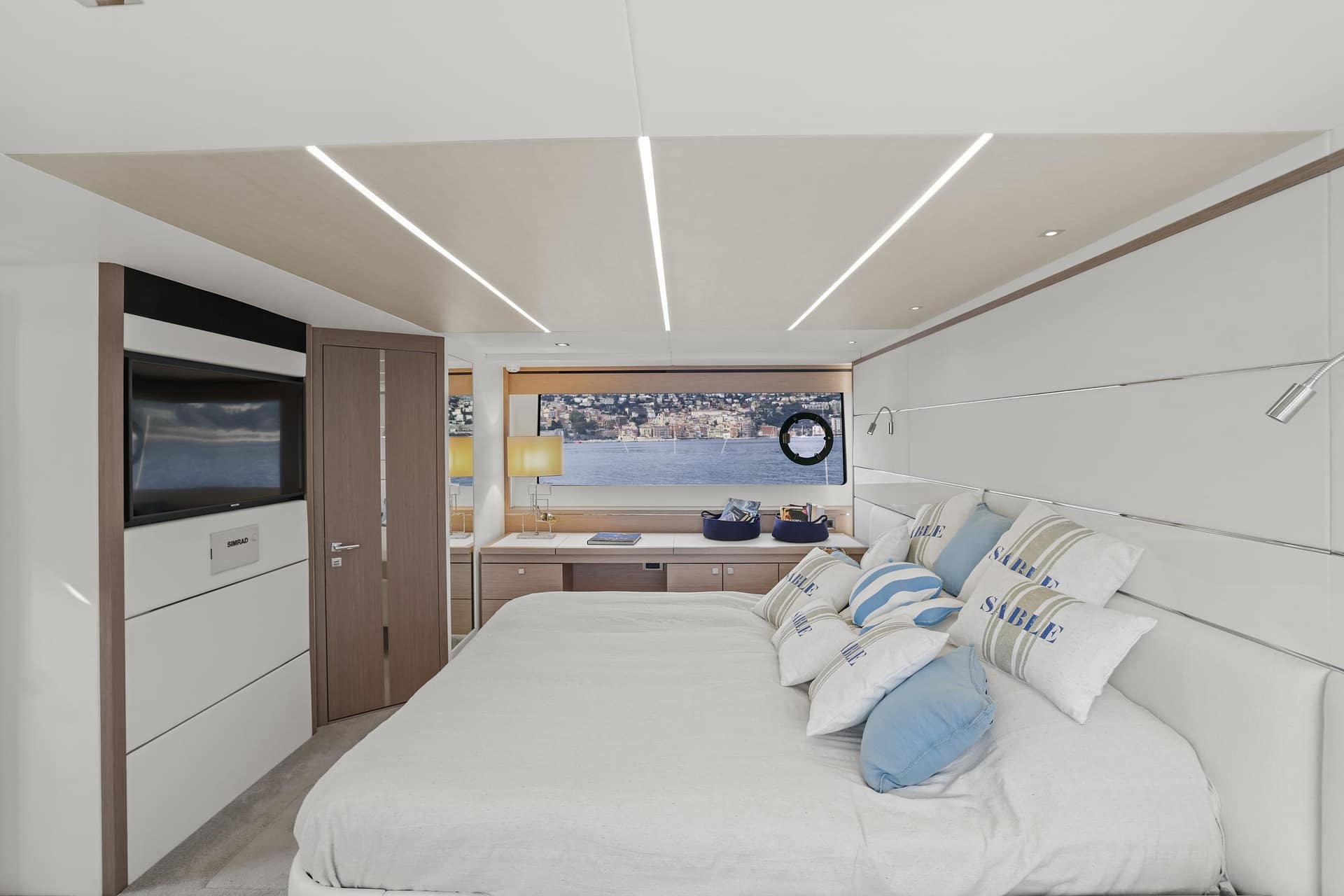 Designed for seamless indoor-outdoor living, her aft cockpit flows into the main salon through a drop-down patio door, creating a spacious and open environment. The main deck is ideal for socializing, featuring an expansive seating area and a generous sun pad for relaxation at sea.
