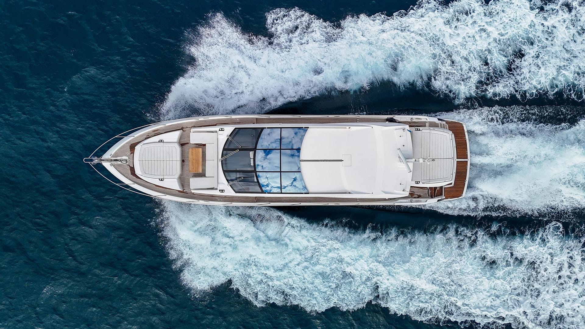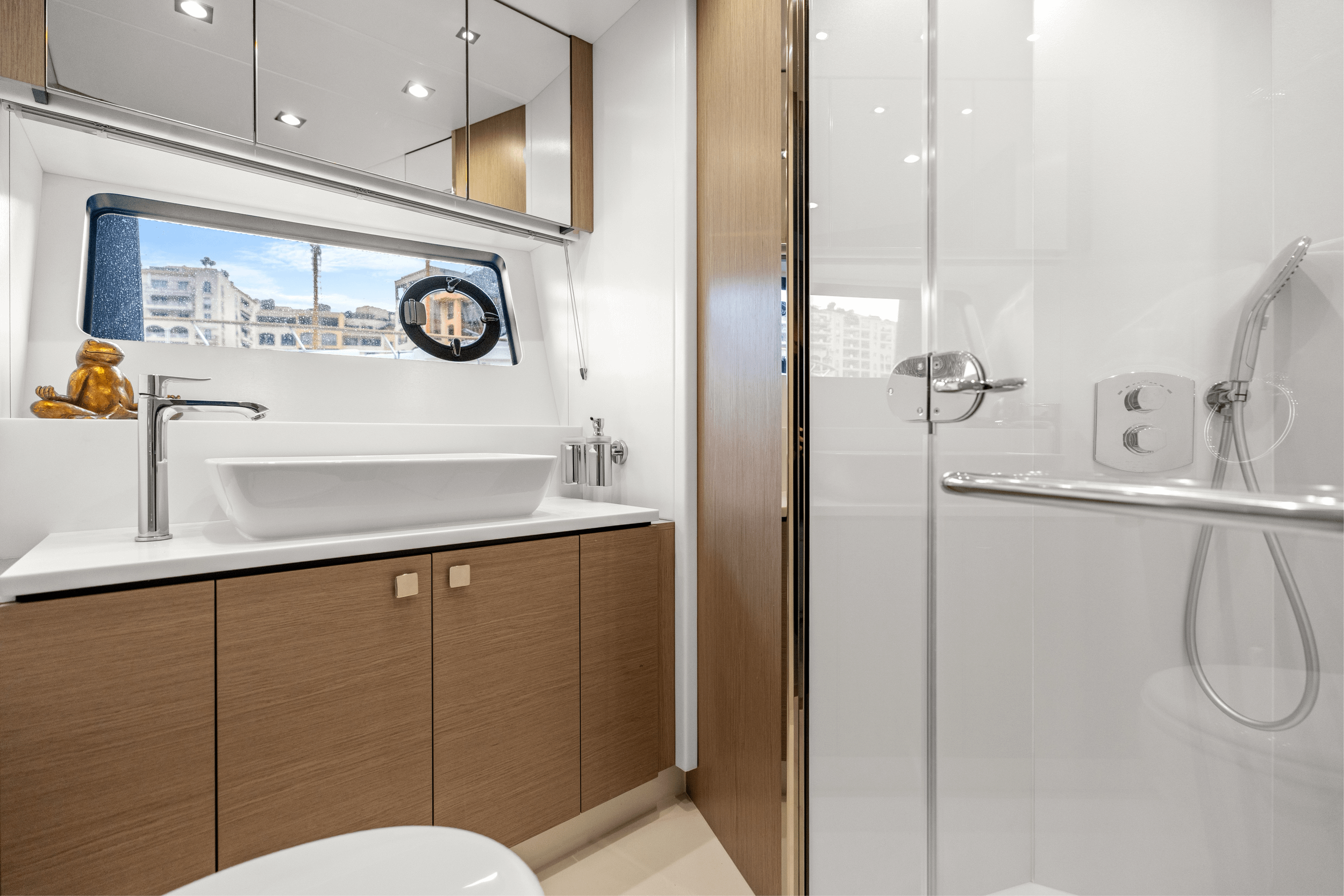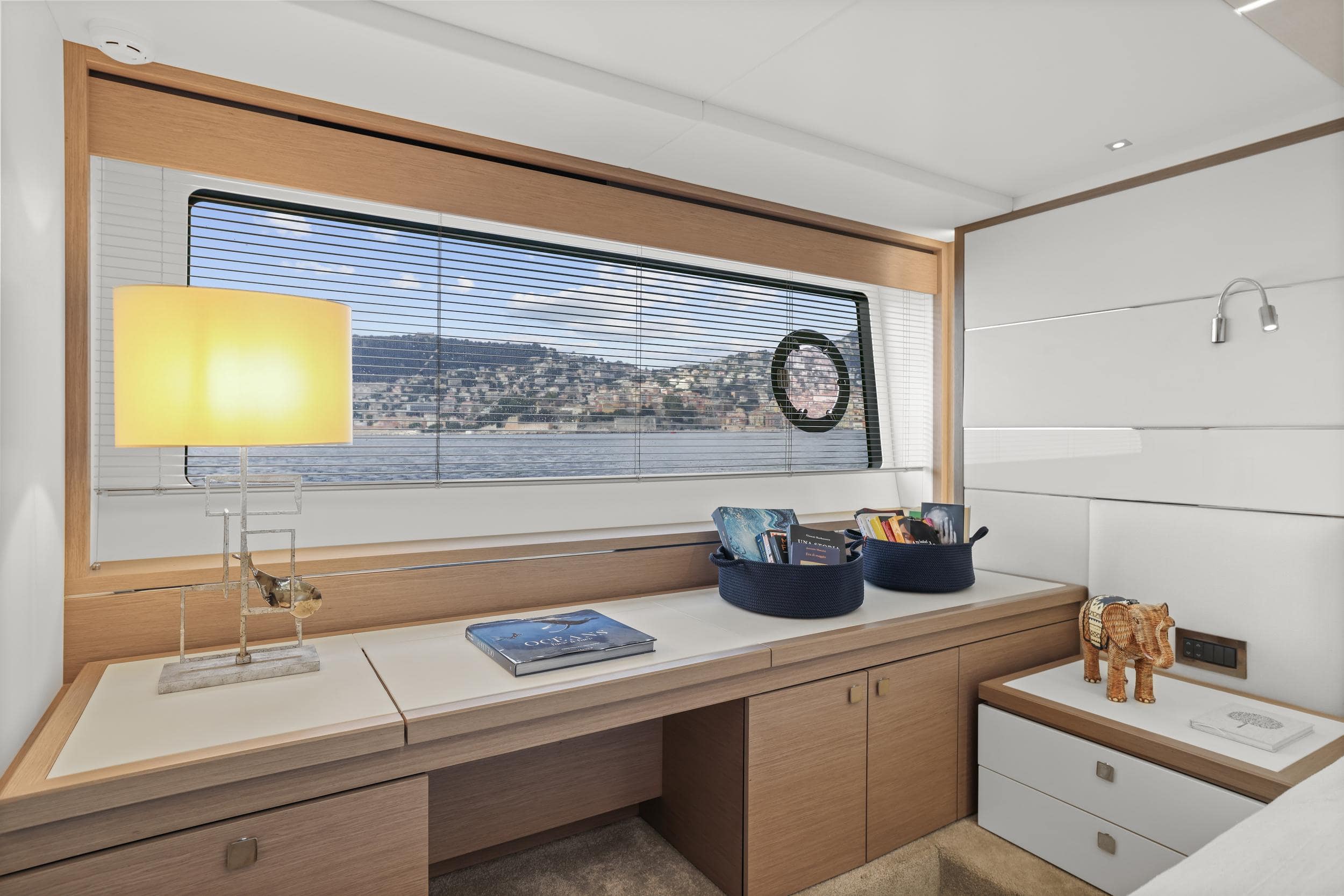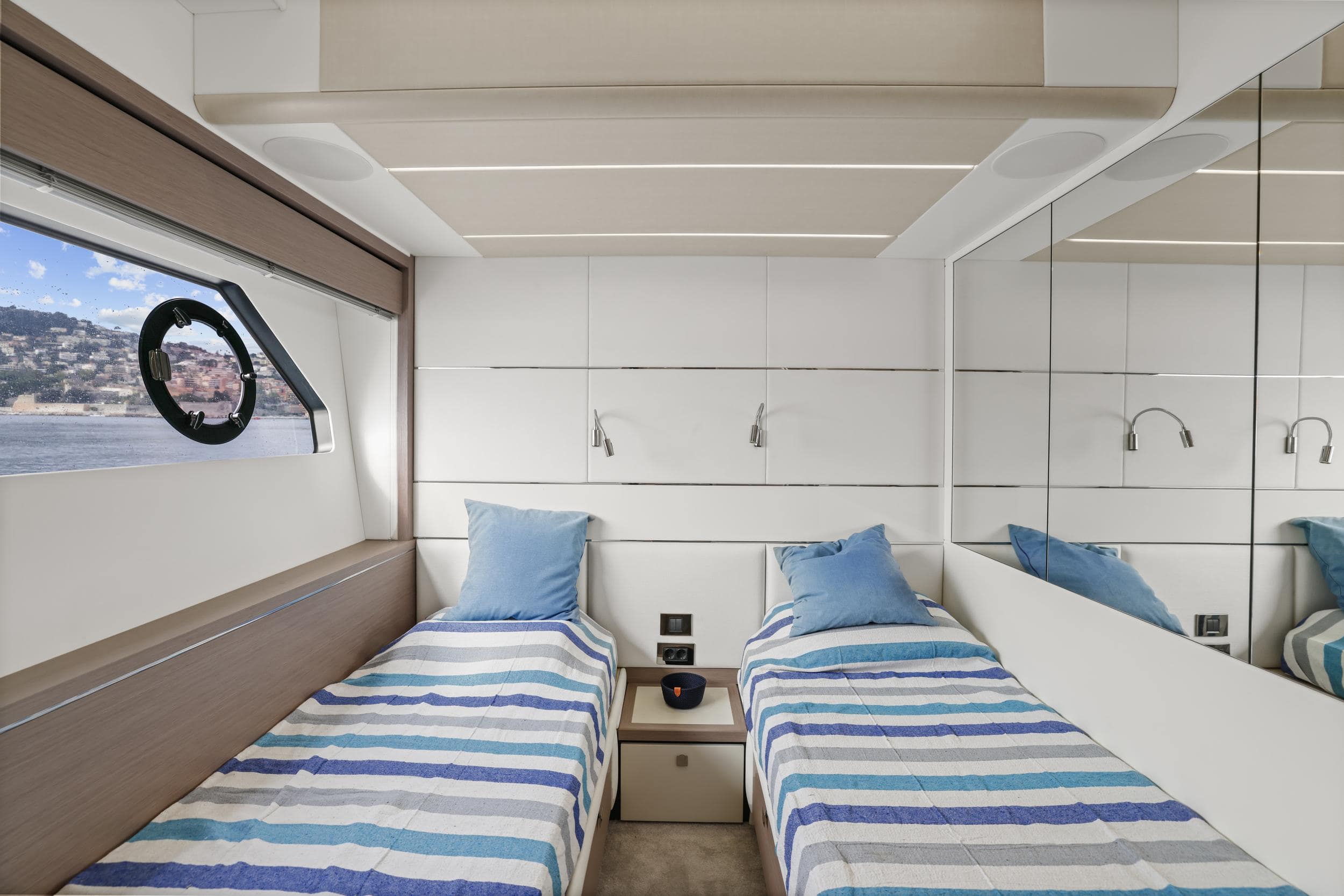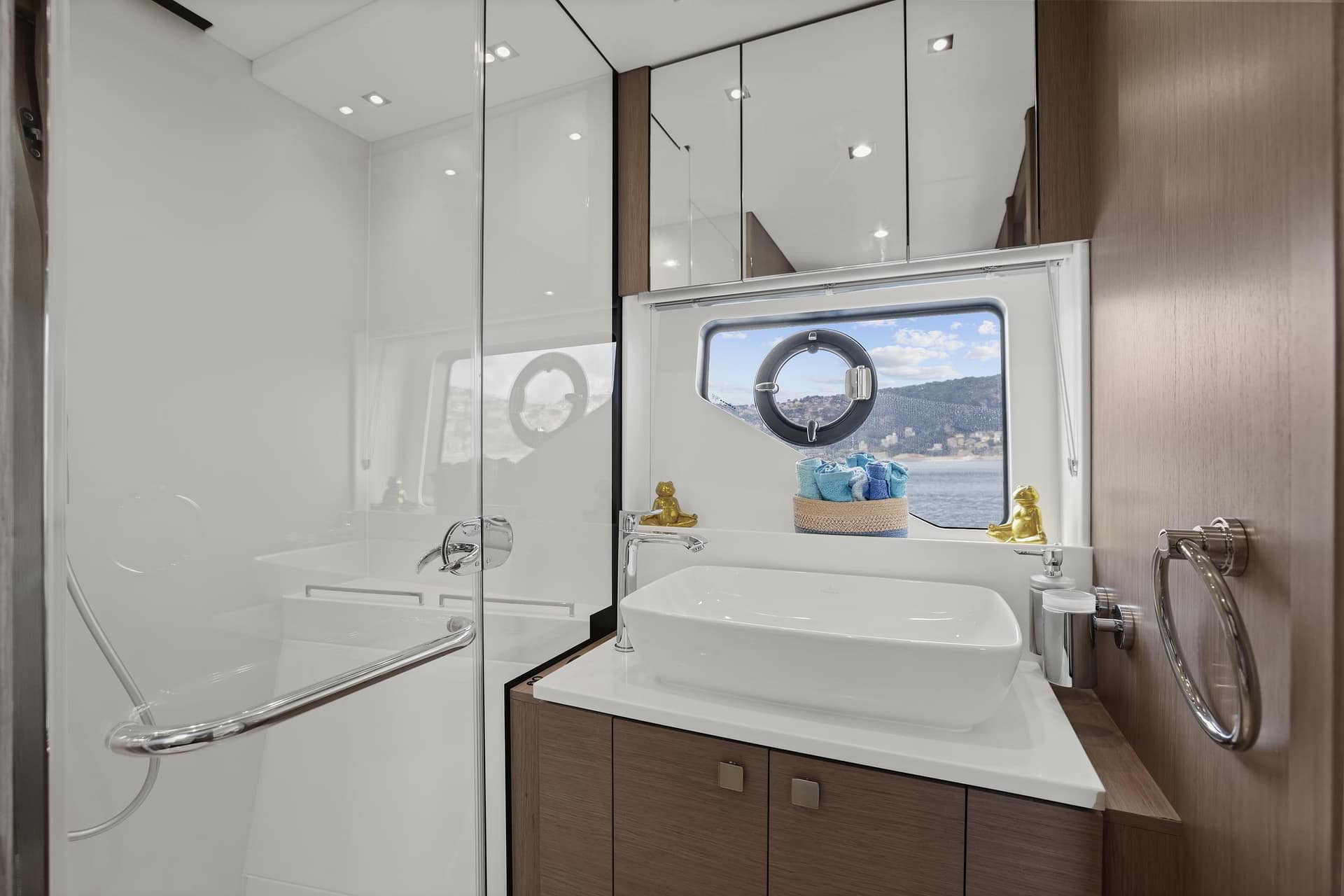 Designed for seamless indoor-outdoor living, her aft cockpit flows into the main salon through a drop-down patio door, creating a spacious and open environment. The main deck is ideal for socializing, featuring an expansive seating area and a generous sun pad for relaxation at sea.