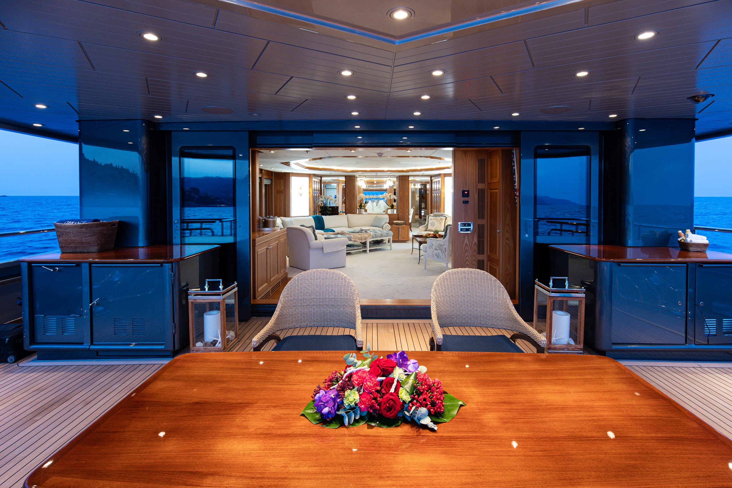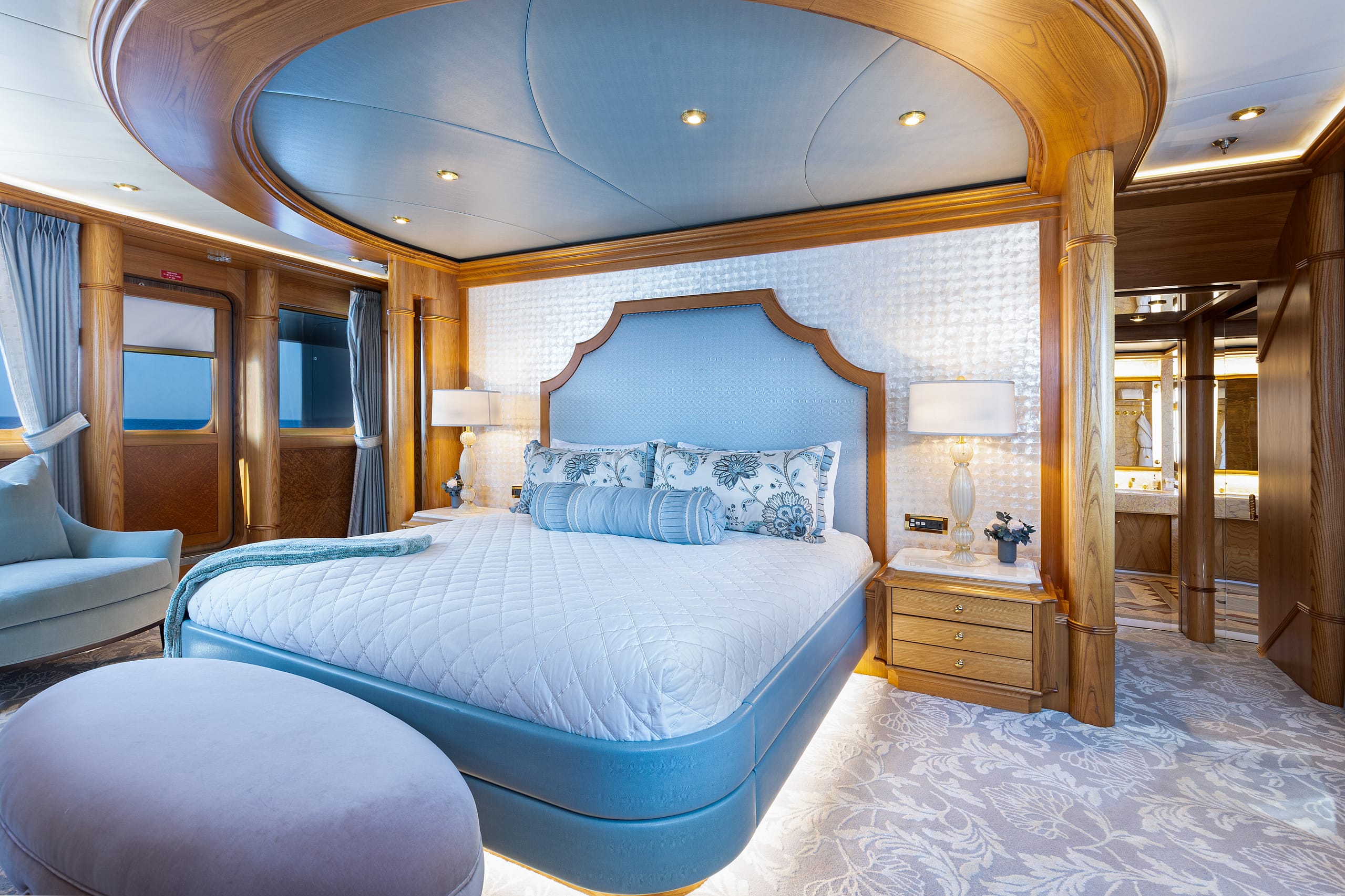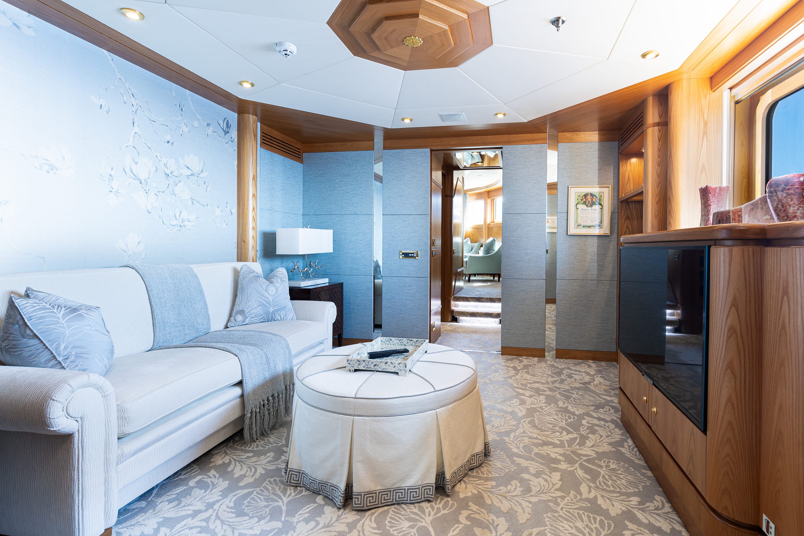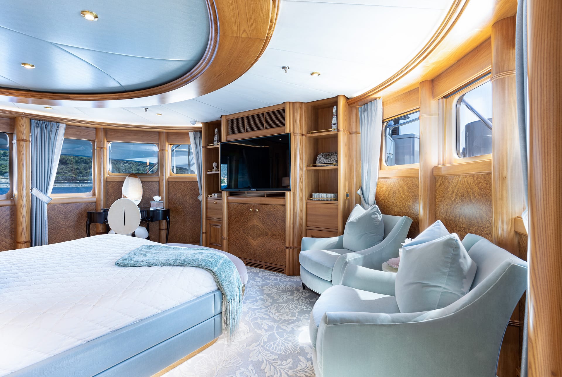 The spacious master cabin has its own private interior lounge and exterior seating via a private entrance. Tenders are stowed on the bridge deck mid-ship out of the way from guest spaces. With a full displacement hull and a large gross tonnage of 659 tonnes, she is extremely comfortable and quite underway.