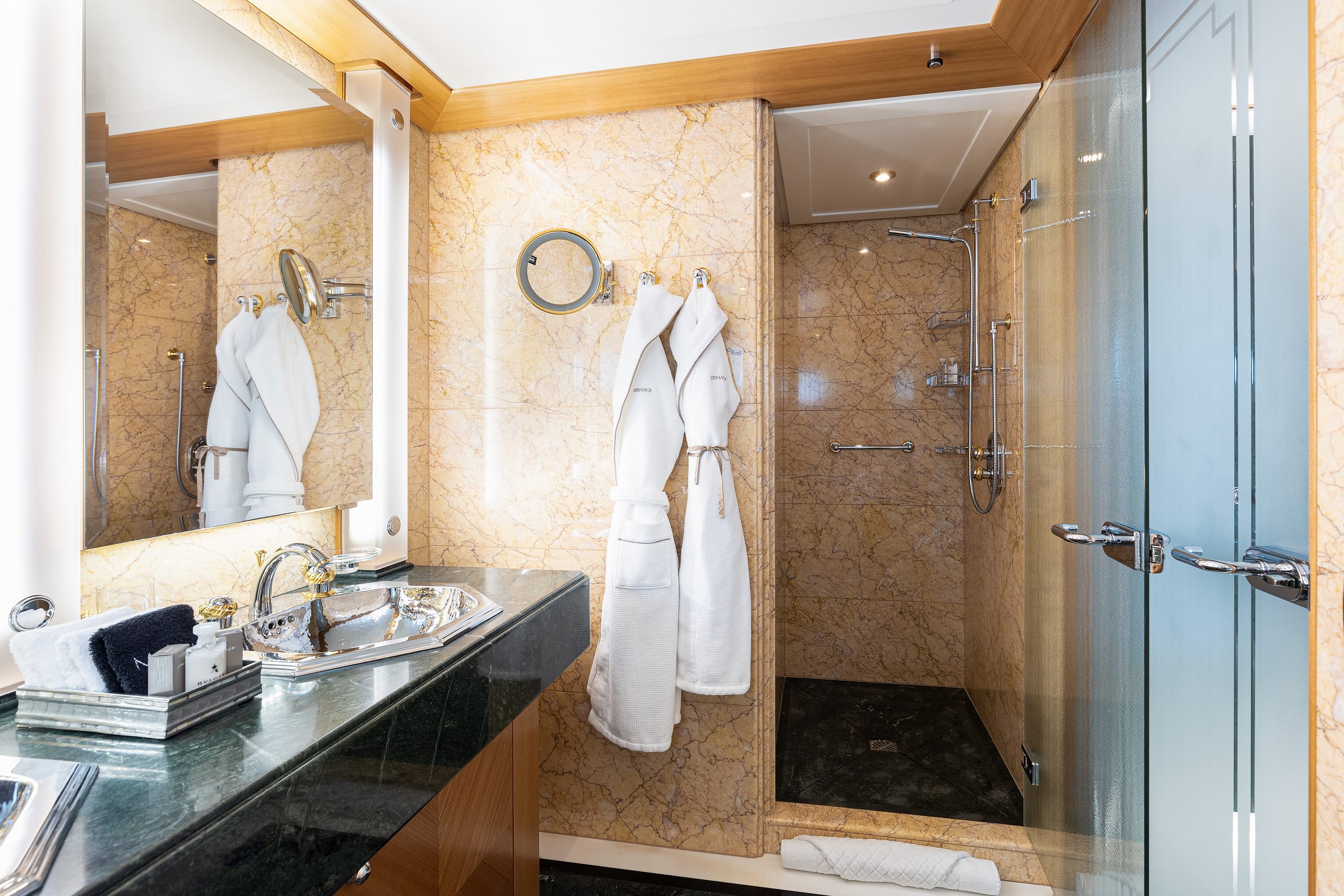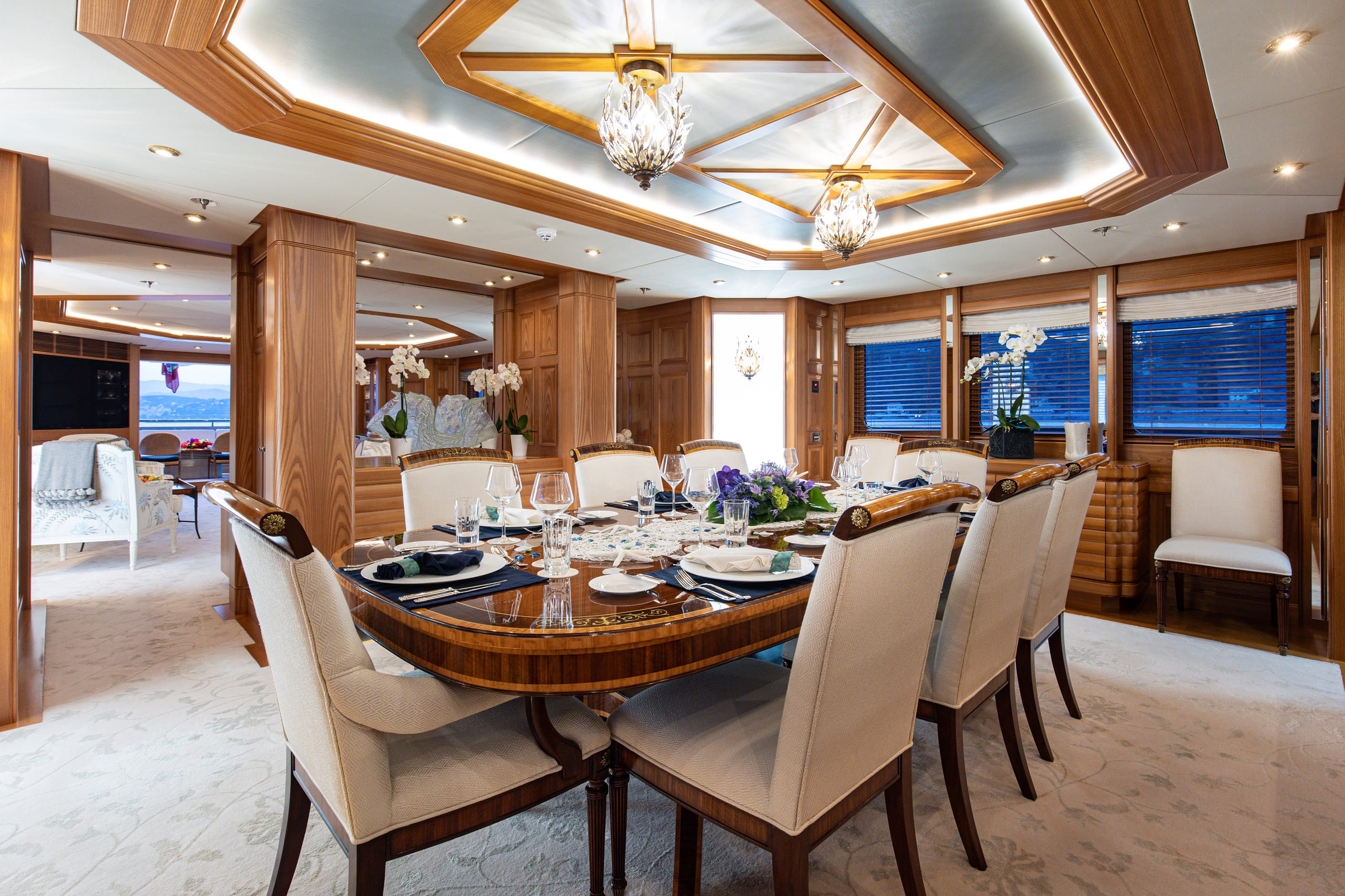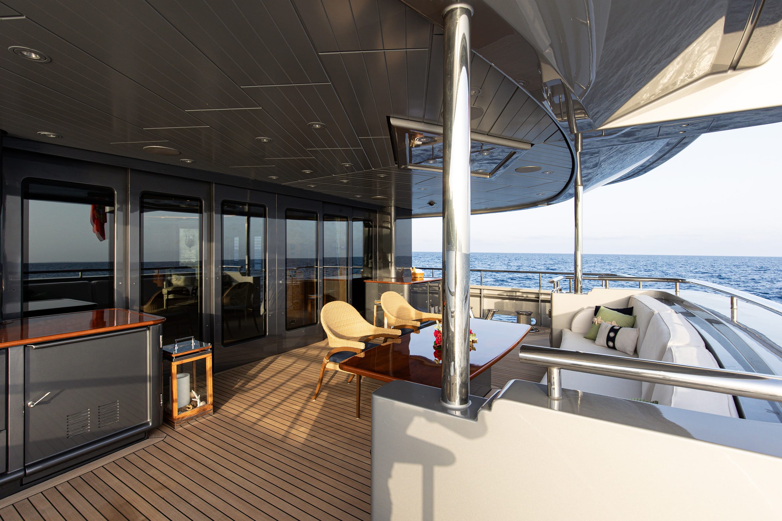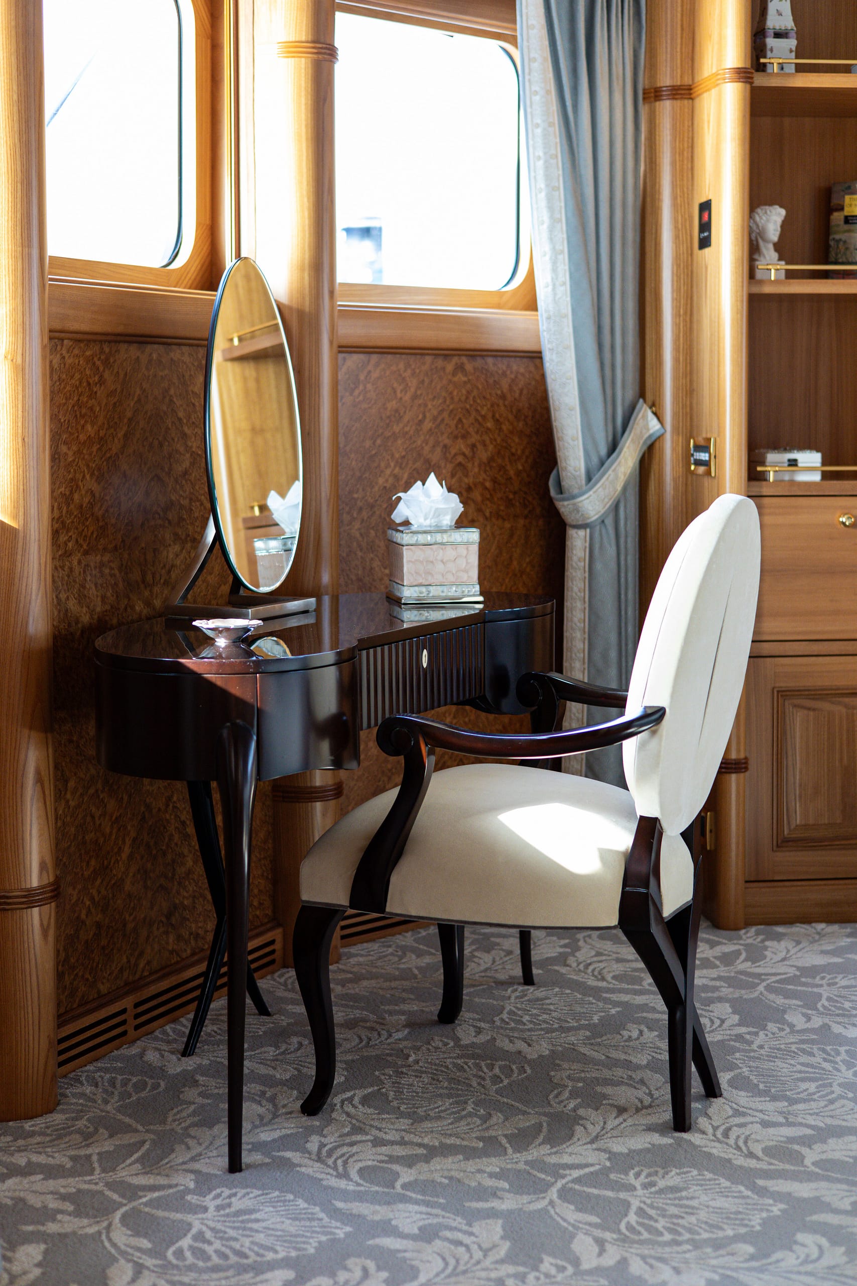 The spacious master cabin has its own private interior lounge and exterior seating via a private entrance. Tenders are stowed on the bridge deck mid-ship out of the way from guest spaces. With a full displacement hull and a large gross tonnage of 659 tonnes, she is extremely comfortable and quite underway.
