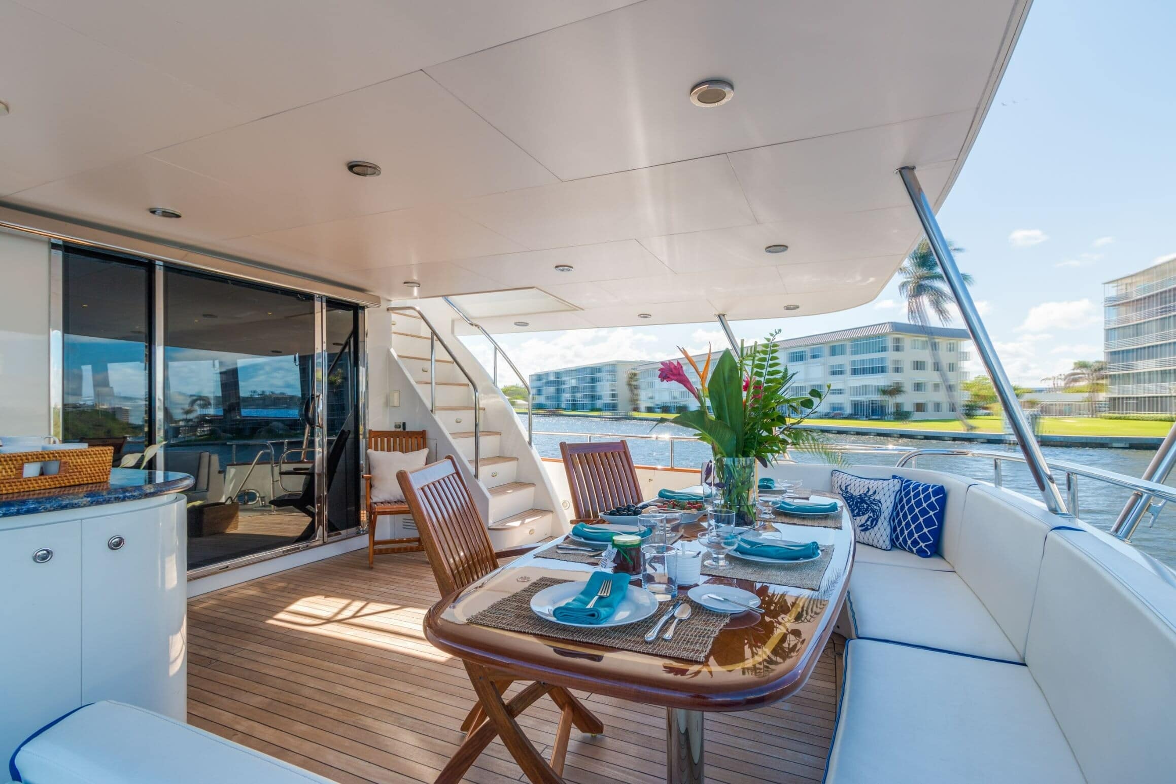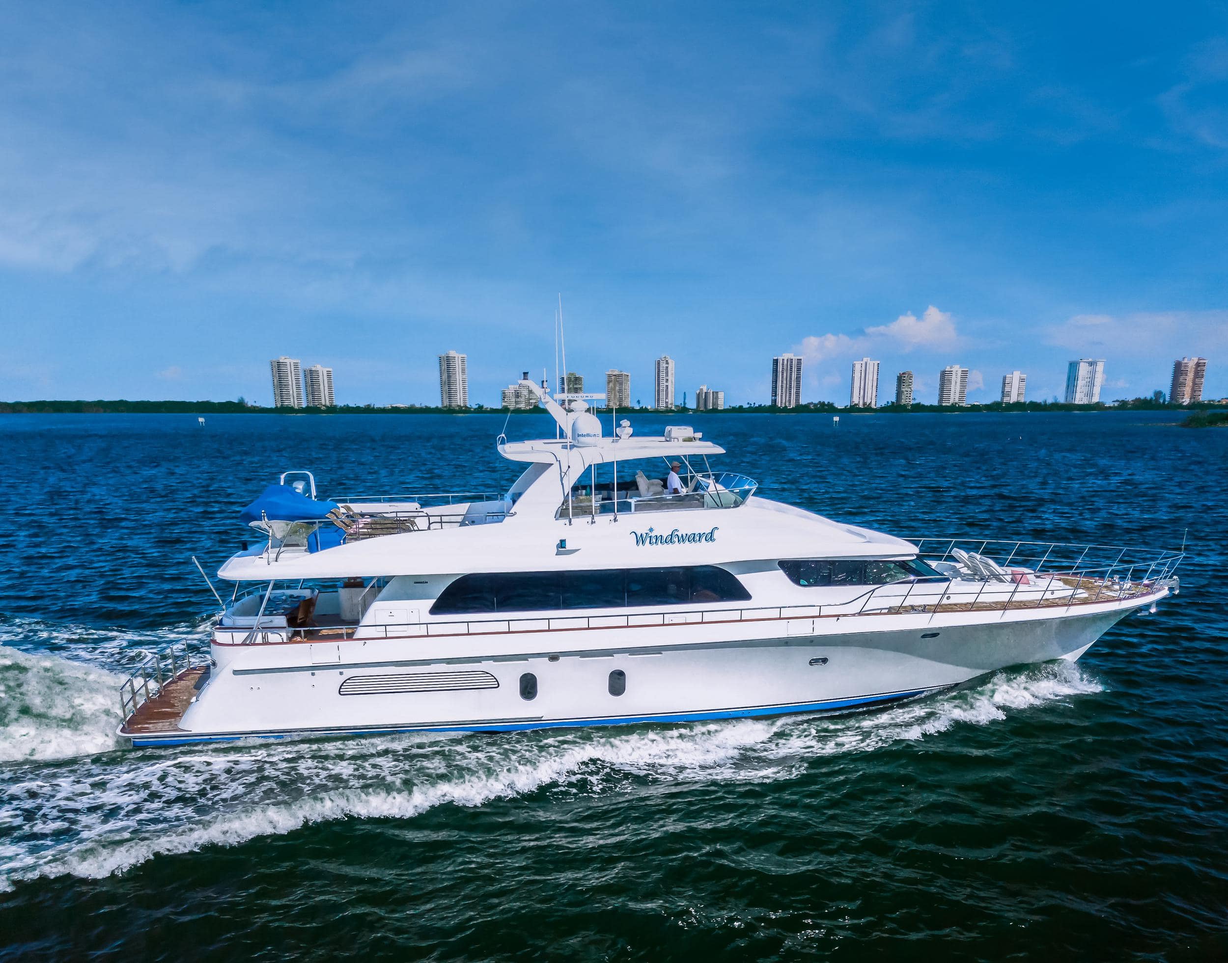With a shallow draft and fast cruising speeds upward of 20 knots thanks to Caterpillar power, WINDWARD is the perfect multi-use yacht! She features plenty of entertainment areas including al fresco dining on the aft deck for up to 8 guests, a wonderful and spacious flybridge complete with a second al fresco dining area, wet bar and BBQ area and lounge chairs, as well as a large, comfortable lounge area on the bow to enjoy the views as you arrive into the next port.