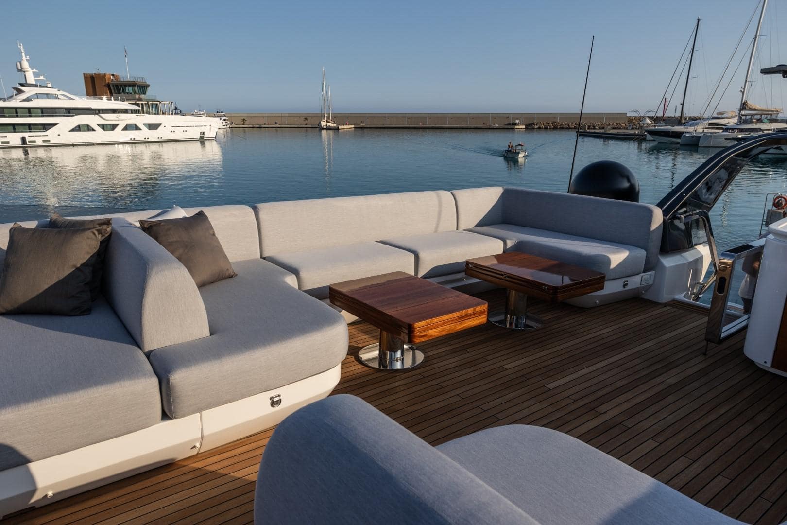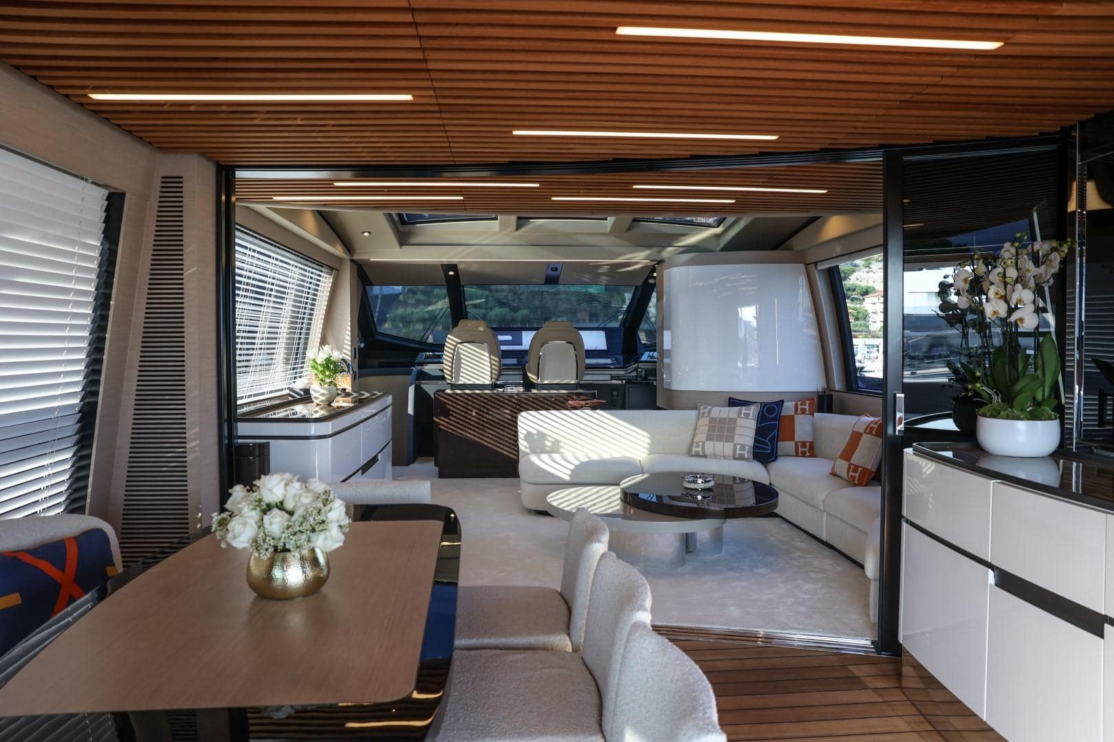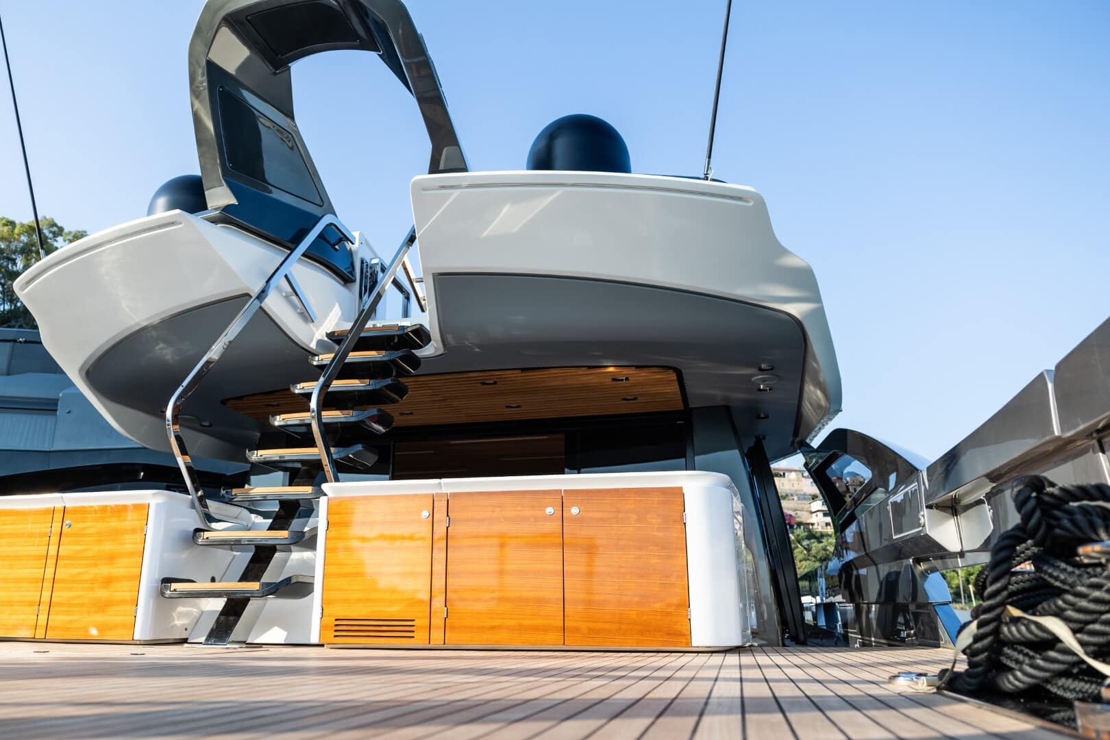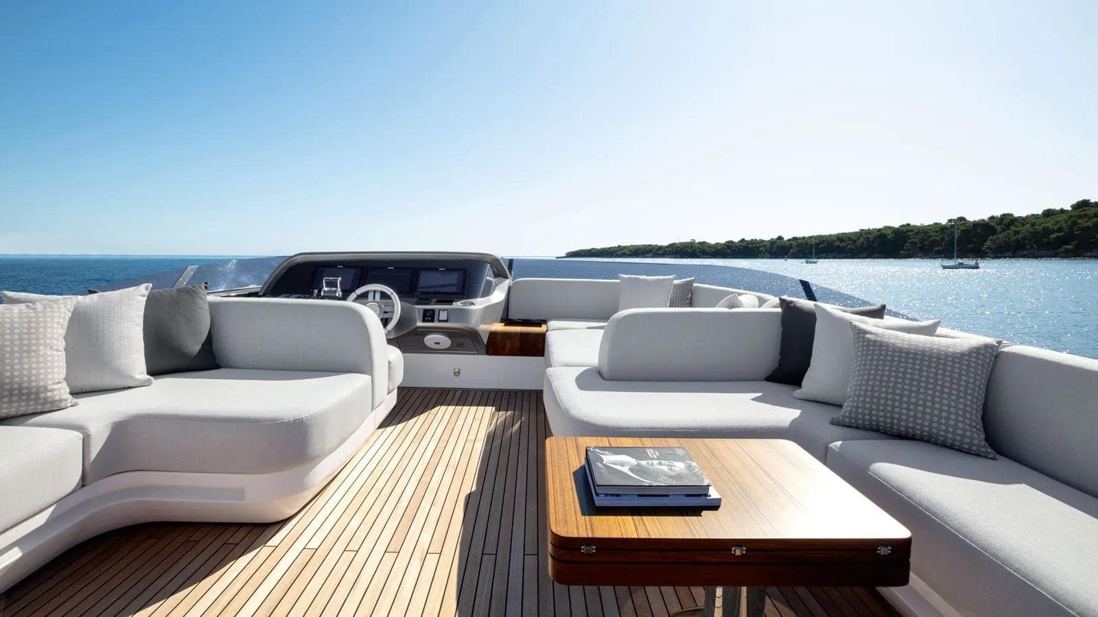 With an exterior design by Alberto Mancini, YB boasts modern and sleek lines that combine both elegance and performance. The expansive flybridge features a sunpad, seating space and bar, perfect for entertaining while enjoying ocean views.