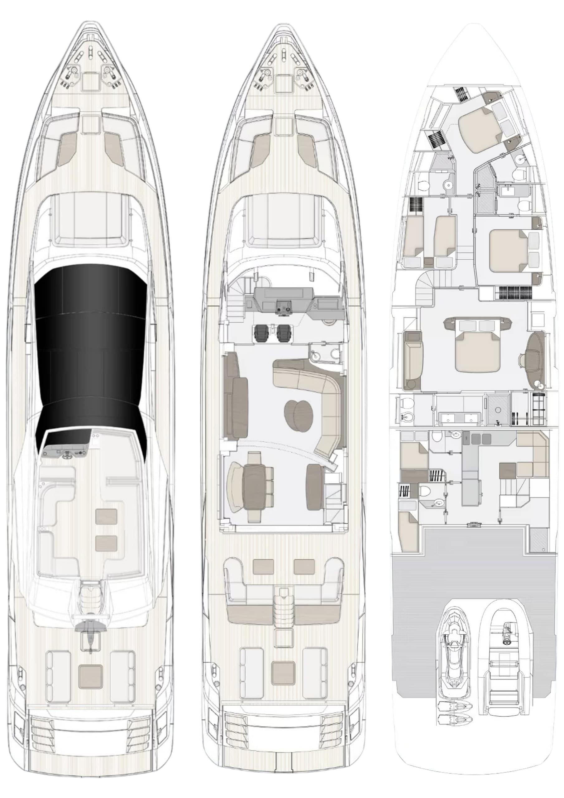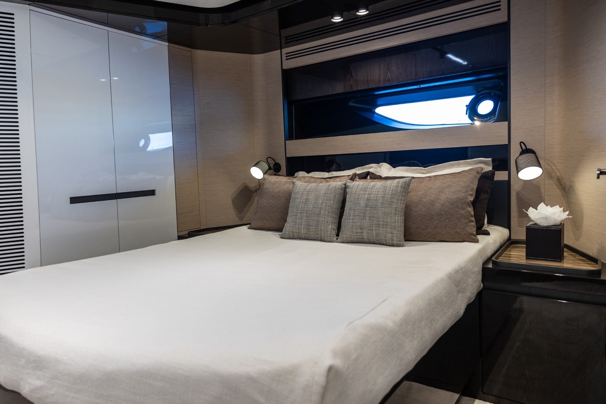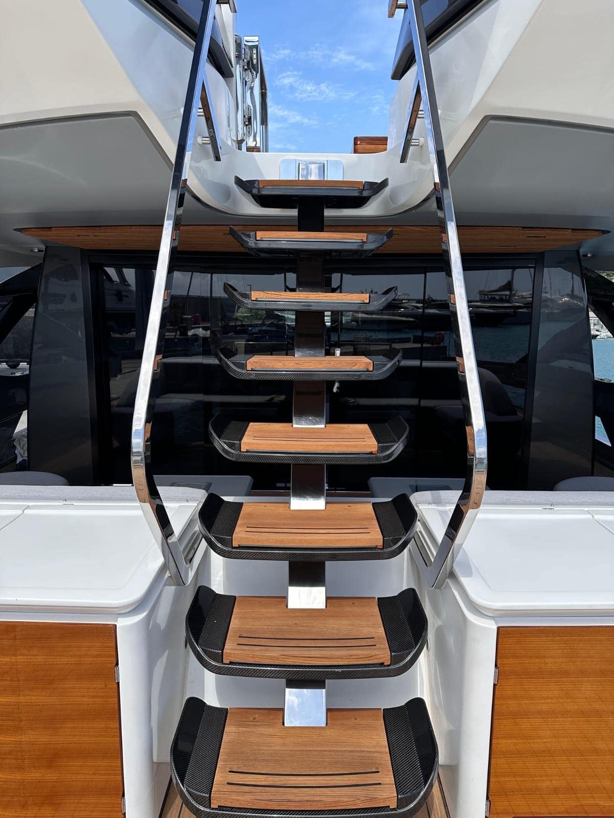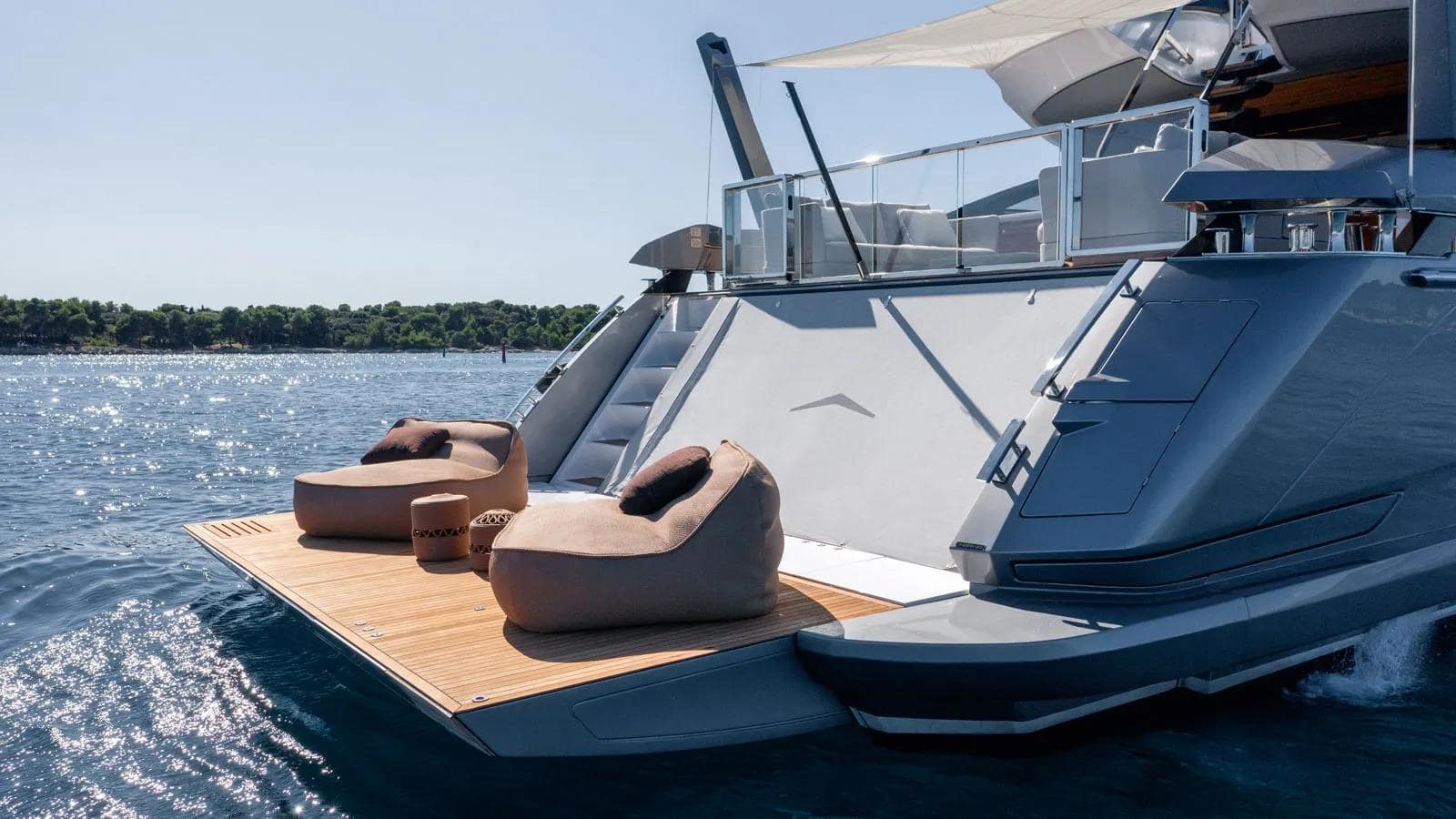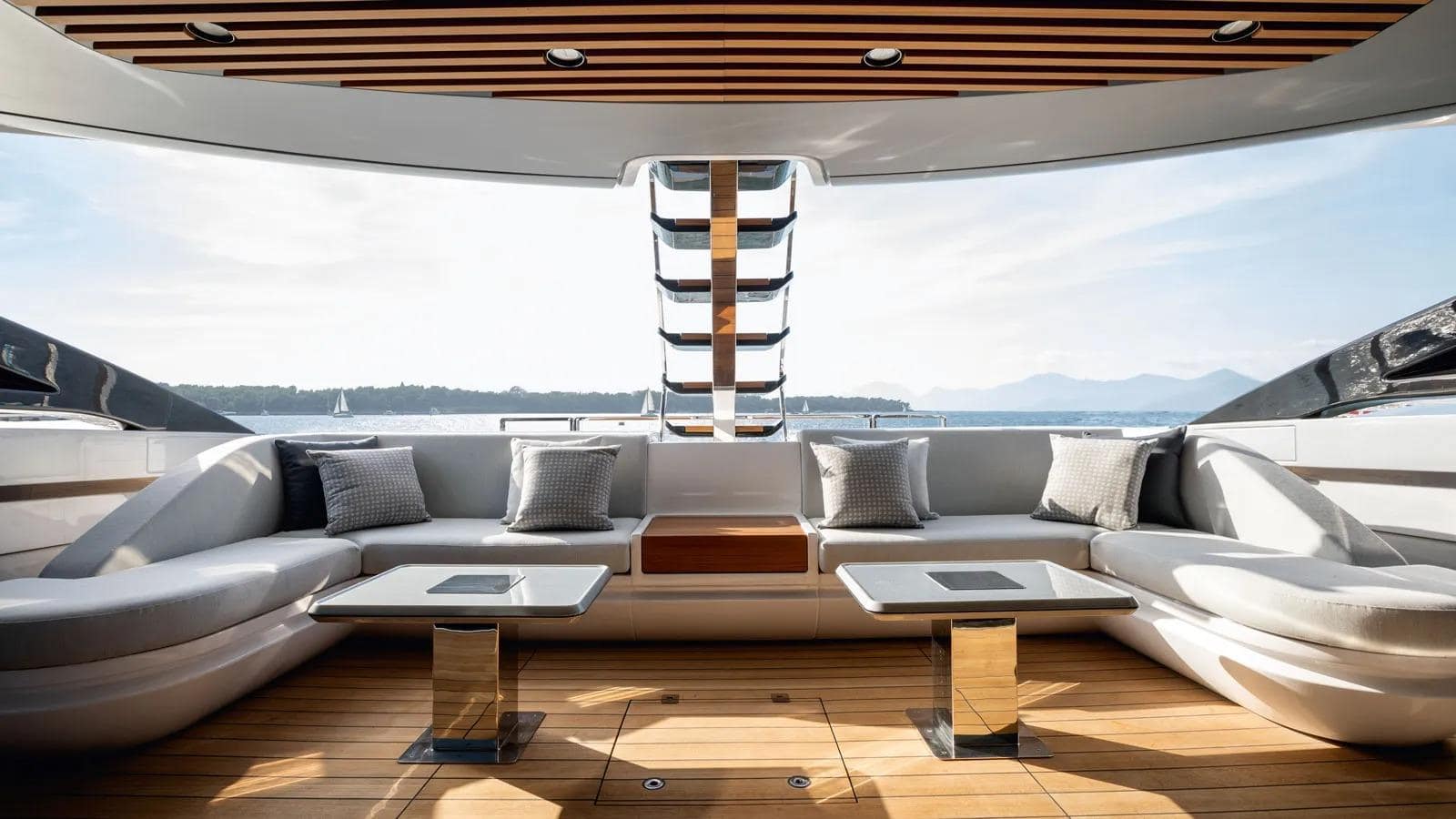 With an exterior design by Alberto Mancini, YB boasts modern and sleek lines that combine both elegance and performance. The expansive flybridge features a sunpad, seating space and bar, perfect for entertaining while enjoying ocean views.