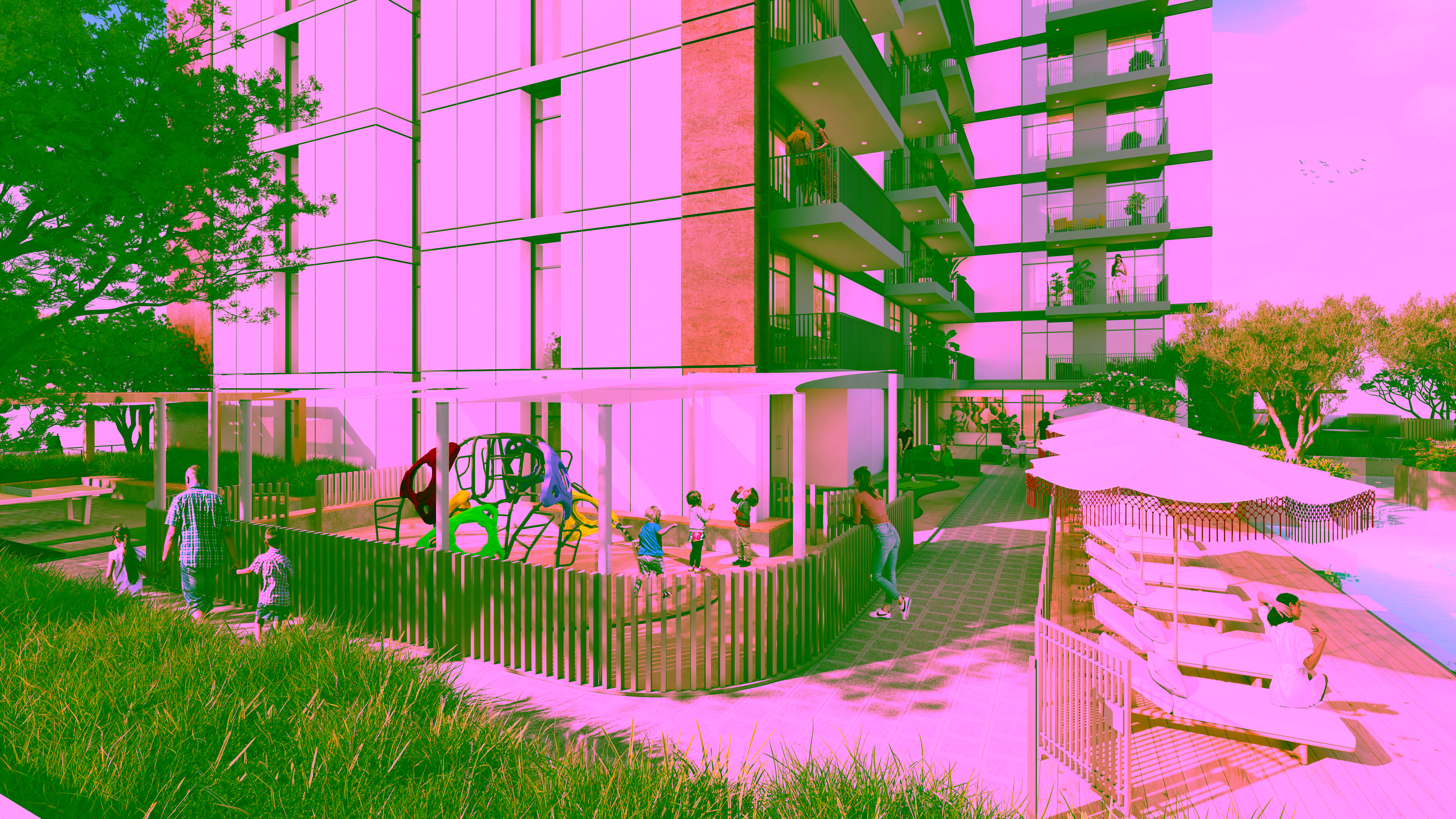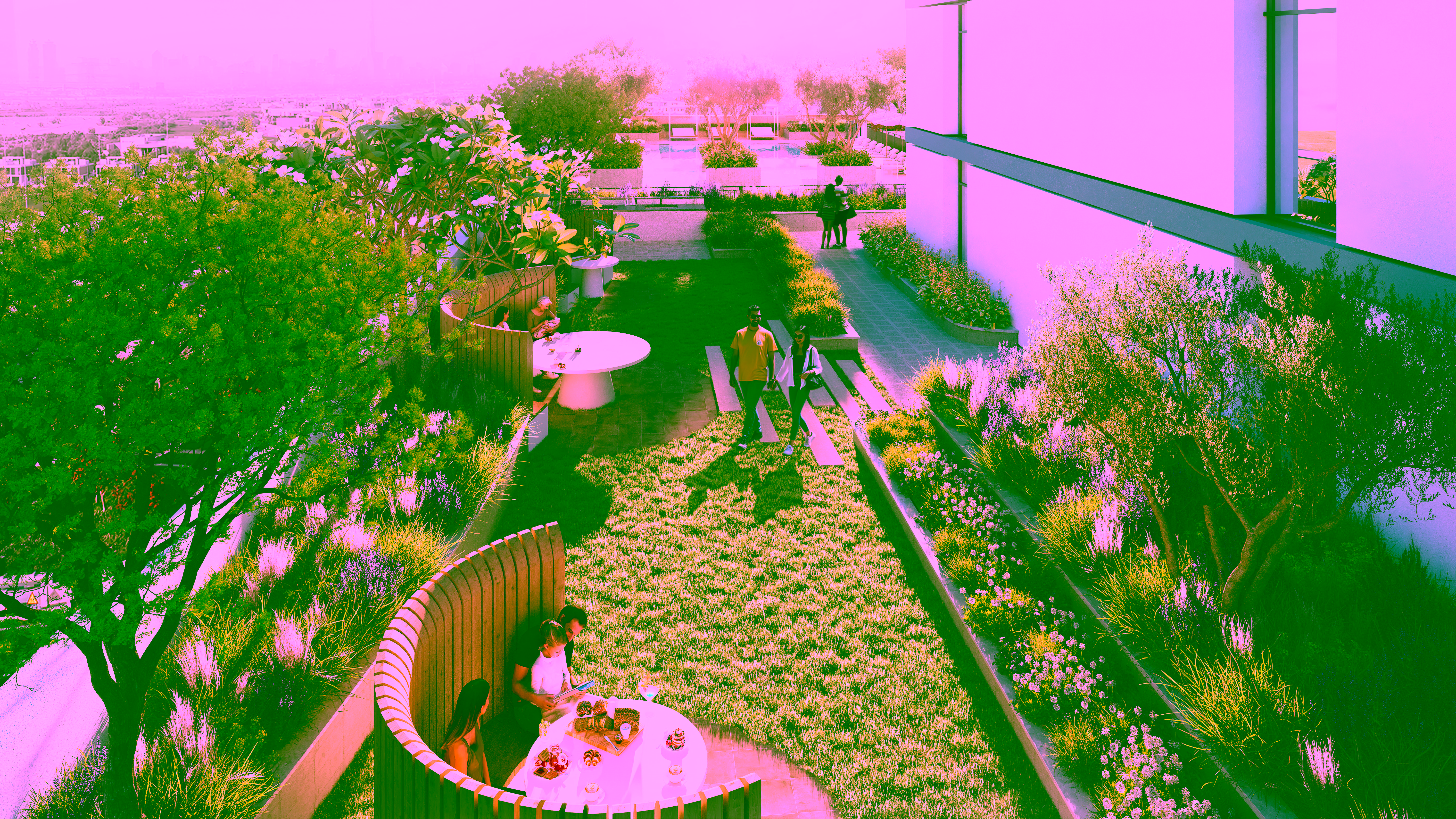 Communal spaces extend to include a mini-golf course, a treehouse, an urban farm, and themed dining spots like Bella Napoli Pizzeria and Smoke House BBQ. Wellness and entertainment are seamlessly integrated, with a pet daycare, Como Lounge Café, Himalayan Tea House, outdoor cinema, and shaded seating zones. Main lobby co-working spaces are designed for comfort and productivity with natural light and ergonomic seating.