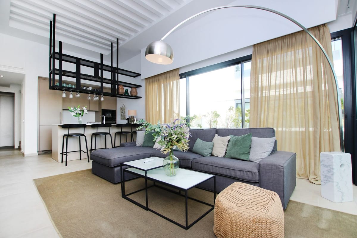 This stunning penthouse offers a blend of elegance and sophistication, boasting 111 square meters of meticulously designed living space within a prestigious, secure gated community. Upon entering, you are greeted by an expansive open-concept living area that seamlessly blends modern comfort with timeless style. Floor-to-ceiling windows frame breathtaking views of the surrounding landscape, creating a light-filled ambiance that highlights the penthouse’s refined details.
