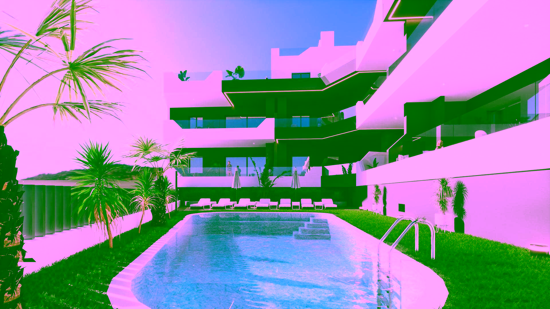 New Build residential complex has a large green area with a swimming pool.