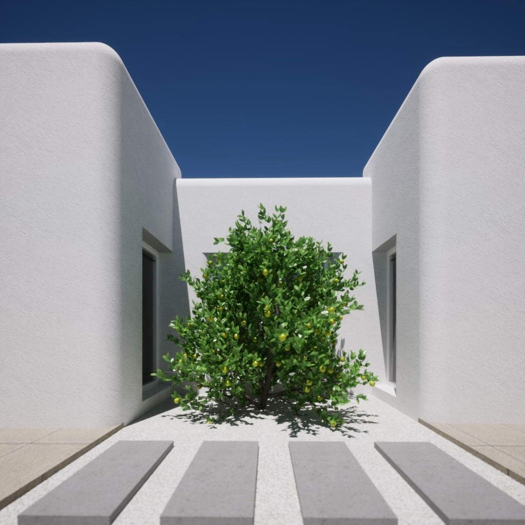 The Ibiza house is integrated into the plot, creating its own characteristic spaces that start from the interior and project to an exterior where plants are strategically placed in the trajectory of every interior window, and in combination with other elements such as different types of pavement and gravel, and perimeter wall materials (landscape project).