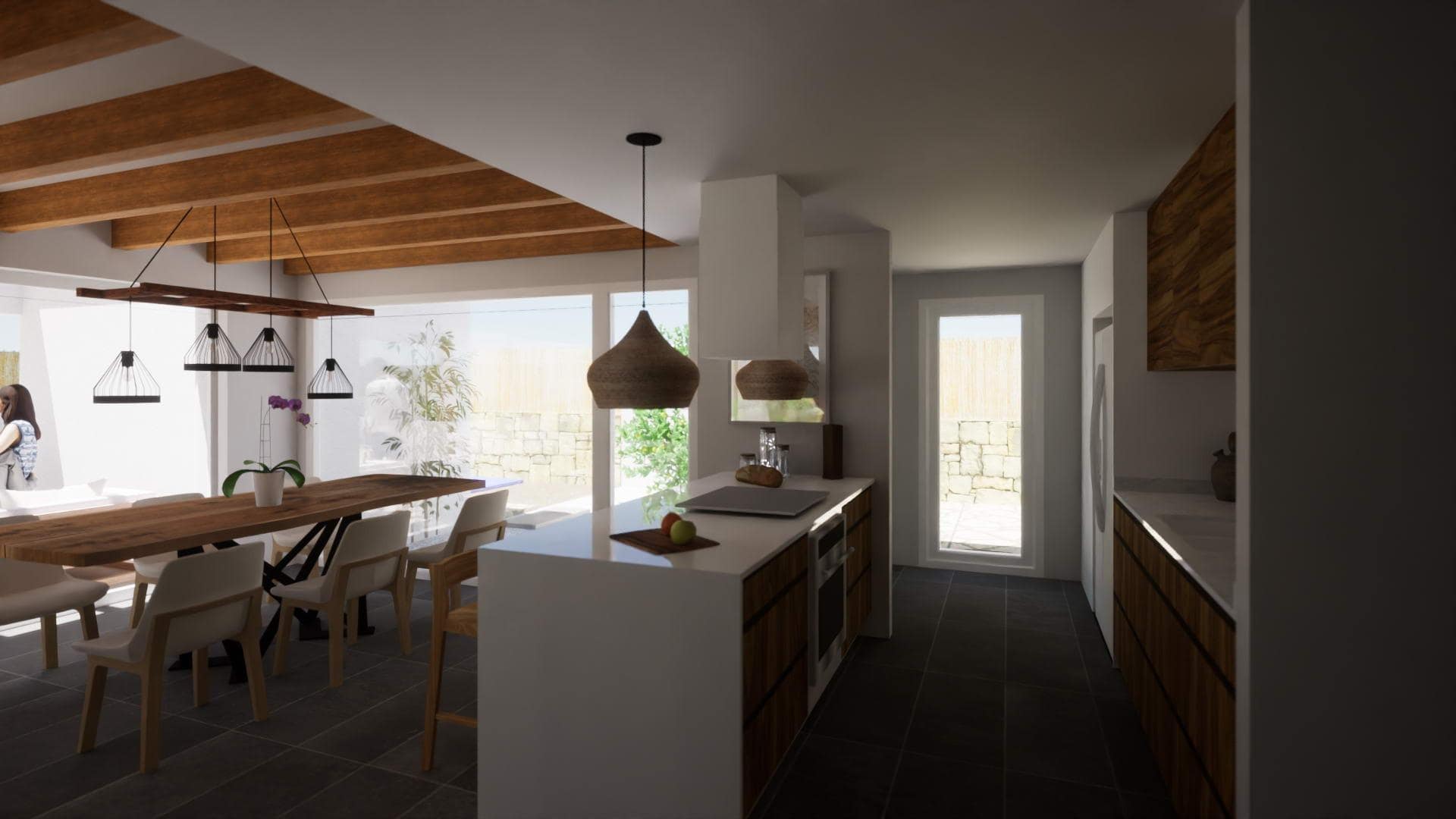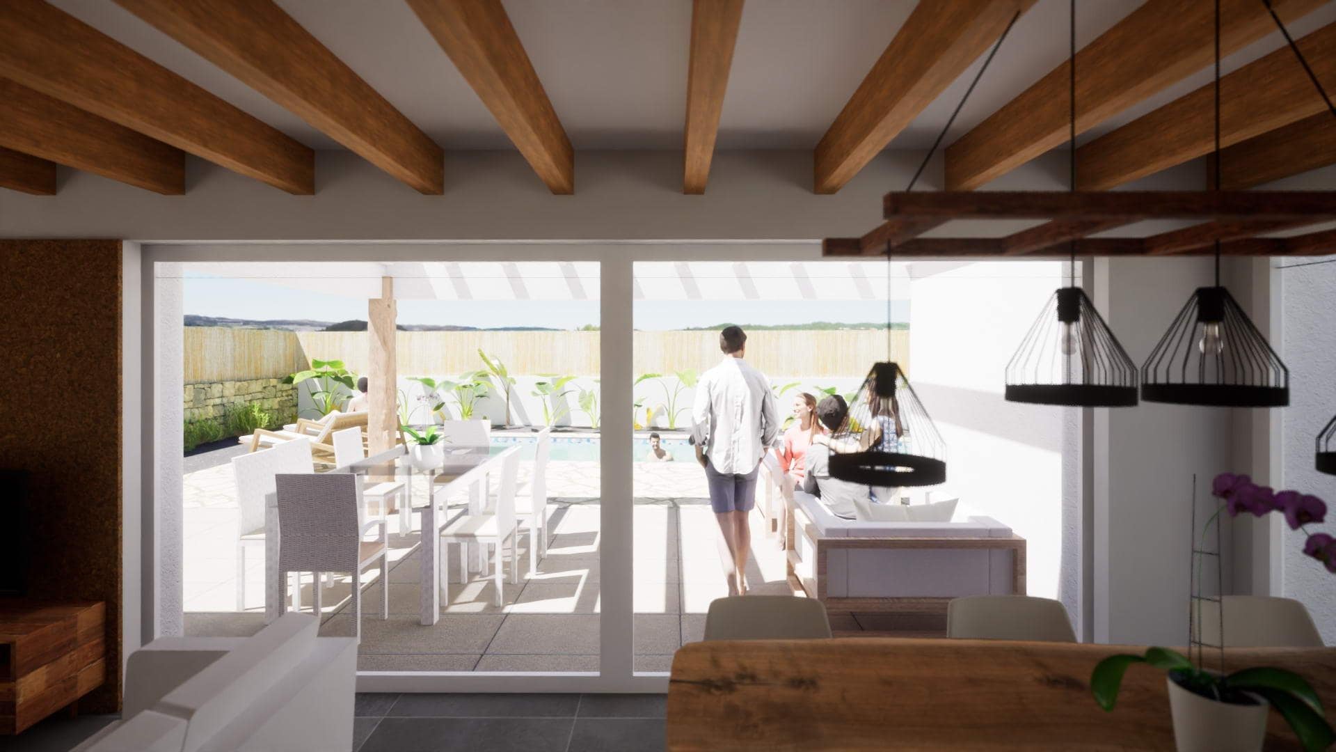Living room with an open kitchen, a wonderful large sliding window that gets hidden in the cavity of the wall, faking a seamless transition from indoor to outdoor, with a pérgola as buffer space in between the pool terrace, an area for maximum outdoor enjoyment.