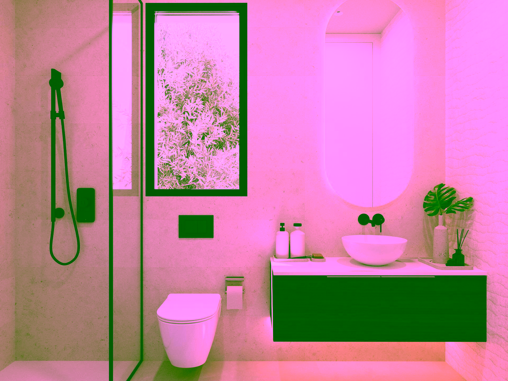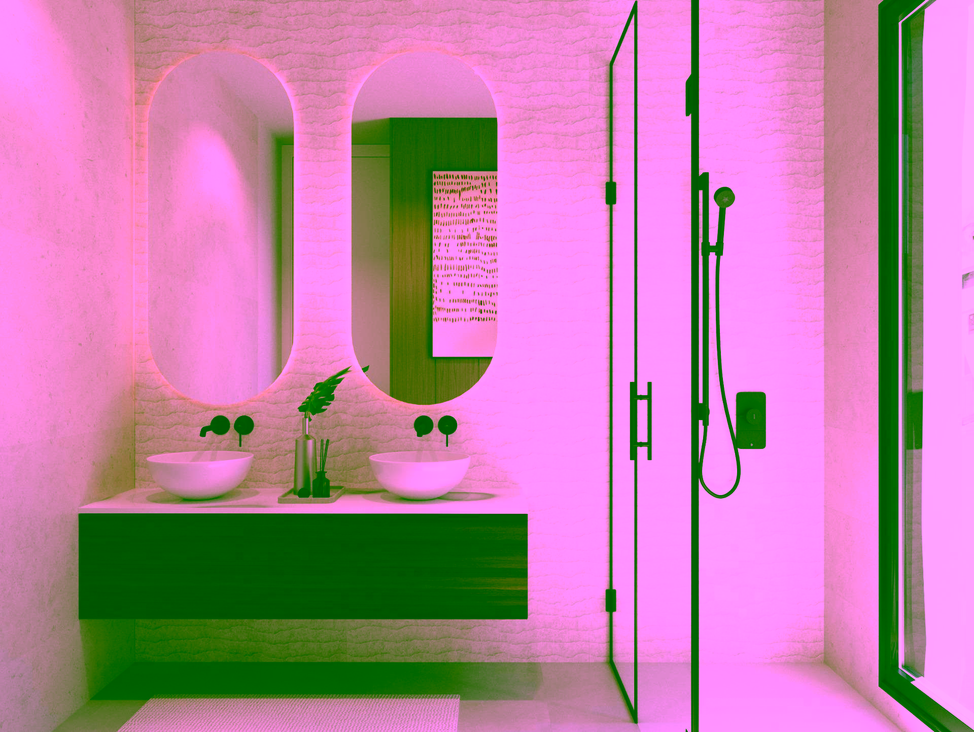Fully equipped bathrooms with furniture, mirrors, and walk-in showers with screens